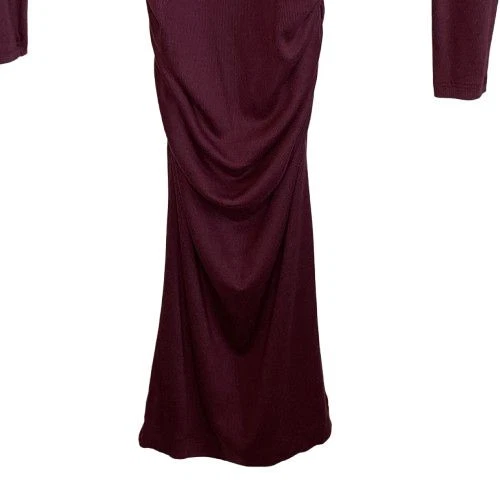 New With Tags Elevate your evening look with this stunning burgundy bodycon dress. Perfect for cocktail parties, date nights, or formal events. The ruched design flatters your curves, while the rich color exudes sophistication. Pair with statement jewelry and heels for a head-turning ensemble that's sure to impress. Pullover style Square neckline Long sleeves Fitted Ruched Midi length Left side slit Soft, comfy tee shirt feel Stretch Made in USA Original retail - $108 48% cotton, 48% modal, 4% spandex Machine washable Style profile - date night, cocktail party, evening, night out, flirty Approximate flat lay measurements: Shoulder to bottom hem length - 46" Pit to pit width - 14" Please compare measurements to something you already own to verify size and fit We are happy to answer any questions! We ship the next business day!