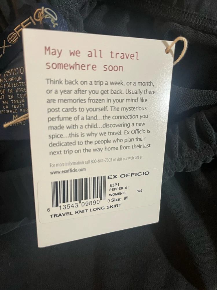 New with tags Ex Officio Travel knit collection long skirt in a size medium. Length 38.5 in Waist 28 in Crafted for the active traveler, the ExOfficio Travel Knit Collection Long Skirt offers a sleek and versatile addition to your wardrobe. The charcoal gray medium skirt is perfect for a range of occasions, from casual outings to workwear, and it's designed to accompany you on any journey. Its high-rise waist and lightweight, stretchy fabric ensure comfort and ease of movement, making it an ideal choice for those long days on the go.ExOfficio is known for quality and durability, and this skirt is no exception, made from a blend of rayon and polyester. The solid pattern keeps it classic and easy to pair with other pieces. Practicality is a key feature with this garment, as it's machine washable and woven to withstand the rigors of travel. Whether you're out for a casual walk or heading to the office, this skirt's timeless style and functionality make it a staple for any season.