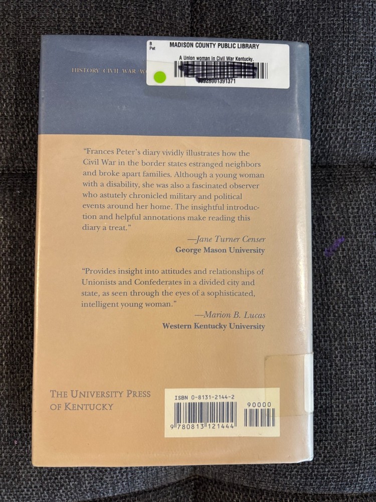 "A Union Woman in Civil War Kentucky: The Diary of Frances Peter" is an ex-library copy of a textbook published by the University Press of Kentucky in 2000. The book, authored by Frances Dallam Peter, delves into the history and military aspects of the Civil War period in the United States, specifically focusing on women's experiences during this time. With 258 pages, this hardcover book provides a unique perspective on the Civil War through the eyes of a Union woman in Kentucky.