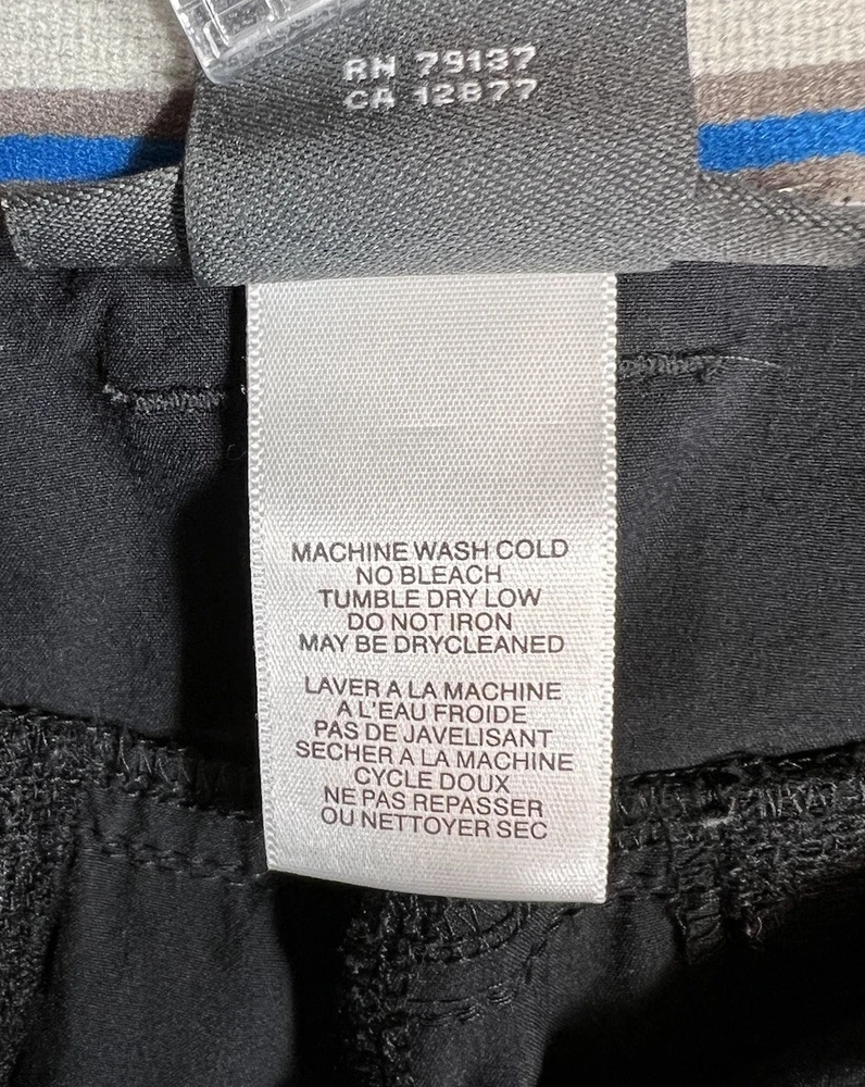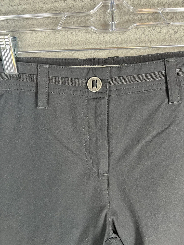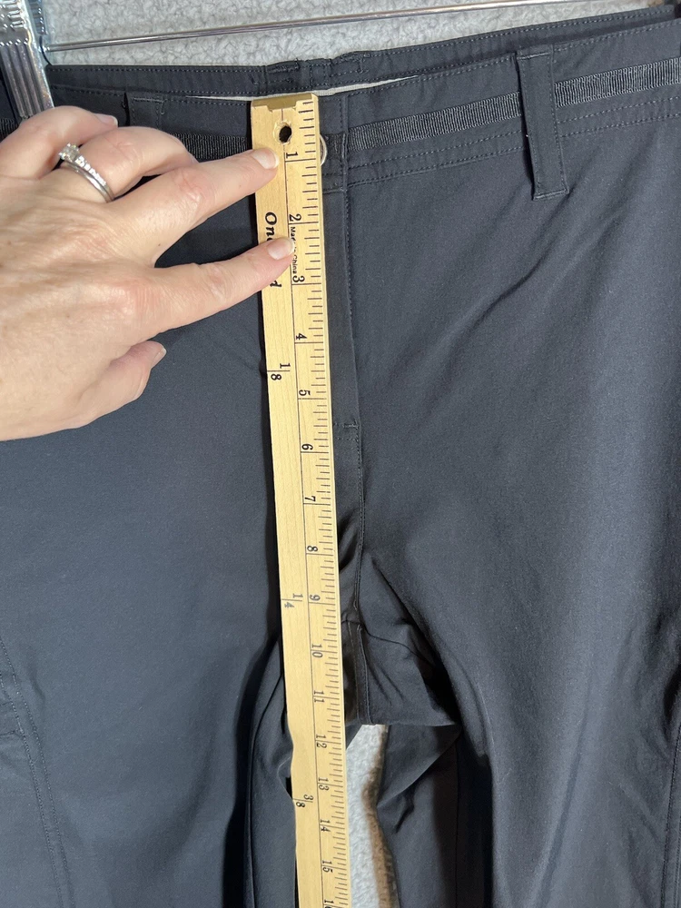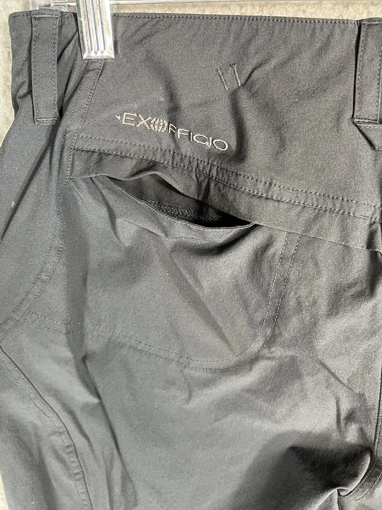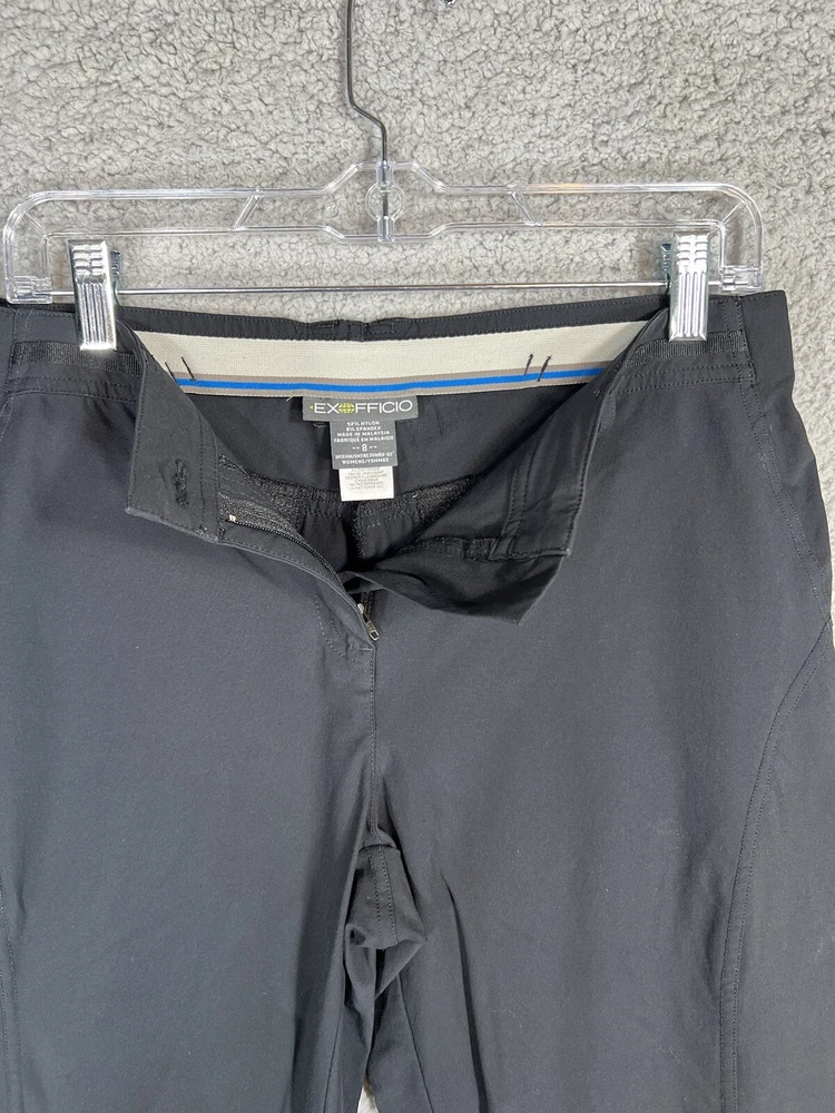 ExOfficio Black Nylon Golf Hiking Cargo Pants. Women's Size 8. Zipper and button closure with elastic waist and beltloops. These pants have 3 pockets with zipper closures (2 back and 1 cargo). Nylon/Spandex blend material. Excellent pre-owned condition. A pproximate measurements: Waist: 16 inches flat Rise: 10.5 inches Inseam: 31.5 inches Please see measurements as all brands can vary in size.