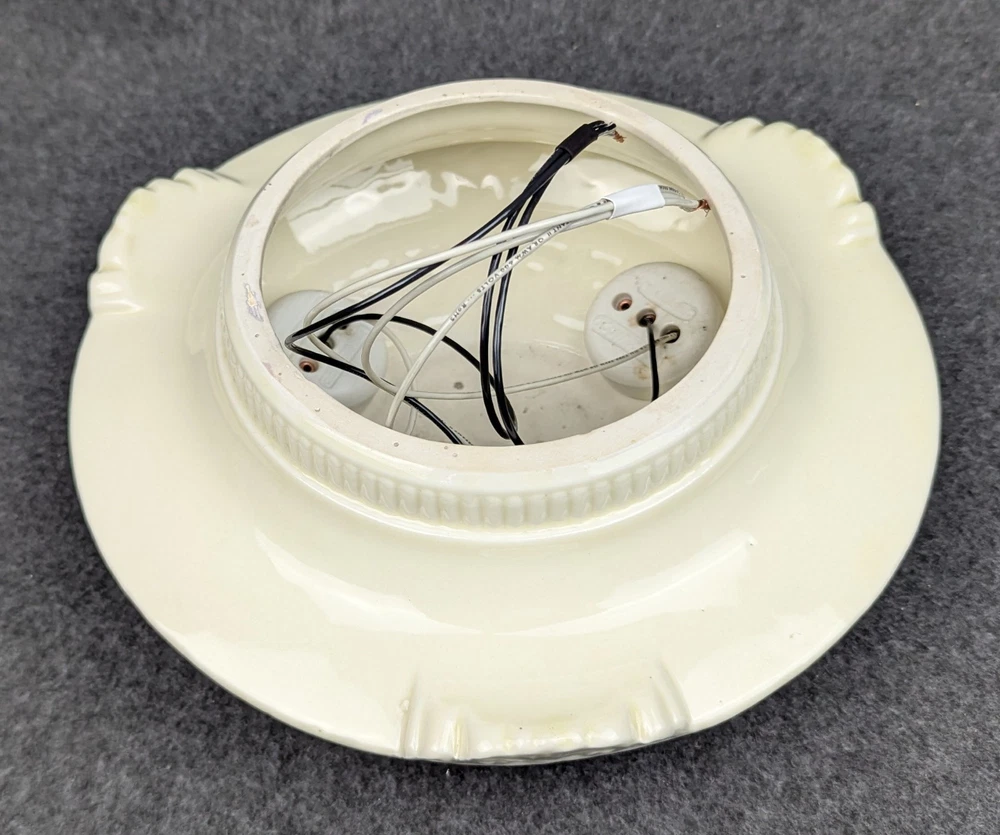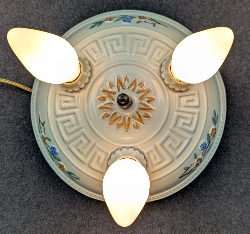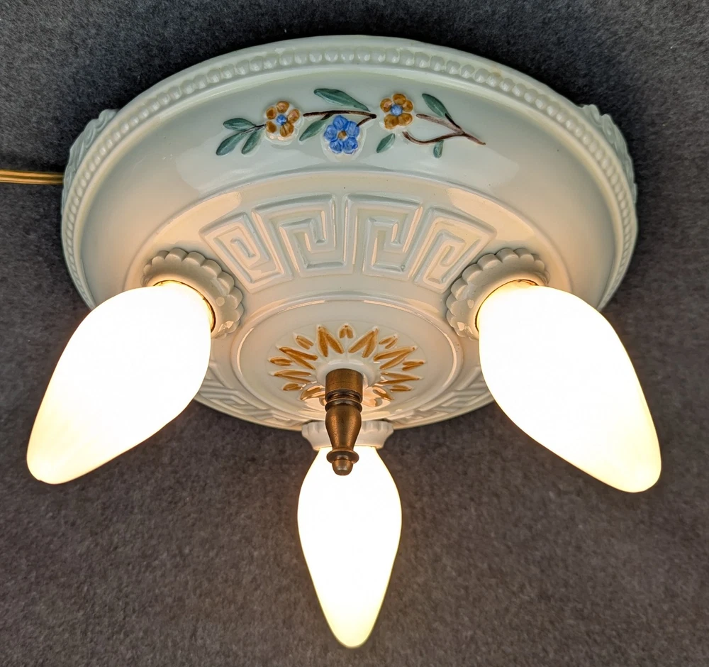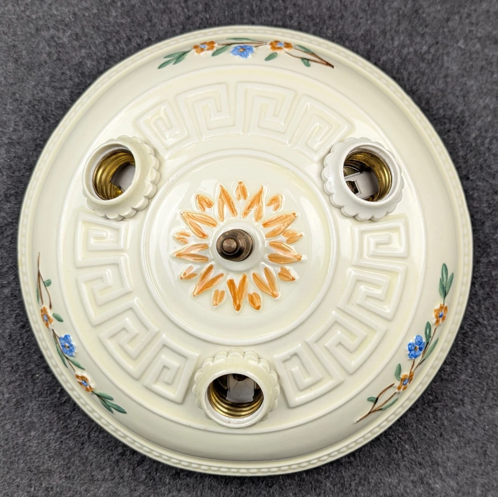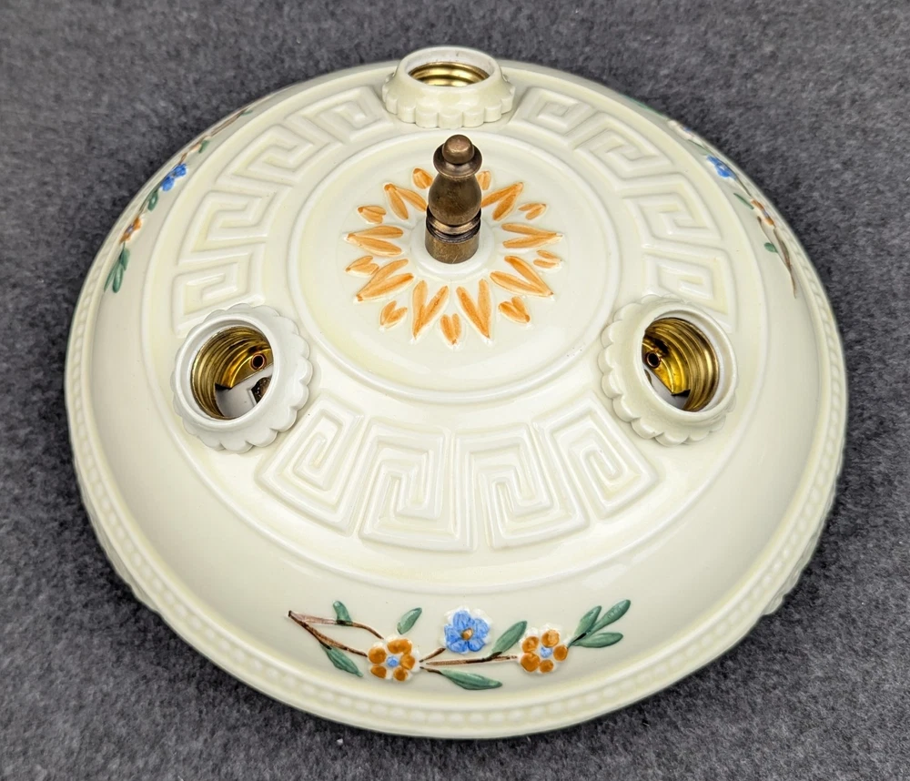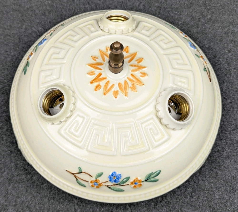 Outstanding PORCELIER 3-Bulb Porcelain Ceiling Light Fixture with Greek Key: Art Deco & MCM era, Rewired Here is a rare 3-bulb porcelain ceiling light fixture in excellent condition. It is rare because of the Greek key design. We have restored hundreds and hundreds of Porcelier fixtures and it is the first one we have had. The fixture was manufactured by Porcelier sometime between the late 1920's and the early 1950's, the lifetime of the company, and it is appropriate for both art deco and mid-century modern design. It has a cream colored background with floral displays of blue, orange, green and brown. We have removed all of the ceiling paint and dirt from the sides of the fixture. Actually, this fixture has lived a charmed life, and there was not a lot to remove. We rewired it using the original signed porcelain and brass bulb sockets. The sale includes the correct mounting hardware (original brass mounting nut, threaded nipple, & crossbar). The fixture has a diameter of 10" and is 4" high (not including mounting nut). All of our lights are guaranteed to be as described and we will accept their return if the buyer is dissatisfied. Just notify us within 30 days of receiving them. Shipping is buyer's choice of USPS Ground Advantage, UPS Ground, FedEx Ground, or USPS Priority Mail. We have other antique lighting for sale including other Porcelier ceiling fixtures, so please check out lighting store !