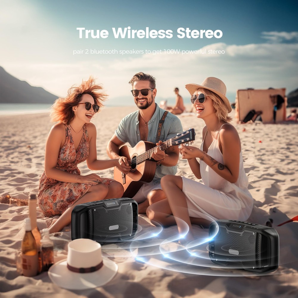 [Loud Powerful Sound]: With its dual tweeters, dual subwoofer, dual passive radiators and EX-BASS (Exclusive Bass)technology, this Bluetooth speaker deliver a 50W(70W Peak) powerful full-range sound, releases with greater clarity and zero distortion. Unique bass enhancement technology, press the EX-BASS button, it can produce a deeper, thicker and more elastic bass.Upgraded speakers, More Power, Better sound. It has the sound quality and capacity of a large speaker and the portability of a small speaker. [10000MAH Built-in Batteries & 30H Playtime]: This portable bluetooth speaker built-in 10000mAh rechargeable battery can up to 30 hours of playtime at 50% volume. No matter what outdoor activities you participate in, this speaker covered with its reliable and long-lasting battery performance. Plus,You can also play music from your PC,TV,and other non-Bluetooth devices via the 3.5mm audio jack. [IPX5 Waterproof Portable Bluetooth Speaker]: IPX5 waterproof bluetooth speakers on the go no longer have to worry about water spray, splashes, rain, accidental spills or dust! This is perfect for the beach, shower room, poolside, garage, patio, yard, boat, garden, bedroom, parties, camping, and more! Embrace your outdoor adventures with 50W real waterproof bluetooth speaker. [Stable Bluetooth Connection & TWS Pairing]: Adopting Bluetooth 5.0 technology, ensures a more stable bluetooth wireless connection, the most perfect sound quality transmission and 100ft bluetooth range. Sync and pair 100+ this outdoor speakers for a ture stereo surround sound experience,give you much louder volume and sound quality of live concert! Wirelessly pair 2 bluetooth speaker to get 100W powerful stereo and an immersive sound experience.Perfect for gaming, music, and movie playback. [Hands-Free of Your Call & An Ideal Gift]: Pick up a call very conveniently when playing music due to the built-in microphone in this wireless speaker. it is an perfect gift for your friend and family. it can used at any occasions,such as Birthday, Easter, Christmas, Party, Anniversary, Fathers Day, Wedding,et.