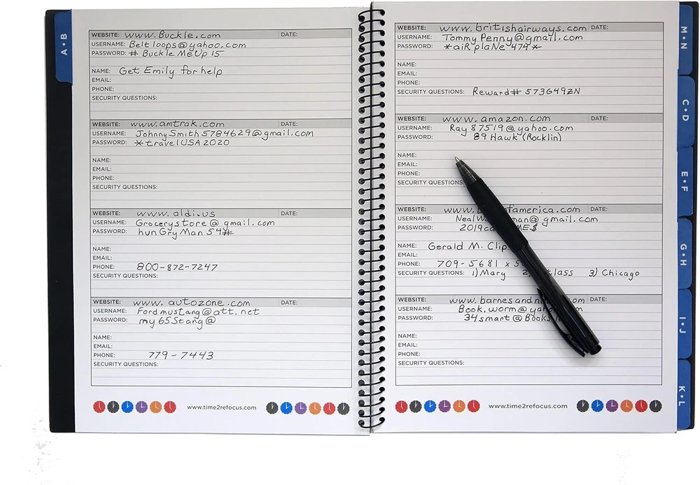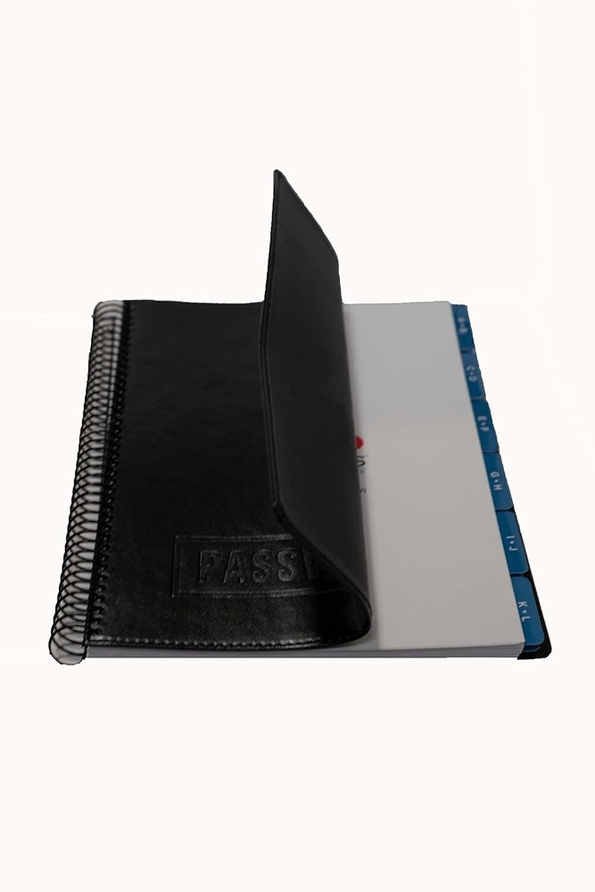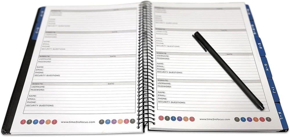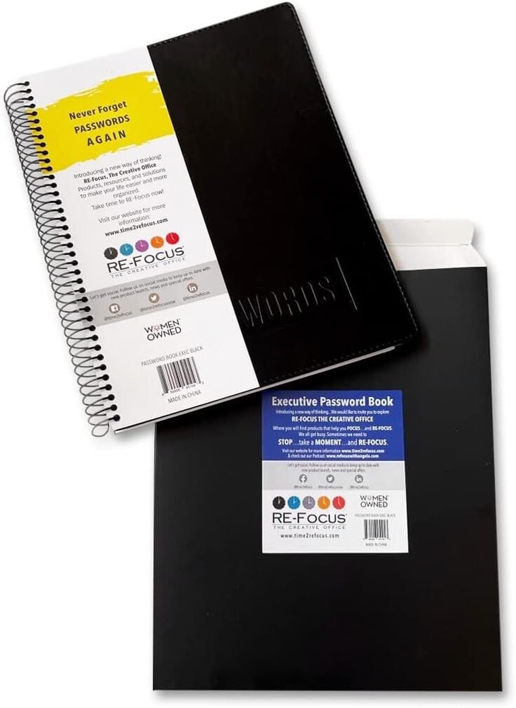 Executive Password Keeper Book, Black, Flexible Faux-Leather Cover, Spiral Bound LARGE SIZE: measures 10” x ” and weighs lbs. It has 144 pages and holds up to 576 passwords. Easy to read and write in. ALPHABETICAL TABS: organized alphabetically with two letters per tab except O, P, Q and X, Y, Z have three letters per tab. Each tab has 12 pages with 4 password entries per page. DURABLE: made of quality materials; premium paper stock, durable spiral binding and a flexible faux-leather cover that resists tearing or scratching. Perfect Gift: This password book keeper is suitable for all adults, men, women, teen girls and boys. It can be a wonderful Christmas, Birthday, Graduation, or Happy New gift. The Executive Black Password Book by is the deluxe version of our password book journals. It provides a fashionable design that is perfect for executives, professionals or anyone who wants elegance along with functionality. The discreet cover is made of a flexible faux-leather providing an upscale look. The inside is organized with alphabetical tabs and has room for 576 passwords. Each entry allows for website, username, password, company, name, , and security questions. It measures 10” X ” x " and is 144 pages.
