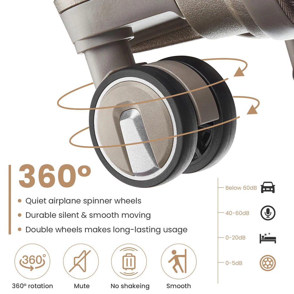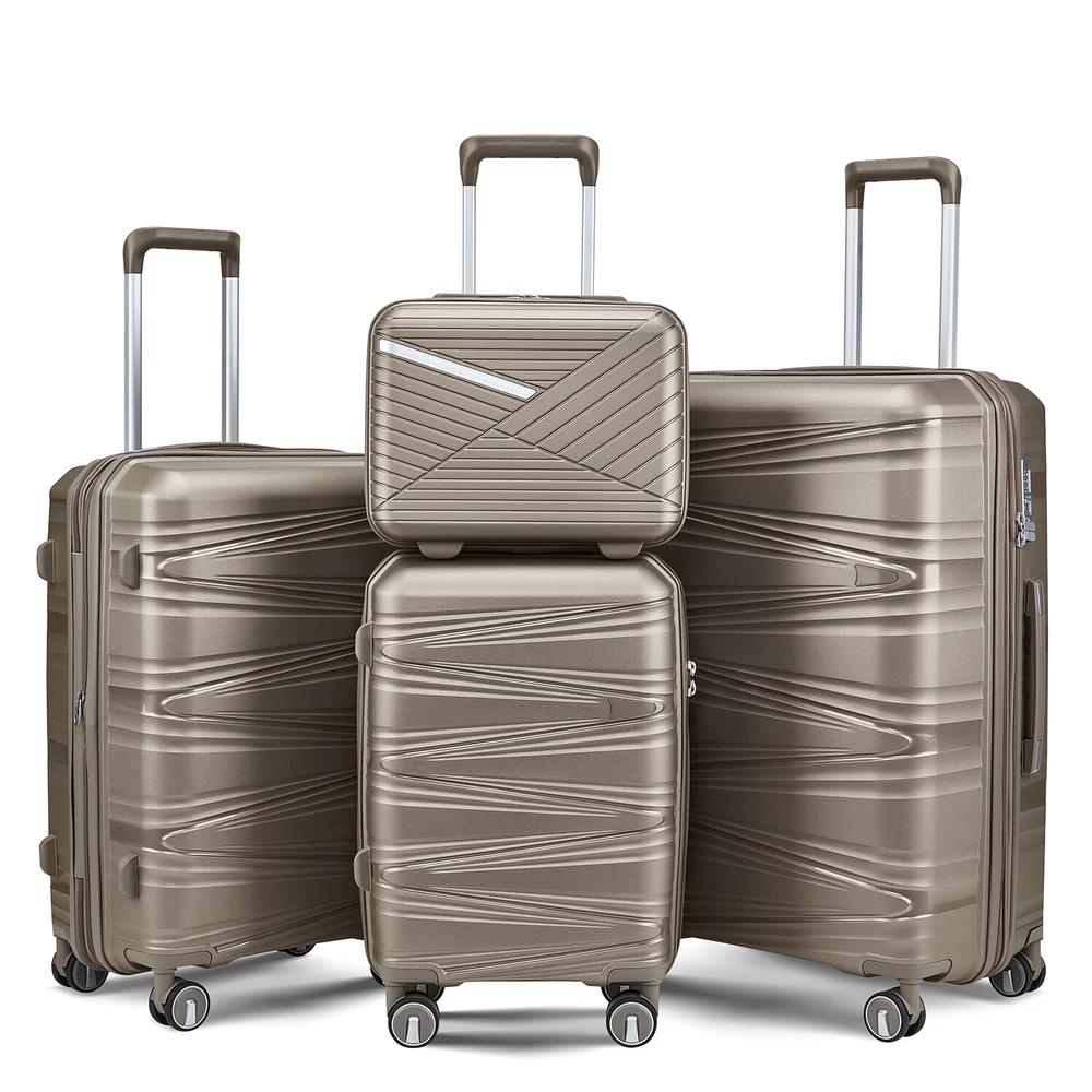Product Information Item Code:W2098126492 Product Type:General Item Product Name:Luggage 4 Piece Sets(14/20/24/28), Hard Shell Lightweight TSA Lock Carry on Expandable Suitcase with Spinner Wheels Travel Set for Men Women Place of Origin:China Main Color:Champagne Main Material:Polypropylene Product Dimensions Assembled Length (in.):18.30 Assembled Width (in.):10.80 Assembled Height (in.):29.00 Weight (lbs.):24.00 Package Size Length (in.):19.30 Width (in.):11.80 Height (in.):30.00 Weight (lbs.):26.50 Product Features Lightweight Luggage Sets: Made of environmentally friendly imported ultra-light PP material, Compared with ABS and PC plastics, PP materials suitcase have better resilience, it can be restored to its original state after being hit violently. Luggage 4 piece sets are the best choice for travel, family travel and business travel. Expandable 4 Piece Luggage Set: The 14 inch suitcase can store some daily necessities such as cosmetics, water glasses, etc. which is easy to access at any time. 20 inch carry on luggage & 24 inch suitcase is perfect for business and personal travel, 24 inch & 28 inch luggage is expandable, which can expand 25% of the additional space. Luggage with TSA Lock: TSA customs password lock design to avoid violent damage to the luggage. which allows only TSA agents to inspect your bags without damaging the lock when traveling. Silent Suitcases with Spinner Wheels: Luggage with spinner wheels can help save your strength and make your suitcase lighter. Luggage moves very silent and smoothly with 360° rotate double wheels, which better than other singer wheel. Full interior space: Travel luggage with fully lined interior has adjustable tie-down straps for securing garments in place.This roller suitcase has reinforced padded top and side handles to make it easier to lift and carry your luggage.