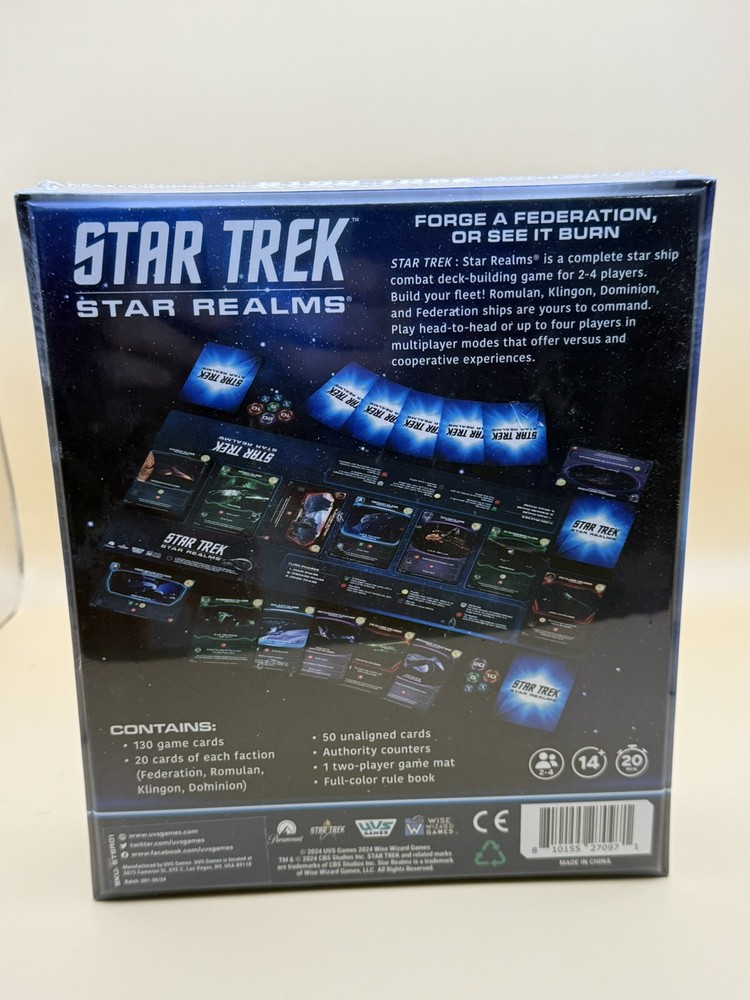 The product is a Star Trek themed card game called Star Trek Star Realms, suitable for players aged 14 and above. It is a deckbuilding card game designed for 1 player and features characters from the Star Trek franchise. The game is by White Wizard Games and is new and sealed, with the theme centered around Star Trek.