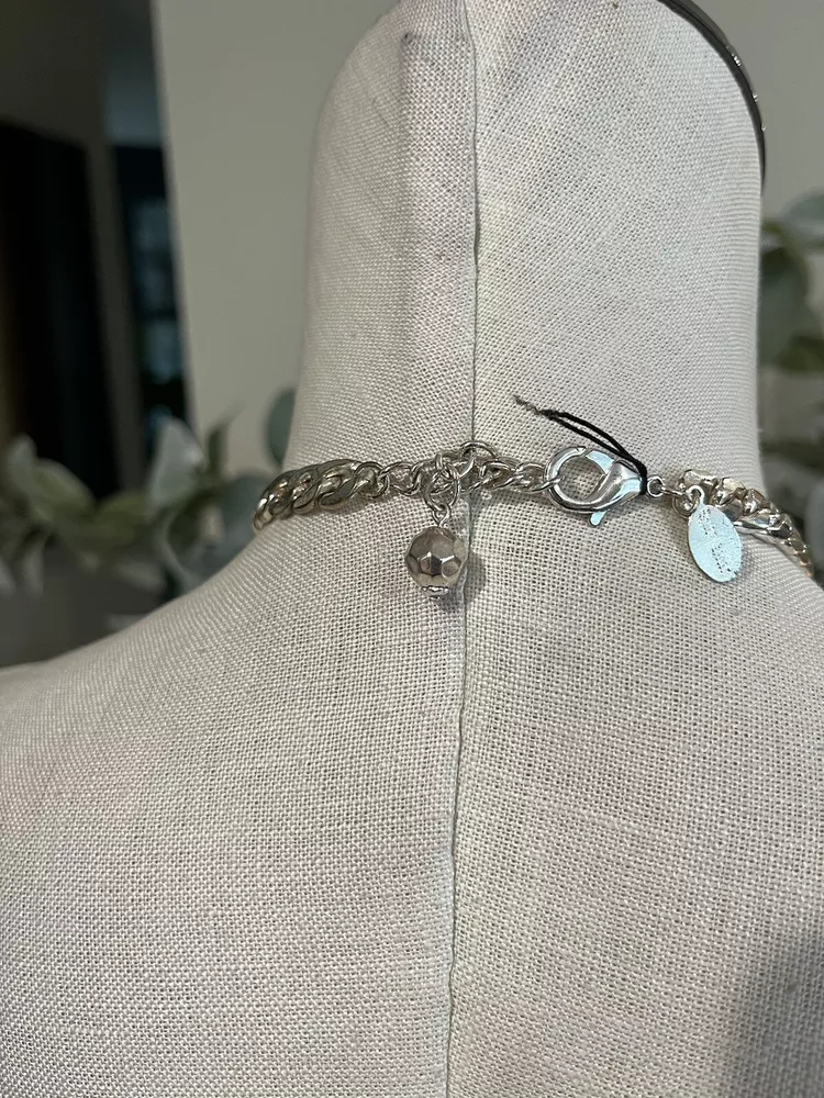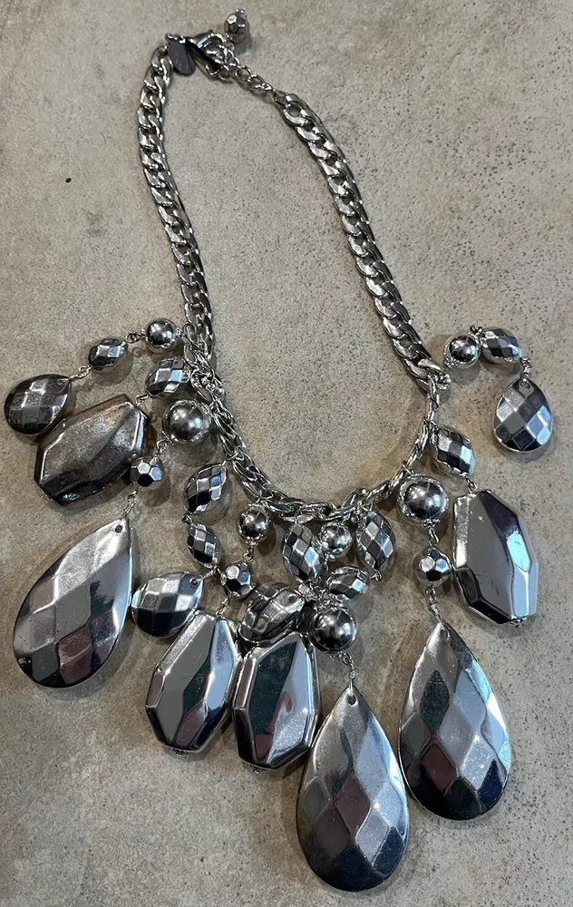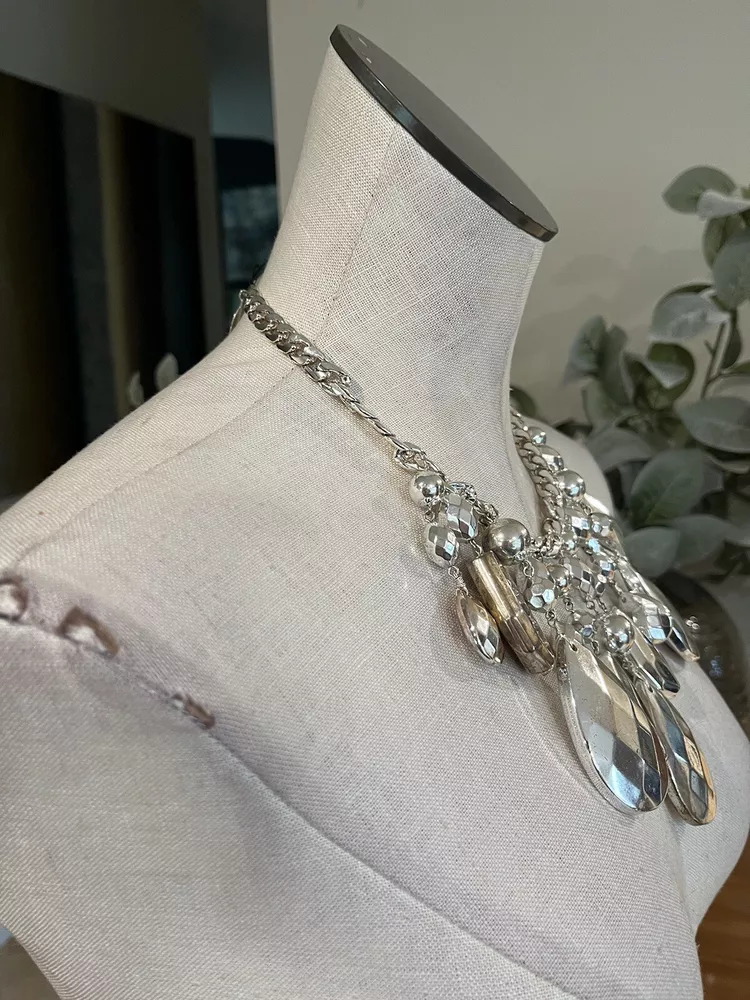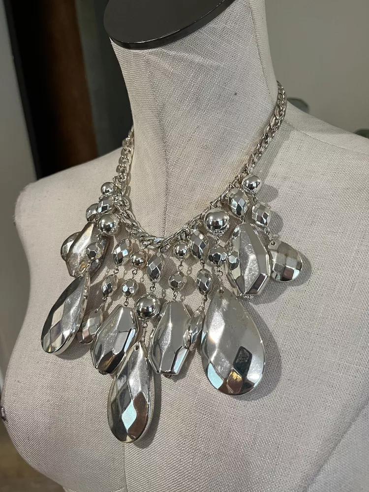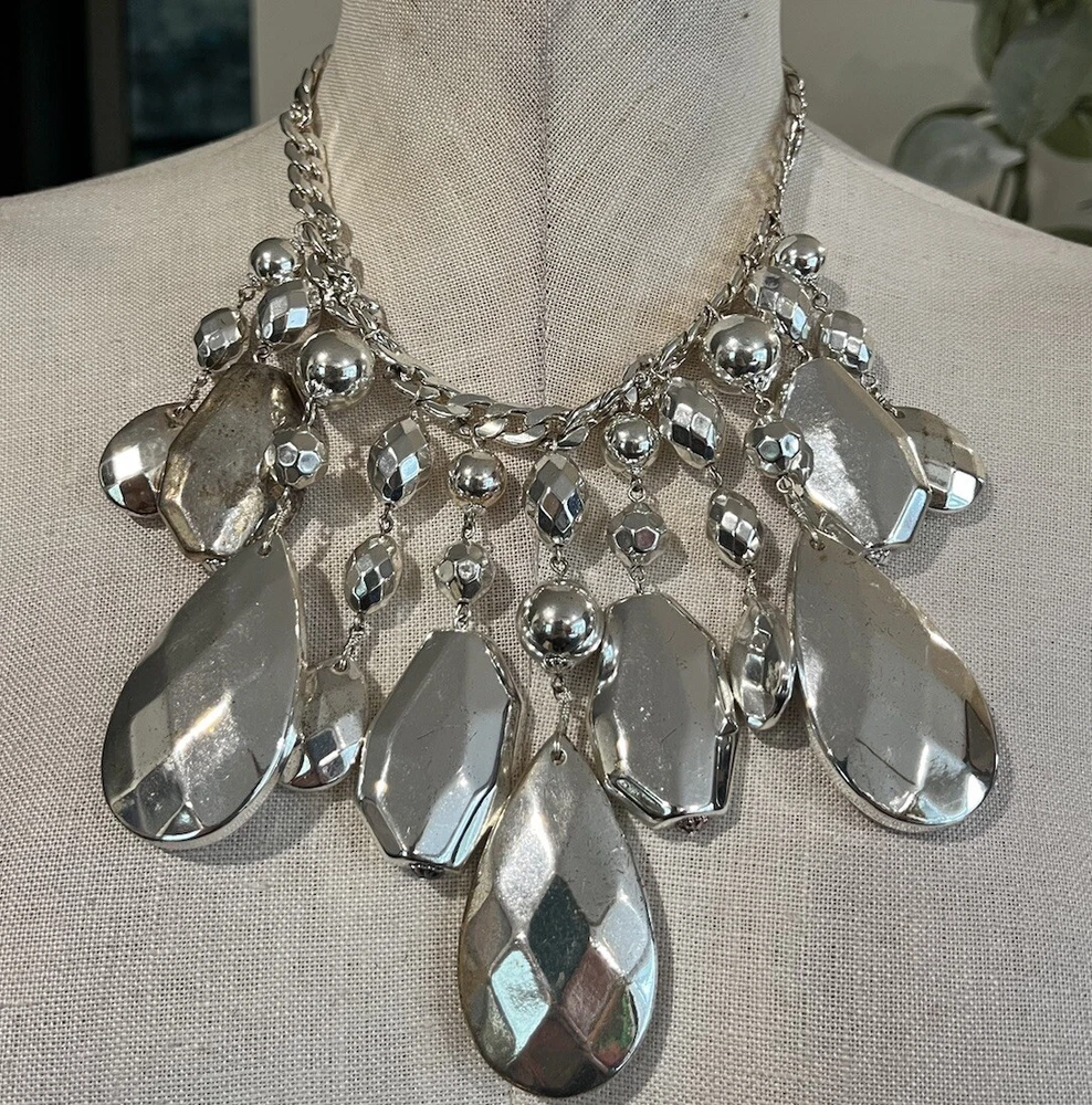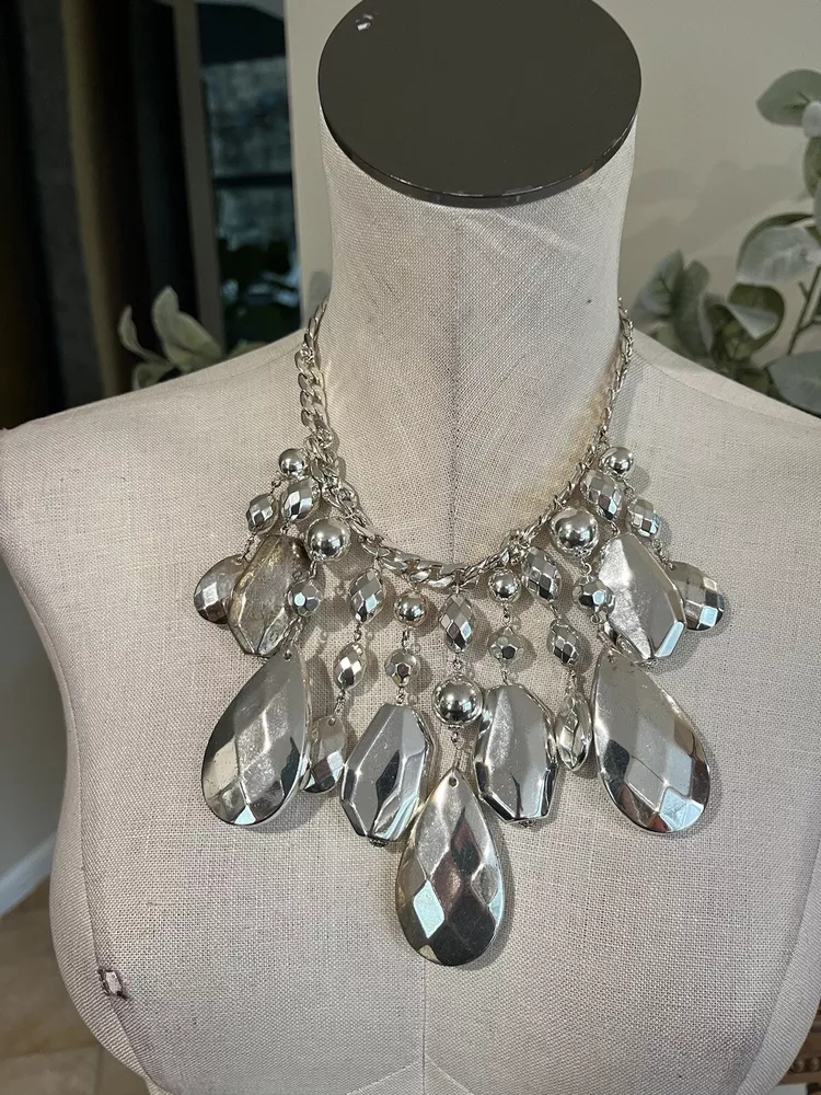 Add a touch of glamour to your outfit with this stunning silver metal statement necklace from Express. The teardrop-shaped pendant and lobster closure make it easy to wear and secure. This fashion-forward piece is perfect for any occasion, whether it's a night out with friends or a special event. The necklace measures 15 inches in length and is made of durable acrylic material. The main stone color is also silver, giving it a cohesive and sophisticated look. Don't miss out on this must-have accessory for your jewelry collection. Length is 15 inches without the extender