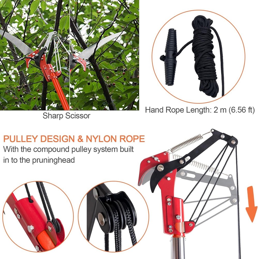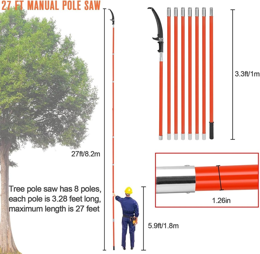 Pole Saws for Tree Trimming, 7.3-27 ft Manual Pole Saw Extendable Tree Trimmer, Long Branch Trimmer Tree Pole Pruner Saw Blades and Scissors Set for Pruning Palms and Shrubs (Red) 【Pole Saws for Tree Trimming】This tree pruner pole saw is designed for easy tree trimming. With its strong toughness and sharpness, it can effortlessly cut through branches. Suitable for palm trees, pine, fir and oak and more. This manual pole saw is widely used in lawns, gardens, forestry and other places where trees need to be trimmed. You can also easily trim high and hard-to-reach branches without bending down, climbing a ladder, and avoiding the dangers of working at heights. 【Spring-Action Pruning Jaws and Hacksaw Head】 Ideal for shearing smaller branches, the pulley-operated spring-action pruning jaws are made of hardened carbon steel. The high-strength alloy hacksaw head, after high-temperature heat treatment, features sharper grinding teeth on three sides for smoother cutting, making it very suitable for sawing thicker branches. 【Extendable Pole Saw】 The tree pole saw has 8 poles of 3.28 feet each, with a maximum length of 27ft, this extendable tree trimmer allows you to reach higher branches without the need for a ladder. It provides convenience and safety during tree trimming. 【Durable and Sturdy】 The long branch trimmer blade is crafted from rust-proof and long-lasting 0.05" / 1.2 mm thick carbon steel. The epoxy resin pole is lightweight and durable. Corrosion resistance, strong bearing capacity, and good insulation performance. It ensures long-lasting performance and can withstand tough tree trimming jobs. 【Easy Assembly】 The tree pole pruner is easy to assemble, the pole connection is threaded structure, easy to install and remove. Palm tree trimmer comes with a sturdy nylon bag for easy portability. Buy with confidence. Blade Material Alloy Steel Surface Recommendation Alloy Steel Power Source Manual Special Feature Extendable Pole, Spring-Action Pruning Jaws, Hacksaw Head