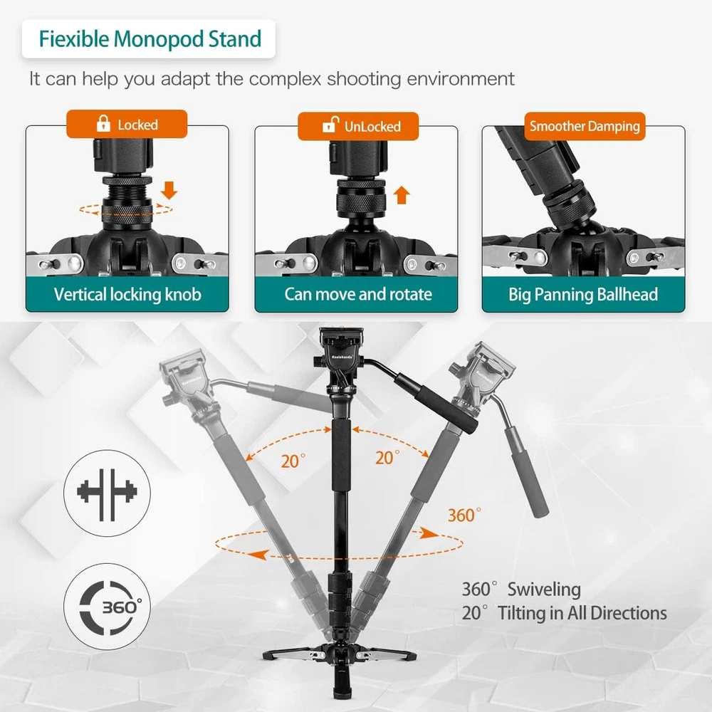 Extendable Camera Aluminum Monopod w/ Fluid Head and Foldable Tripod Base Camera 【Compact and Portable】 - The video monopod is made of high quality aluminum, which is lighter. Folding length 57cm / 22.44inch, weight only 1kg / 2.2lbs, and Payload up to 3kg / 6.6lbs. This video monopod kit is perfect for sporting events, travel and outdoor shooting. 【Quick Leg Lock】 - Professional 4 section monopod can extend up to 148cm / 58inch. It is equipped with an ergonomic flip lock for quick locking. 【Multifunctional Tripod Base】 - The tripod support base can help the monopod to achieve 360 degree pan rotation and 20 degree tilt. The removable base can be used as a mini table tripod. 【Fluid Head】 - The fluid head is made of high quality ABS material, light weight, built-in counterweight system. Smooth tilt and pan damping movement. 360 ° pan and -85 ° / + 90 ° forward tilt. 3.0 inches x 16.0 inches x 3.0 inches. Weight: 1.0 kg Item model number YT-288 Monopod Color 288+video head Is Discontinued By Manufacturer No Product Dimensions 16 x 3 x 3 inches Material Aluminum, Acrylonitrile Butadiene Styrene (ABS) Compatible Devices Camera Maximum Height 58 Inches Item Weight 1 Kilograms Model Name YT-288 Tripod Head Type video-heads Special Feature Por, Lightweight, Compact, Adjustable Weight Limit 3 Kilograms
