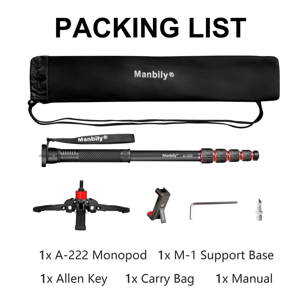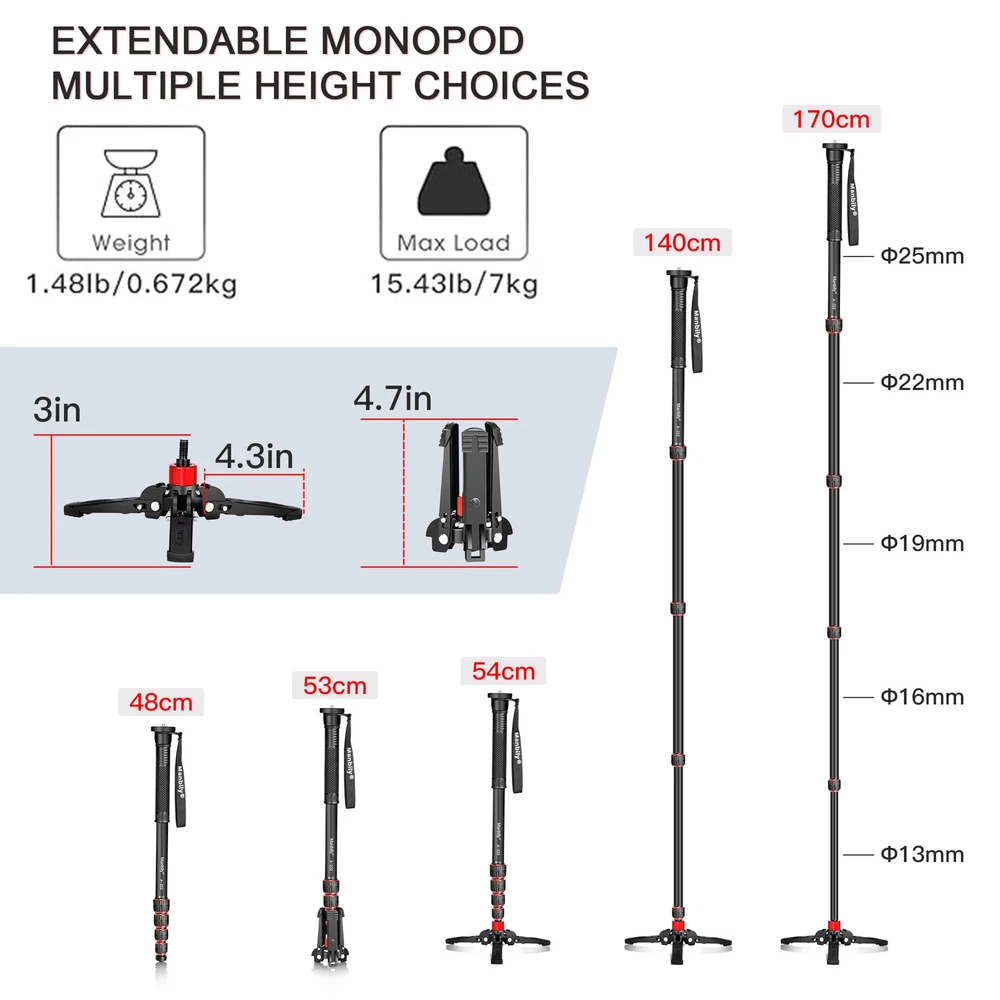 Solid Construction: The A-222 monopod is a lightweight and compact aluminum monopod with an anodized treatment that makes all metal surfaces resistant to abrasion. The CNC process gives the monopod greater strength (load up to 15.5 lbs/7 kg) Anti-slip Rubber Grip: The premium rubber grip ensures a firm grip while in use, an upgrade designed for longevity and professional use Easy To Adjust: Advanced 1/4-turn quick-lock leg allows you to set the monopod between 21" to 67" in seconds. The 20° tilt of the tripod base enables you to adjust the 360° rotation angle to suit your daily shooting needs Portable Travel Monopod: Comes complete with a detachable wrist strap and foldable 3 feet tripod base for easy carrying on the go. Use the wrist strap to prevent the monopod from accidentally falling over while shooting Modern & Functional: The camera monopod comes with two interchangeable feet: a metal spike and a rubber feet. Use the standard rubber feet for smooth or paved surfaces and the metal spike for soft ground or other less stable conditions User Notice: The monopod base is only used to increase stability and is not recommended for use as a tripod. Please always keep the strap around your hand to prevent the monopod from accidentally falling over Friendly Reminder: For better stability, we recommend that you do not extend the minimum diameter tube section or purchase a professional tripod