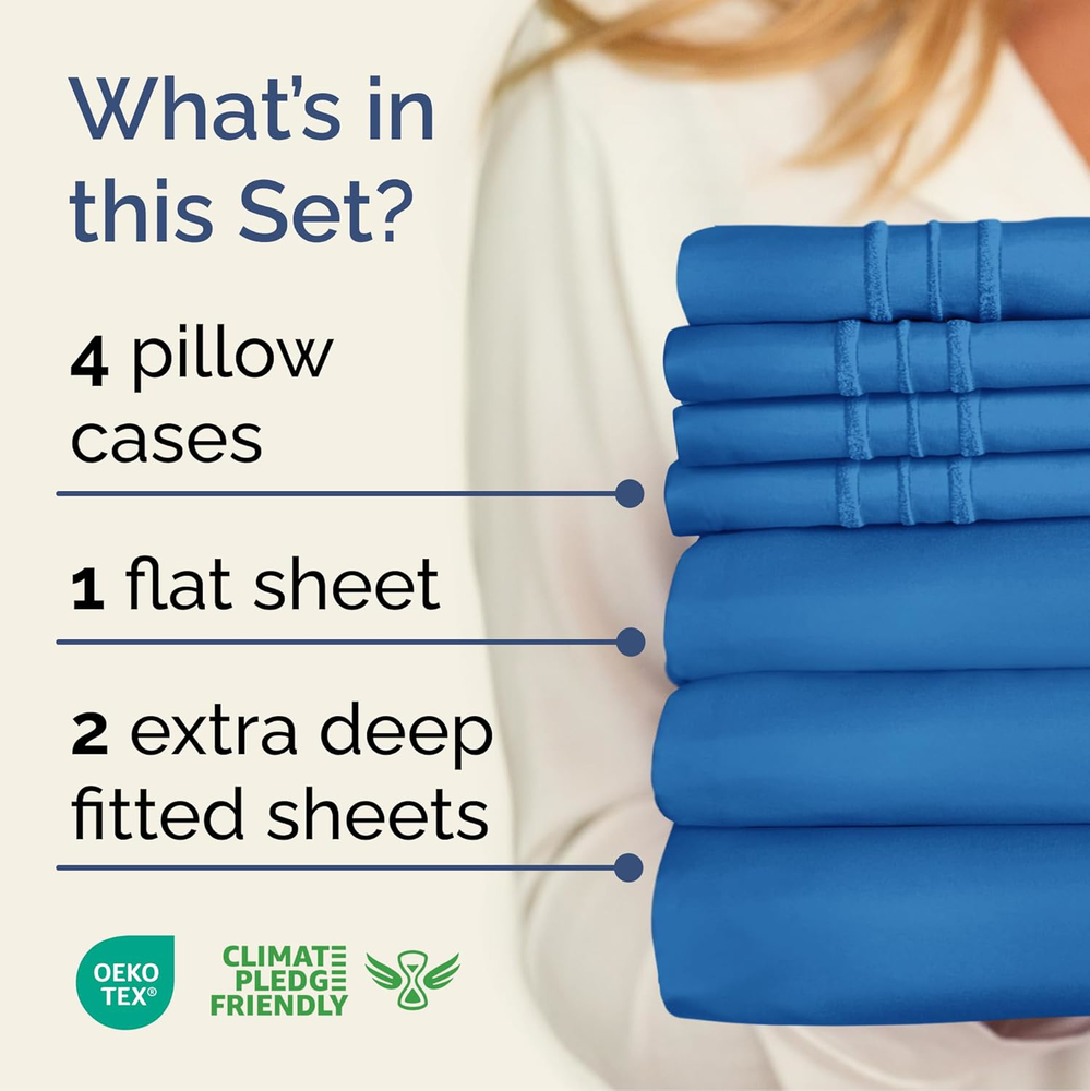 Fast Shipping Great Customer Support Satisfaction Guaranteed DESCRIPTION Shipping Shipping Shipping All domestic packages are shipped for Free (Unless other shipping method was selected during the checkout) Most items ship and arrive much sooner than the estimate delivery date. Usually within 2-3 days from payment. However, we have longer estimates to compensate for the occasional delay or supply chain breakdown. We do not accept P.O. BOXES - PLEASE PROVIDE A PHYSICAL ADDRESS Return Return Return In the event that you would like to return your purchase, we allow returns that are processed within the defined return date (the return date is to be found in the return policy/shipping and handling section) Please contact us for a return authorization and the return shipping address. Payment Payment Payment PayPal is our preferred method of payments it's the quickest, easiest and most secure way to pay for your goods or services online. PayPal offers buyer and seller protection should there be a problem. If you do not have a PayPal account, to get started and buy your first item with us is very easy. Simply click on the 'Buy It Now' button and follow the eBay checkout steps. Select PayPal as the payment method you then will be given the chance to enter your card details in to PayPal's secure checkout in order to pay for your order. Once the payment has been made, you will then be given the opportunity to make your own PayPal account to make paying for your items in the future very easy. Should there be a problem with payment please do let us know. Feedback Feedback Feedback Customer satisfaction is very important to us. If you have any problem with your order,please contact us and we will do our best to make you satisfied, please do not leave a negative feedback before we resolve your problem. We guarantee that your issue will be solved quickly. As long as you are happy with your purchase of , please leave us a positive feedback. Your feedback is very important to us it affects our search placement on eBay. We will leave a positive feedback for you in return automatically once we receive your feedback. Contact Us Contact Us Contact Us If you have any queries, please contact us via ebay. We usually respond within 24 hours on weekdays. Thank you for visiting our ebay store! EXTRA DEEP POCKET SPLIT KING SHEETS / EXTRA DEEP FITTED SPLIT KING SHEETS: These bed sheets are for very deep pocket mattresses. They fit any mattress with pockets that are 18, 20, 21, 22 and 24 inches deep. There's stretchable elastic around the extra deep fitted sheet which stretches for a nice tug around your mattress. Perfect for extra tall & large mattresses. Rest assured these oversized sheets will stay on tight & stay in place! 7 PIECE SHEET SET: This bed sheet set comes with 4 pillowcases total all with beautiful decorative embroidery design on each pillow case. The pillow cases have enclosure designs. This bedding set will accommodate your extra thick mattress perfectly. GREAT FOR DOUBLE PILLOW TOP MATTRESS: These bed sheets are perfect for mattresses with a 3 inch or 4 inch topper on top, memory foam toppers, big mattress pads, pillow tops, foam toppers, big foam toppers, pillow top mattresses and memory foam. These sheets will not come off. MICROFIBER: These are the softest type of microfiber bed sheets we have created. Super soft with a light feel. Not crisp like cotton. If you're accustomed to cotton sheets and you've never tried microfiber sheets we recommend you give these a try. They're even softer than cotton! DIMENSIONS & SIZES: Flat Sheet 113 wide and 102 long. Fitted sheet 39 wide and 80 long with 21 inch pockets (has elastic so it can stretch). All four pillow cases are oversized 20 x 40 inch. Extra Deep Split King Sheet Set - 7 Piece Soft Cooling Royal Blue Sheets Click here to see description Fast Shipping Great Customer Support Satisfaction Guaranteed DESCRIPTION Shipping All domestic packages are shipped for Free (Unless other shipping method was selected during the checkout) We ship within two business days of payment, usually sooner Standard FREE shipping takes between 3-5 business days Expedited shipping takes between 2-3 business days Overnight shipping takes between 1-2 business days We do not accept P.O. BOXES - PLEASE PROVIDE A PHYSICAL ADDRESS We Ship Globally using ebay's GSP, the item is sent to a logistic center in KY and shipped from there to the rest of the world. International customers are responsible for all duties and taxes Contact your local authority for questions related to the amount of duties or taxes you will be responsible for Return In the event that you would like to return your purchase, we allow returns that are processed within the defined return date (the return date is to be found in the return policy/shipping and handling section) Please contact us for a return authorization and the return shipping address. Please contact us for a Return Merchandise Authorization (RMA) number. We advise you to use a reputable carrier service when returning your goods. Please pack all returns appropriately. We ship globally Via eBay's global shipping program (GSP). Thus we don't cover returns for items shipped globally. Buyers returning such items will be refunded ONLY for the item's cost and not for the shipping. please check the Voltage information and make sure it matches the one in your country. In case it's not stated in the description, do ask us. Payment PayPal is our preferred method of payments it's the quickest, easiest and most secure way to pay for your goods or services online. PayPal offers buyer and seller protection should there be a problem. If you do not have a PayPal account, to get started and buy your first item with us is very easy. Simply click on the 'Buy It Now' button and follow the eBay checkout steps. Select PayPal as the payment method you then will be given the chance to enter your card details in to PayPal's secure checkout in order to pay for your order. O