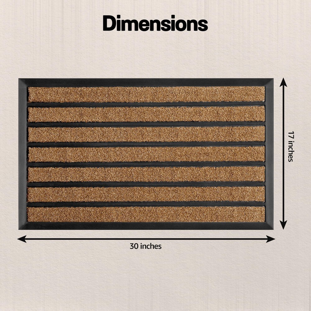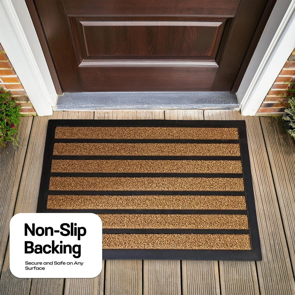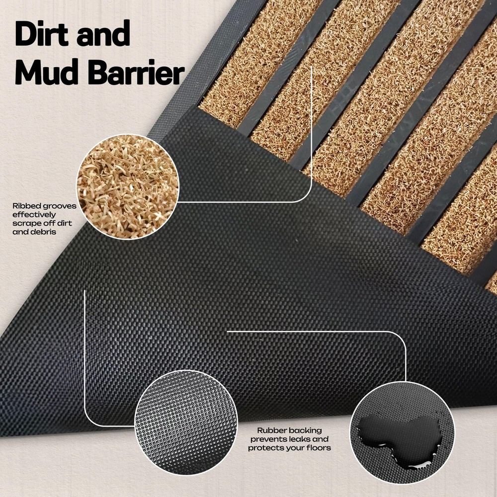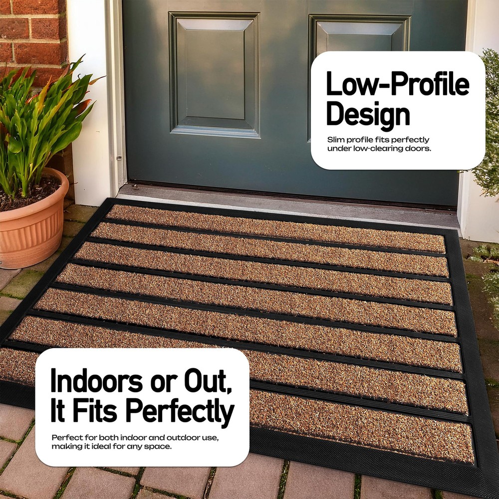Perfect Dirt Trapper: Our innovative design combines high quality artificial grass and durable rubber strips for an effective mud removing outdoor door mat. Outdoor front door mats outdoor will keep your doorstep clean and tidy. Extra-Large Coverage Doormat: Perfect for wide entryways, large patios, or commercial entrances, this mat offers maximum surface area to keep dirt and moisture out. Heavy-Duty Construction: Made from premium all-natural rubber and durable woven polypropylene, built to withstand heavy foot traffic. Traps Dirt and Moisture: The raised patterned grooves and beveled rubber border effectively capture mud, dirt, and water, keeping your floors clean. Non-Slip Stability: Strong rubber backing ensures the mat stays firmly in place, providing safety on any surface. Weather-Resistant: Designed to endure harsh outdoor conditions—rain, snow, or sun—without fading or cracking. Low-Profile Design: Fits neatly under doors without obstructing movement, perfect for high-traffic areas. Easy to Clean: Shake off dirt, vacuum, or hose down for a hassle-free clean. !CAUTION: Prevent Falls: Ensure mat lies flat before using. To flatten, roll mat in opposite direction overnight (or until flat).