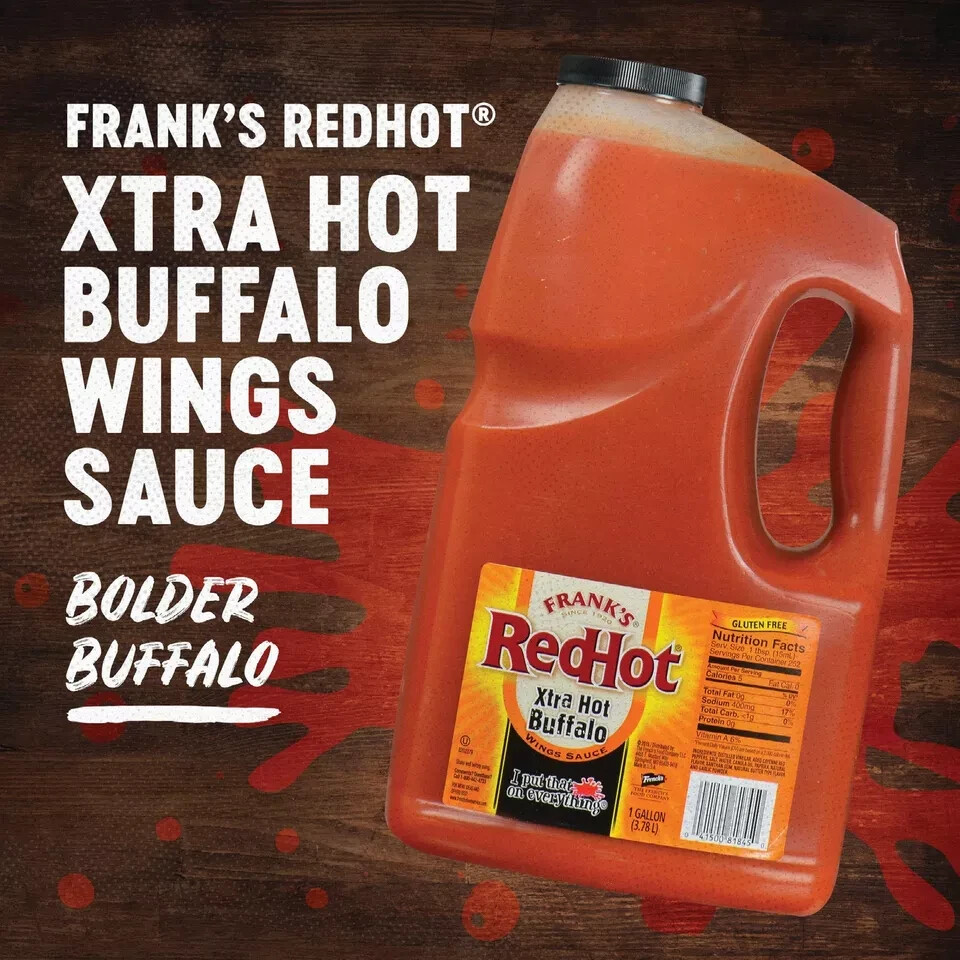 Frank's RedHot Xtra Hot Buffalo Wings Sauce, 1 gal - One Gallon Jug of Extra Hot Buffalo Wings Hot Sauce with 3x the Heat for Spicy Apps, Snacks, Sides and More ✓ Free 30 Day Returns ✓ Free Shipping INTENSE, SIGNATURE SPICY FLAVOR: Frank's RedHot Xtra Hot Buffalo Wings Sauce triples the signature heat of Franks RedHot Original Buffalo Wings Sauce for those who crave intense spiciness in every bite PREMIUM AND BALANCED BLEND: Made using real, aged red cayenne peppers and premium ingredients to deliver the perfect balance of flavor and heat; all ingredients are carefully sourced for consistent taste and performance MADE FOR CHEFS: Crafted with culinary professionals in mind, each 1-gallon jug comes ready to use; adds a bold, buttery flavor to appetizers, entrees and savory sides; dispense bulk hot sauce into smaller containers for ease of use VERSATILE FLAVOR PROFILE: Delivers a robust flavor profile your customers will keep coming back for; spice up fan-favorite recipes and come up with all kinds of new ones; buffalo hot sauce is ideal for meat, veggies, grains and other foods FEEL GOOD INGREDIENTS: Kosher, gluten-free and vegetarian and made without high fructose corn syrup and dairy for flavor you can feel good about; trust the food you serve when you cook with this hot sauce When you want to add a bold Buffalo taste to your menu, you need Frank's RedHot Xtra Hot Buffalo Wings Sauce. This blend triples the signature heat found in the original Frank's RedHot. While this flavor profile is undeniably spicy, the special formula ensures this sauce still delivers the perfect balance of flavor and heat. Frank's RedHot Buffalo Sauce uses real, select, aged red cayenne peppers to get that rich, natural, spicy flavor. Then, industry experts take these peppers and blend them with premium ingredients like garlic powder, paprika and natural butter flavor to ensure consistency and quality. The result is a degree of heat that you won't find in ordinary hot sauces.Culinary professionals will appreciate that this extra hot sauce comes in a ready-to-use container. You'll save time and effort in the kitchen without sacrificing flavor. Each 1-gallon jug gives you plenty of hot sauce to infuse your menu items with a bold Buffalo taste. All you have to do is give the bottle a good shake, then toss, drizzle or pour some on your dishes to achieve a robust aroma and high heat.Whether you serve appetizers, snacks, sides, entrees or drinks, Frank's RedHot Xtra Hot Buffalo Wings Sauce will add a fiery kick. It enhances the taste of meats like chicken, beef and ribs. This sauce also pairs well with salmon, fish tacos and meatballs. Add some to your signature dips, dressings or sauces. You can even incorporate some of this extra hot sauce into bloody marys for additional heat.Without a doubt, this bulk buffalo hot sauce will quickly become a kitchen staple. This mouthwatering addition is made without high fructose corn syrup, is dairy-free and gluten-free, allowing you to treat your customers to all your recipes and accommodate their dietary needs. Because it's kosher and vegetarian, you'll be able to treat even more people t