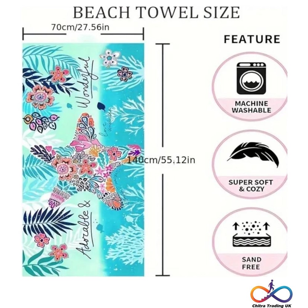 Ultra-Soft Microfiber Beach Towel β Quick-Dry, Sand-Free & Breathable ππ Upgrade your beach days with our Ultra-Soft Microfiber Beach Towel , designed for ultimate comfort and convenience! Made from premium microfiber , this towel is super absorbent, quick-drying, and sand-resistant , ensuring a hassle-free experience at the beach, pool, or gym. The lightweight, breathable fabric is ultra-soft and gentle on the skin, making it perfect for sunbathing, yoga, or travel. β¨ Key Features: β Ultra-Soft & Skin-Friendly β Feels smooth and luxurious on your skin. β Quick-Dry & Super Absorbent β Dries 3x faster than regular cotton towels. β Sand-Free Technology β Shake off sand effortlessly for a clean experience. β Lightweight & Compact β Easy to carry, perfect for travel & outdoor adventures. β Vibrant Tropical Design β Stylish and eye-catching for beach lovers. π Perfect For: Beach & Pool Days β Stay dry and comfortable without carrying bulky towels. Yoga & Fitness β Soft, absorbent, and ideal for workouts or relaxation. Travel & Camping β Lightweight and compact for easy packing. π Available in Multiple Colors & Patterns β Find your perfect tropical vibe! Donβt settle for ordinary towelsβupgrade to the best beach towel for a sand-free, quick-drying, and ultra-soft experience! Order yours today! πβ¨