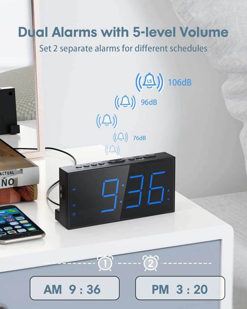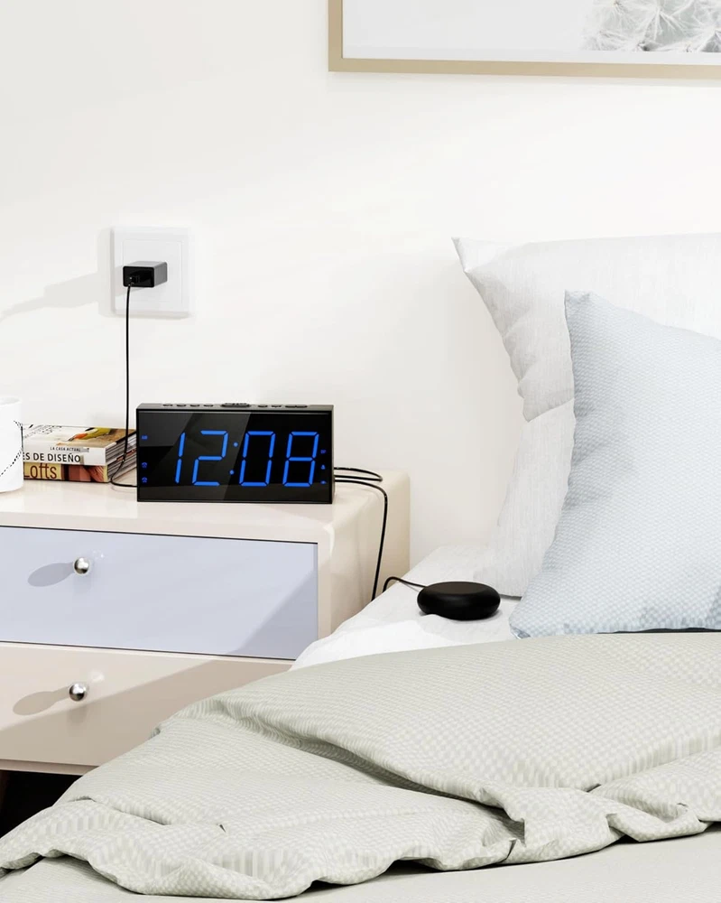 โฐใWake by ๐ฆ๐๐ฟ๐ผ๐ป๐ด ๐๐ฒ๐ฑ ๐ฆ๐ต๐ฎ๐ธ๐ฒ๐ฟ & ๐๐ผ๐๐ฑ ๐๐๐๐๐ฒ๐ฟใ- Differ from regular alarm sound clock, our ๐น๐ผ๐๐ฑ ๐ฎ๐น๐ฎ๐ฟ๐บ ๐ฐ๐น๐ผ๐ฐ๐ธ comes with 3 innovative alarm methods: loud buzzer, super bed shaker or both sound and shaker, actually make it easier to wake you up from deep sleep. Simply press the โBUZZ/VIBโ button to choose your favorite wake-up modes for maximum impact. The bed shaker alarm clock is also a perfect option for heavy sleepers, hearing impaired, deaf or hearing loss. ๐ใStrong Wired Vibration Shaker & Adjustable Volumeใ- The ๐๐ถ๐ฏ๐ฟ๐ฎ๐๐ถ๐ป๐ด ๐ฎ๐น๐ฎ๐ฟ๐บ ๐ฐ๐น๐ผ๐ฐ๐ธ features with 71โ wired bed shaker which is long enough to be placed under the mattress. It can produce a strong vibration to shake you awake without disturbing others. The alarm sound volume is 4-level adjustable to meet your different needs. Combing the highest volume level and powerful bed shaker, you can be reliably waken up on time even for heavy sleeper. ๐ดใDual Alarm Clock & Big Snooze Functionใ-The ๐ฑ๐๐ฎ๐น ๐ฎ๐น๐ฎ๐ฟ๐บ ๐ฐ๐น๐ผ๐ฐ๐ธ allows you to set two separated alarms easily especially handy for couples or roommates who keep different schedules. When the alarm goes off, lightly touch the big snooze button to turn off temporarily and get extra 9 minutes sleep before alerting you again. You can also press the โALARM PAUSEโ or โALARM OFFโ to turn off the alarm for 24hours or permanently respectively. ๐ ใ7.5โโ Large Display & 5 levels Brightness Dimmerใ-With 7.5โโ big LED display, the numbers on the ๐ฏ๐ฒ๐ฑ ๐๐ต๐ฎ๐ธ๐ฒ๐ฟ ๐ฎ๐น๐ฎ๐ฟ๐บ ๐ฐ๐น๐ผ๐ฐ๐ธ are ultra-clear to see from a long distance or across the bedroom even without glasses. 5 level adjustable screen brightness help you avoid high-intensity light while you are asleep or easily view the time in the daytime. ๐ใElectric Powered with Battery Backupใ- All functions of the ๐ฏ๐ฒ๐ฑ๐ฟ๐ผ๐ผ๐บ ๐ฎ๐น๐ฎ๐ฟ๐บ ๐ฐ๐น๐ผ๐ฐ๐ธ work under AC power (input power 100-240V), 2pcs AAA backup batteries (NOT Included) are only used to memorize time and alarm settings when encountering power outage. During the backup battery, the screen will go blank but the alarm will still be triggered. ๐ฑใUSB Charger Port Design & 12/24H Formatใ- The ๐ฎ๐น๐ฎ๐ฟ๐บ ๐ฐ๐น๐ผ๐ฐ๐ธ ๐๐ถ๐๐ต ๐จ๐ฆ๐ ๐ฐ๐ต๐ฎ๐ฟ๐ด๐ฒ๐ฟ port (5V/1A) provides the convenience for charging your phone or other device safely while you sleep. The 12/24H format and DST function are also available by pressing the corresponding buttons. ๐ใEasy to Operate & Wide Applicationใ- With the intuitive setting buttons, the ๐ฎ๐น๐ฎ๐ฟ๐บ ๐ฐ๐น๐ผ๐ฐ๐ธ ๐ณ๐ผ๐ฟ ๐ต๐ฒ๐ฎ๐๐ ๐๐น๐ฒ๐ฒ๐ฝ๐ฒ๐ฟ is easy to use even for kids or elders. Updated features such as vibration, dual alarm, dimmer, USB charging port and modern design, the digital alarm clock can be as a perfect choice for your family, friends, kids. Product Description Roxicosly Digital Alarm Clock with Bed Shaker & Buzzer Sound Whether you have the bother of hearing the sound when you use the sound alarm clock or simple want to get up without disturbing others, our Roxicosly loud vibrating alarm clock is a great choice for meet your requirements for simple sound alarm clock . Based on the original ring alarm clock , we developed this digital alarm clock with bed shaker which not only can make loud sound buzzer but also produce strong vibration to wake you up. Especially helpful for heavy sleeper, hearing loss, hearing-impaired, deaf or hard of hearing. Excellent Features- 3 wake-up modes option: buzzer or shaker or buzzer & shaker. Dual alarm clock function allows you to set two separate alarms to meet different routines. Alarm volume is 5-Level adjustable to make a gently or loud alert for waking you up. 7.5โโ ultra-large display for you to see the numbers clearly and 5 different brightness levels. Touch big snooze button to get extra 9mins sleep. Alarm clock with USB charging port makes it conveniently to charge smartphone safely. Alarm clock backup battery is used to memorize time & alarm setting in case of power failure. 12/24H Format and DST function by hold press the โ12/24Hโ and โDSTโ buttons separately. Extra loud alarm clock for heavy sleepers , hearing-impaired or deaf. Easy to use the smart loud alarm clock with simple interface and conspicuous buttons. New Ways to Wake Up Comes with a powerful bed shaker, Roxicosly bed shaker alarm clock owns 3 wake-up modes: buzzer or shaker or buzzer & shaker to meet different needs. Simple place the bed shaker with 71'' long wired under any mattress or pillow without causing discomfort to your head and it will produce strong vibration to shaken you awake without disturbing your couples or roommates. The vibrating alarm clock is especially a good choice for heavy sleeper, hearing loss, hearing-impaired, deaf or hard of hearing. ๐๐ฒ๐ฎ๐๐ ๐๐น๐ฒ๐ฒ๐ฝ๐ฒ๐ฟ ๐ฎ๐น๐ฎ๐ฟ๐บ ๐ฐ๐น๐ผ๐ฐ๐ธ is a smart choice for those who want to wake up without disturbing their partners or roommate With the portable size, our ๐๐ถ๐บ๐ฝ๐น๐ฒ ๐ฎ๐น๐ฎ๐ฟ๐บ ๐ฐ๐น๐ผ๐ฐ๐ธ is perfect for those who are normally travelling and wake them up without affecting others when on board. No matter which wake-up modes you choose, the icons on the display which show sound or shaker will show clearly on the screen interface. With the excel