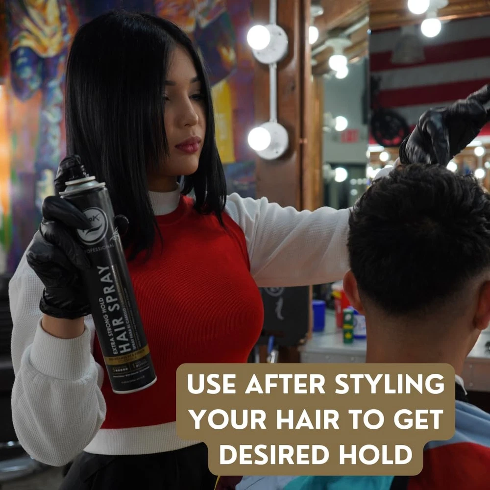Our Extra Strong Hold Hair Spray is the best hair spray for men, thanks to its specialized formula containing Pro-Vitamin B5 and Keratin. These ingredients hydrate, strengthen, and rejuvenate the hair while fighting frizz and humidity. Our hair spray is perfect for adding volume, creating a matte finish and reducing shine, all while extending the hold of your hairstyle for an extended period of time. This hair spray is perfect for all hair types and is a salon-grade finishing product. It is free from flakes, residues and cruelty. Its subtle fragrance and matte finish give you a perfect and natural look. Our Extra Strong Hold Hair Spray is the best hairspray for humidity control and the best hairspray for men. As always, Made for Men, Approved by Barbers. Extra Strong Hold Hair Spray - Extra strong hair spray is the best hair spray for men, thanks to its specialized formula containing Pro-Vitamin B5 and Keratin. These ingredients hydrate, strengthen, and rejuvenate the hair while fighting frizz and humidity. Fighting Frizz & Humidity - Our hair spray is perfect for adding volume, creating a matte finish and reducing shine, all while extending the hold of your hairstyle for an extended period of time. This hair spray is perfect for all hair types and is a salon-grade finishing product. Cruelty-Free Hair Spray - It is free from flakes and residues. Its subtle fragrance and matte finish give you a perfect and natural look. Our Extra Strong Hold Hair Spray is the best hairspray for humidity control and the best hairspray for men. Polished Finish - Matte finish reduces shine but leaves a clean and healthy glow. Made For Barbers - As always, made for men, and approved by Barbers. Products are used by men worldwide.