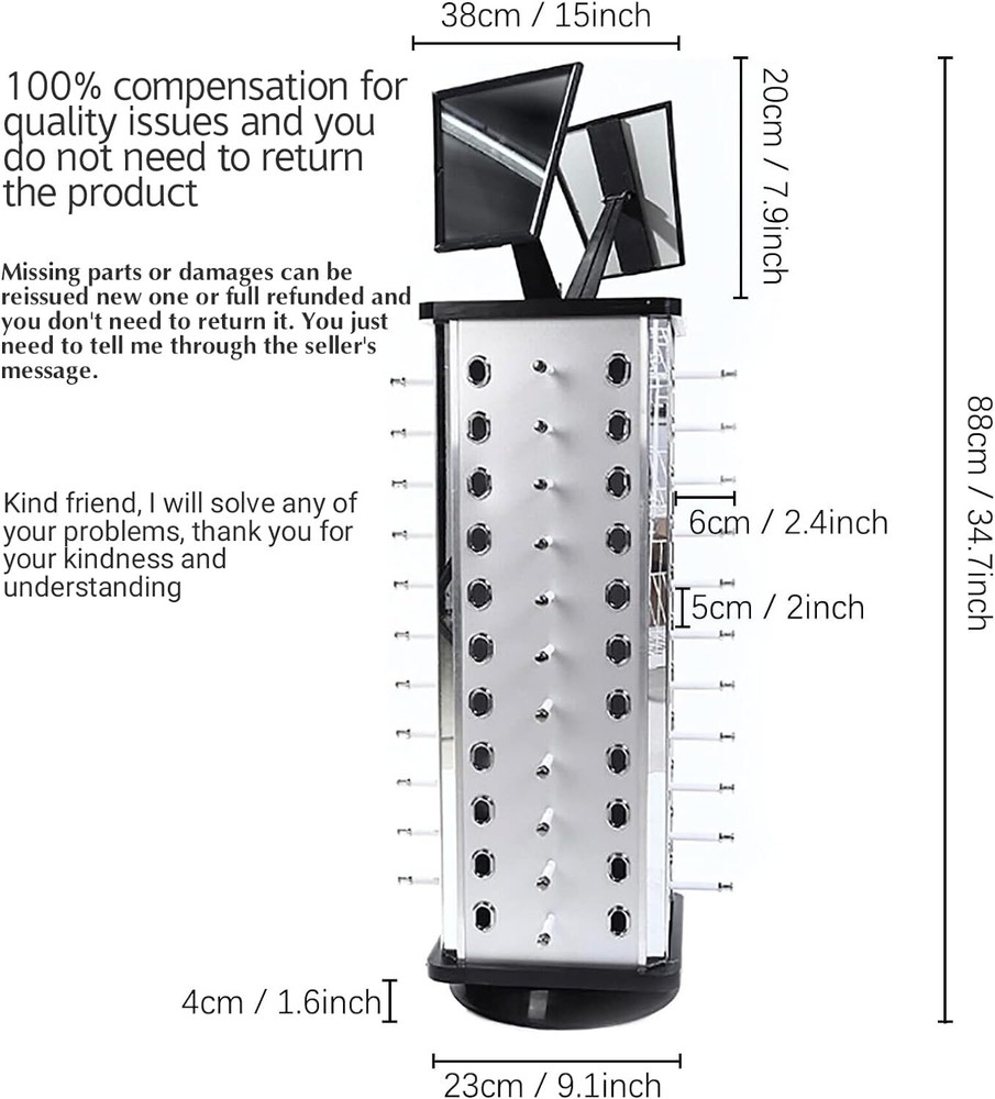 Specifications: Shape:Square Material: Aluminum +Plastic+ Mirror Size:see Picture Package Include: 1 X Glass Display Rack Eyeglasses Holder 44Pair Sunglasses Stand Sunglasses Display Rack 360?? Rotating Product Description Why choose us? Design 1. Can hanging 44 pairs of sunglass or eyeglass, Large capacity, but only covers a diameter of 23cm/9.1 inches. Tall and large sunglasses display stand more fashion. 2. Manual rotation design, 360° display of your sunglasses and various styles of glasses. With 2 top mirror, It is more convenient to try on and choose sunglasses that are suitable for you. 3. Aluminum plastic board material has good rigidity, is more durable, does not deform, does not change color, and has excellent moisture-proof performance, lightweight. This is more practical than acrylic and wooden sunglasses stand. 4.Tow ways to display: It can be suspended horizontally. If the sunglasses are too large, they can be tilted up and down for suspension. Therefore, it can be compatible with various sizes of glasses. Including all installation accessories, it is easy to assemble disassemble, transport. 100% compensate for lost or damaged goods, please tell me Don’t hesitate to buy it. Sunglasses display stand glasses stand sunglass rack rotating display stand for 44 pairs glasses or sunglass. Comes with 2 large mirrors, perfect for home sunglass organizer collection or retail display in stores. Perfect display of various types of glasses, sunglasses etc. Eyewear display sunglasses rack glasses display case retail display stand eyeglass holder Specifications: Type: Retail Sunglass Display 44 frames glasses, sunglasses stand display eyewear eyeglasses holder with mirror, turning rotating sunglass holder for multiple glasses Shape:Square Features:360° Rotating, With 2 Mirror Capacity: Hold 44 pairs of glasses Material:Aluminum +Plastic+ Mirror Size: L 23cm/9.1 inch. H 88cm/34.7 inch Include: 1 X Glass Display Rack Dear: (1)Kind friend, Please let me know if you have received any damaged, incorrect, or quality issues with the goods. I will be able to directly compensate you in full or reissue a one, and you do not need to return it. (2)If you need any other solution you need, please let me know and I will provide any solution you want. Include provide return label/ compensation/ reissue goods/ reissue missing parts. Dear, Thank you for your kindness and understanding (3)Note: After sending the message, don't worry. We need to reply to your information within 24 hours, because we have to work from 9.00 p.m. to 6.00 a.m. the next day. Quality problems and damage problems 100% compensation. Rotating eyeglasses display stand countertop sunglasses display stand for 44 pairs of glasses/sunglass, home decor collection/commercial store retail display Dear: (1)Kind friend, Please let me know if you have received any damaged, incorrect, or quality issues with the goods. I will be able to directly compensate you in full or reissue a new one, and you do not need to return it.(2)If you encounter any problems, please let me know and I will provide any solution you want. Thank you for your kindness and understanding (3)I usually go to work between 9pm and 6am to reply to your messages Payment Delivery details Terms of sales About us Contact us Payment We accept ebay payment 。 Fees such as import duties, taxes are not included in the item price or shipping costs. These charges are the buyer's responsibility. Delivery details Shipping: 2-9 working days to: USA Terms of sales We maintain high standards of excellence and strive for hundred percent customer satisfaction. Feedback is very important to us. We hope that you contact us immediately before you give neutral or negative feedback, so that we can address your concerns. It is impossible to address issues if we do not know about them! About us Your satis faction is our ultimate goal. We work hard to earn your trust and future business. Our certified technicians have tested each item before shipping. The unit comes with 1 year limited warranty on all manufacturing defects. a) If you receive a defective item, you may return it or ask for a discount. Please contact us within 14 days after you receive the package. b) What you returned must be intact and in its original packaging as re? u. Customer is responsible for shipping costs of the returned item. c) We will cover the cost of shipping back t with the shipping rate indicated in the registration page. We will send you a new unit or refund the full payment you paid. Thank you. Contact us Business Hour Business Hour: Monday To Friday: 8:30 AM to 5:00 PM (Beijing China time) Due to time zones, our reply to your questions may not be immediately. But within above working time, we will reply your email within 24 hours. If it's non-workdays, please kindly be patient and wait till Monday. Please contact us with ebay message. Please feel free to contact us if you have any questions. Monday To Friday: 8:30 AM to 5:00 PM (Beijing China time) Due to time zones, our reply to your questions may not be immediately. But within above working time, we will reply your email within 24 hours. If it's non-workdays, please kindly be patient and wait till Monday. Please contact us with ebay message. Please feel free to contact us if you have any questions. Brand Unbranded Type glass display Material Aluminum +Plastic+ Mirror MPN Does Not Apply To Fit Glasses Color Silver Theme Rotating Square Sunglass Holder Features With Mirror Department Unisex