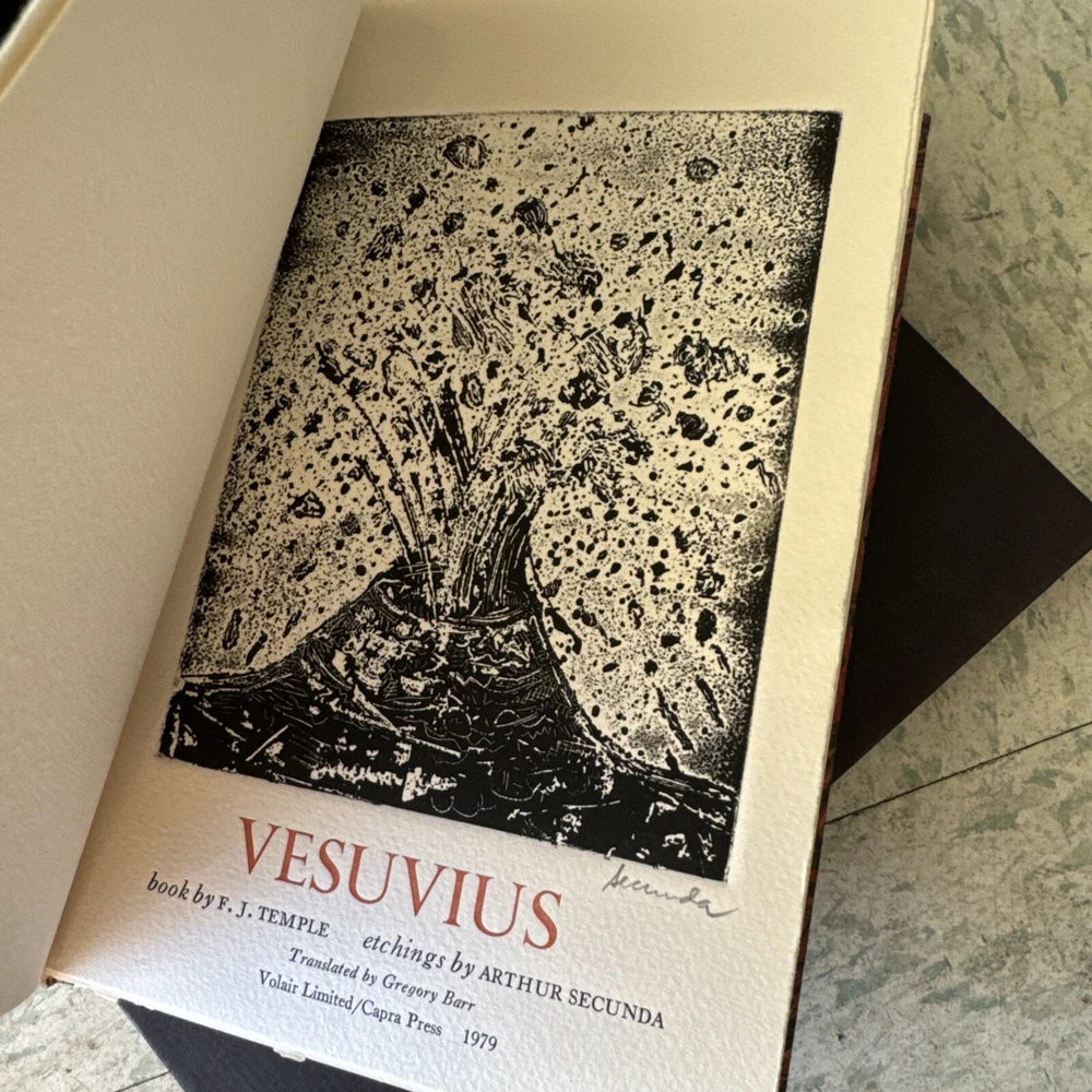 This is a limited edition book titled "F J Temple & Secunda - Vesuvius" from 1979. It is numbered 1 of 250 and signed by the author. The book is a hardcover with a dust jacket, published by Volair / Capra Press in Kent, OH. It is an original printing.
