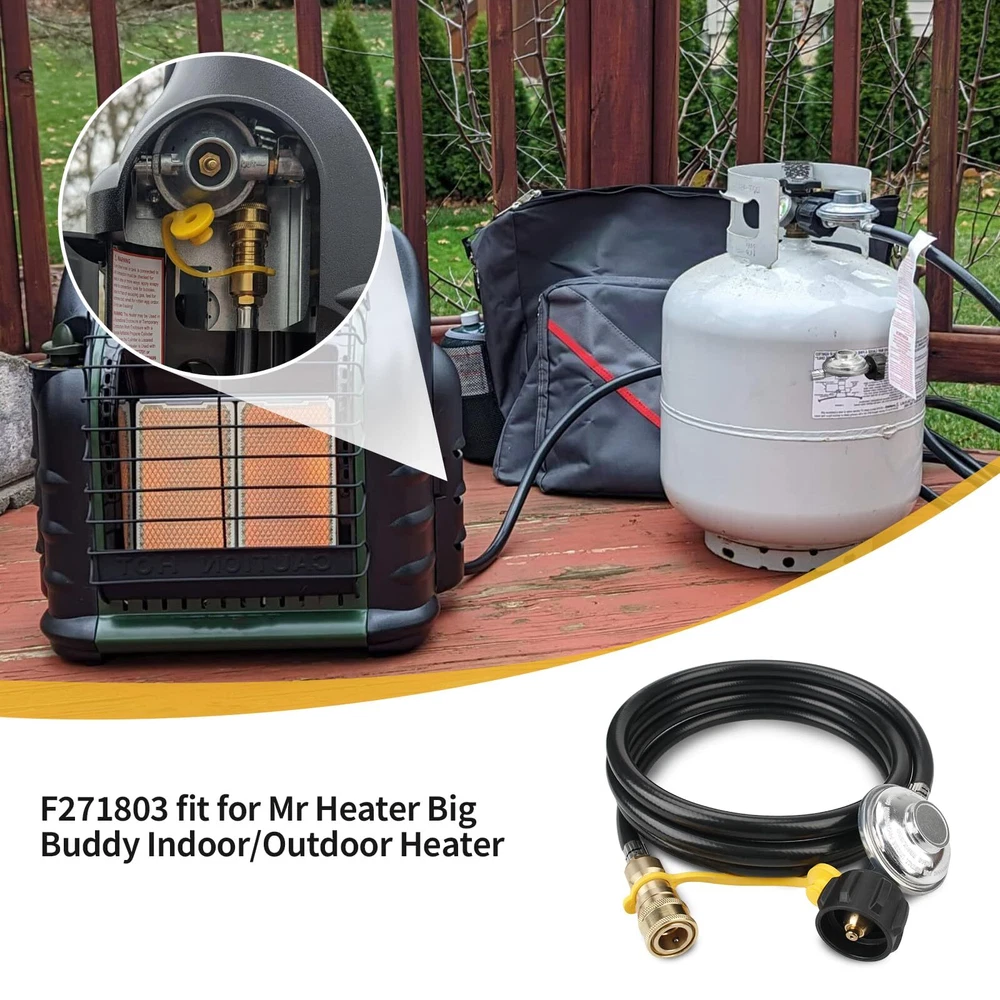 Only fit for Mr. Heater Big Buddy: The propane regulator hose assembly replacement for use on Mr. Heater MH18B & F274830 Big Buddy indoor / outdoor heater. This quick connect hose only work on Big Buddy models, so please don't be for other heater models buy it 3/8” Quick Connect & QCC1 connection (Type 1) & Regulator. Female quick connect fits standard 3/8 male quick connect (SAE fitting). QCC 1 connection hook to a 5lb-40lb propane tank cylinder Quality Propane Hose Regulator: High hose is made of high-quality brass and rubber tubing connection, high-quality air tightness, can prevent air leakagecan prevent air leakage Easy to Install: The 8 feet propane hose with regulator are ready to use right out of the box. Connect the POL connector directly to the propane tank and tighten the connector by hand, no tools required Note:Please confirm the model and size before purchasing. If you have any questions about our F271803 8 FT propane hose with regulator, whether it is pre-sales or after-sales, please feel free to contact us through Amazon support for greater assistance