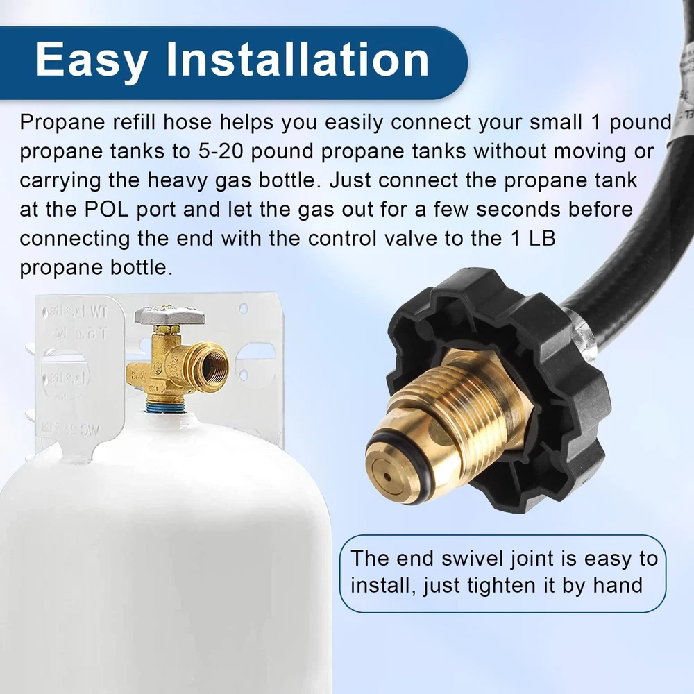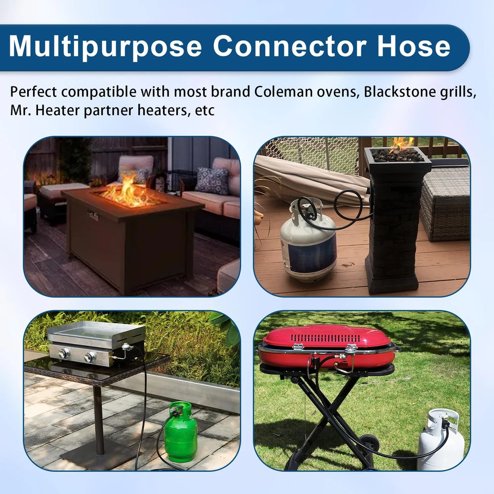 Propane Adapter Hose Compatibility: F273704 propane hose fit for Mr. Heater Mr Buddy series, 12-foot propane hose with adapter fittings assembly with Mr.Heater MH9B Portable Buddy and MH18B Big Buddy,Blackstone griddle,Coleman camping stove and more. Propane hose adapter 1lb to 20lb",and with more heater equipment and propane tanks Propane Tank Hose Adapter: for Mr Heater adapter hoses parts are widely used for 1 lb propane tanks to 5-20 lb propane tanks and equipment,also available for more types of propane tanks,ideal for lanterns, gas grills, heaters, cookers, camping stoves,and fire pit tables,portable grills,camping,tailgating,tabletop grills,heating or outdoor picnics and more propane equipment,and so on Easy to Install: POL connection attaches directly to propane tank without needing any tools. The end swivels of the hose are easily tightened by hand, simply hand-tighten the swivel ends to secure it, can be directly connected onto the RV’s low-pressure propane supply, make sure both ends are tightened for safe and reliable usage Safe and Reliable: heater adapter hose is CSA certified as safe and reliable, provide a safe, gas-tight connection between the heater and the tank with no gas leakage to ensure the safety of users of the heater, no regulator or gas problems, and the airflow is kept stable and at an appropriate level Excellent Material: 12-ft propane stove hose extension is made of high-quality rubber, leak-proof, explosion-proof, wear-resistant, corrosion-resistant; Propane stove adapter hose connector sections crafted from solid brass, provides secure connection between appliance and tank, durability, and safe, leak-free operation Please Note: This is a non-OEM product. Any use of brand names or model designations for this product is made solely for demonstrating compatibility. We will resolve your hose questions as soon as possible and want to ensure that each customer has a great experience