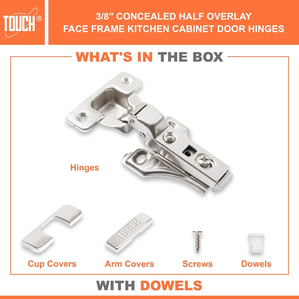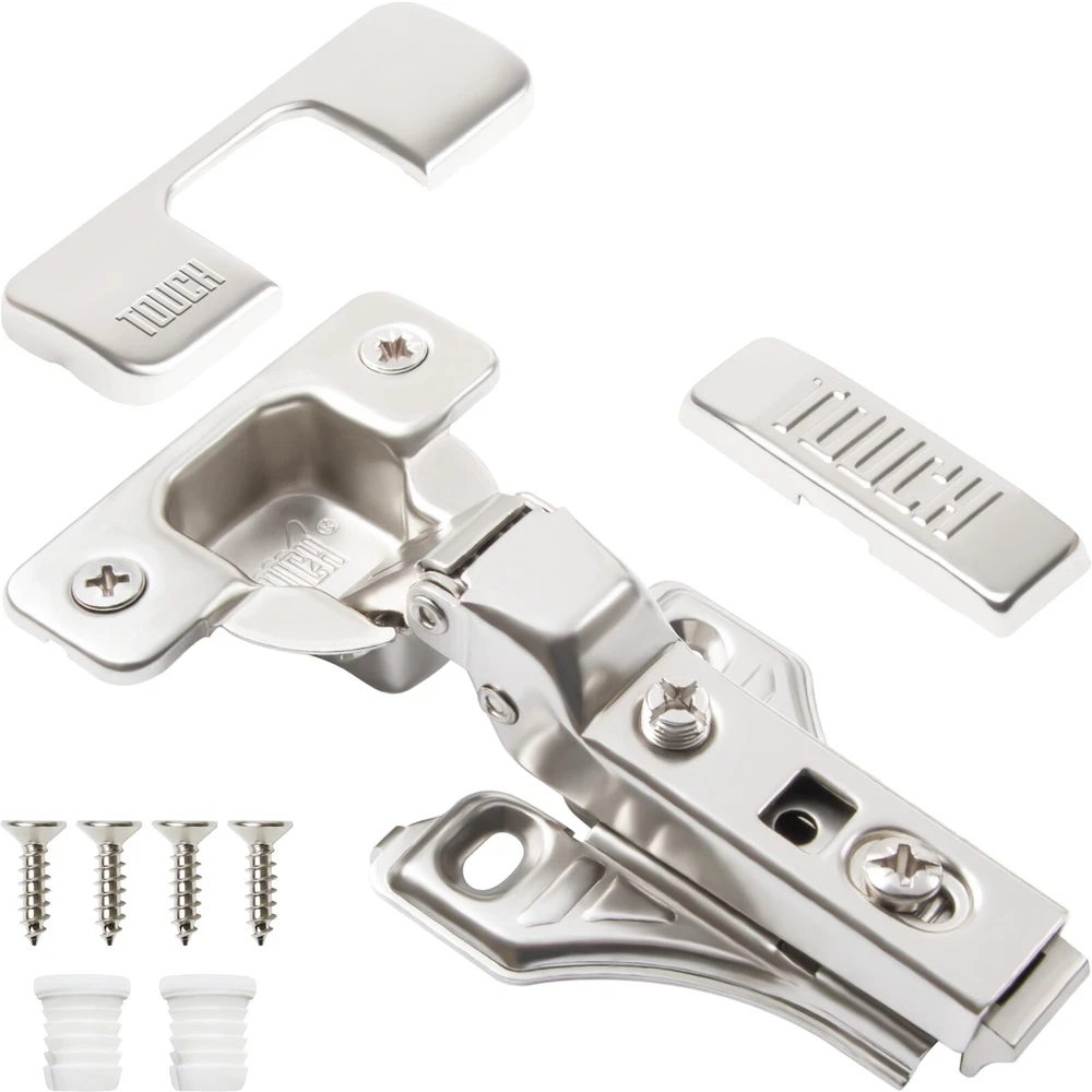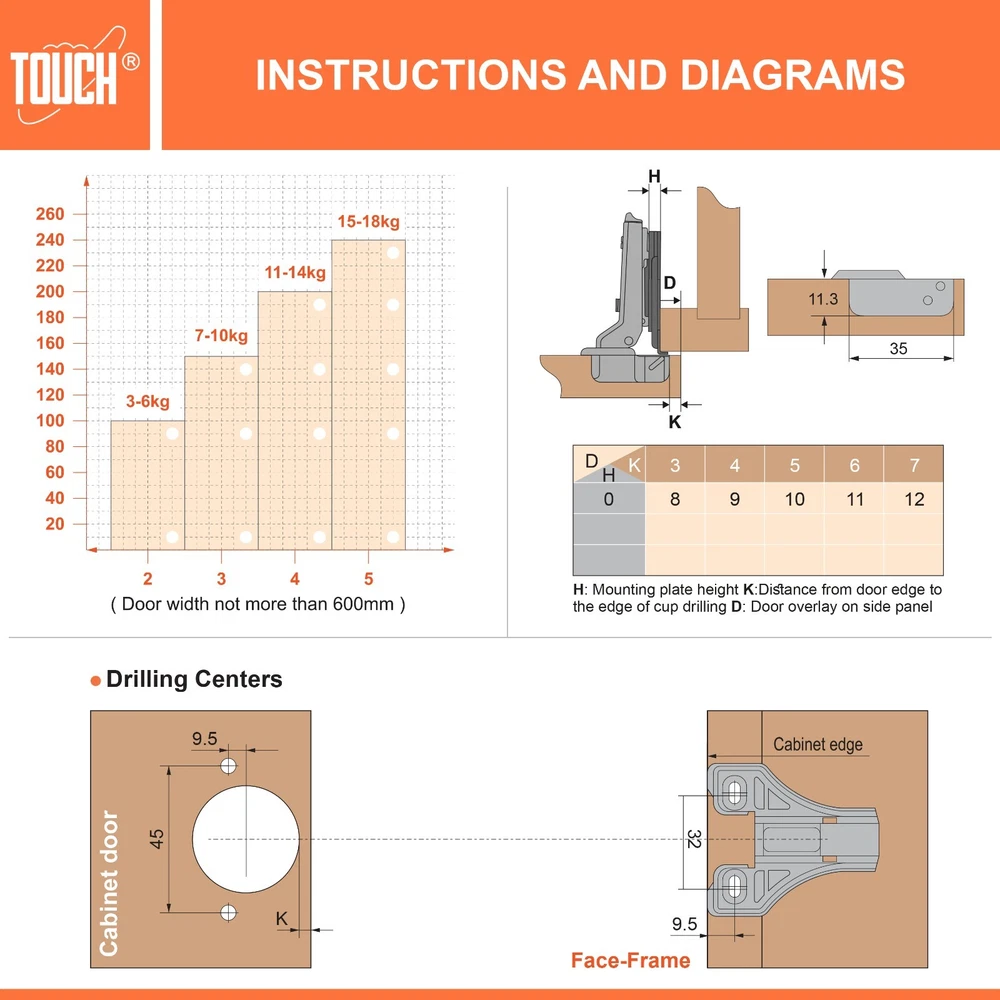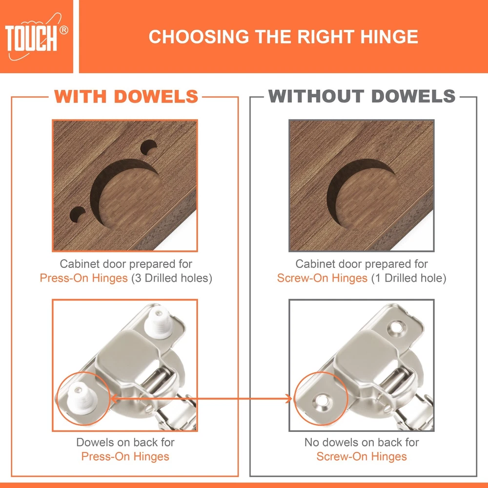 High-Quality Products TOUCH Cabinets Hardware is committed to providing a high-quality cabinet hardware, such as Door Hinges, Drawer Slides, and other kitchen cabinets hardware. Why TOUCH? Unlike other hinges, TOUCH clip on self close heavy duty cabinet hinges come with either dowels or screws, with two holes on both the door side and the cabinet side to secure the hinge, and a mounting plate. The hinge’s clip on design allows you to connect and disconnect with ease. TOUCH hinges are height, depth and side adjustable, leaving no room for awkward angles! Your satisfaction is our main priority, and we trust that our product will meet your needs. A 30-days full return/replacement is offered if faced with any obstacles, NO questions asked! EUROPEAN HINGE WITH NEW CLIP-ON (LATCH) FOR EASY AND SECURE CONNECT AND DISCONNECT THE HINGE FROM THE MOUNTING PLATE Keep your kitchen cabinets easy to open and simplify your kitchen setup with these self-closing kitchen cabinet hinges. The kitchen cabinet door hinges pull the cabinet door shut after being opened and released so that you do not need to worry about closing the cabinet doors with your hands full of food. Constructed with durable cold-rolled steel with a sleek nickel-plated finish, these high quality and heavy duty hinges for cabinets are easy to install onto your kitchen cabinets, bathroom cabinets, wall cabinets and furniture cabinets. Our European cabinet hinges can be used with new cabinets or as a cabinet hinges replacement for old hinge hardware. These cabinet door hardware hinges feature an opening angle of 110 degrees, and the concealed cabinet hinges include plastic dowels for easy installation, arm and cup covers to give the kitchen cabinet hardware hinges a sleek, refined appearance. SPECIFICATIONS Application: Face frame or frameless cabinet Closing type: Self Close (NOT SOFT CLOSING) Mounting type: Screw-on or with dowels Opening angle: 110° Degree Diameter of hinge cup: 35mm Height of hinge cup: 11.3mm Distance of cup holes centers: 45mm Door thickness: 14-21mm CLOSING TYPE Self close (NOT SOFT CLOSE), door close fast automatically at certain angle. ADJUSTMENT 3-Way adjustment for easy adjust and precise Installation. OPENING 110° degree opening angle it’s easier to open doors to suit your kitchen needs.