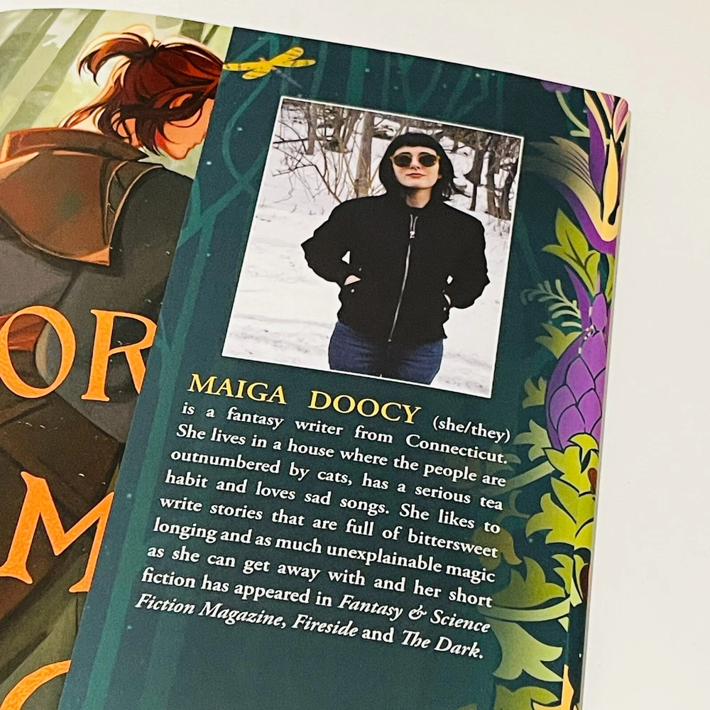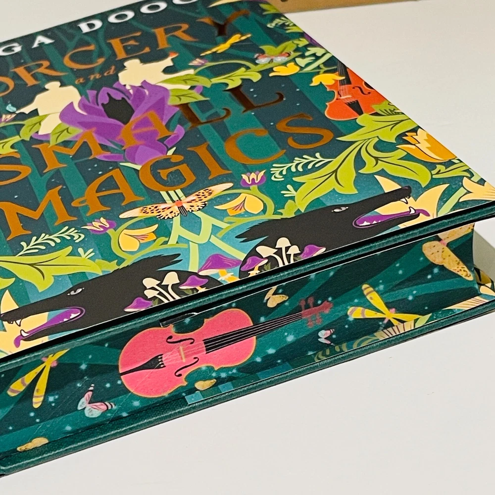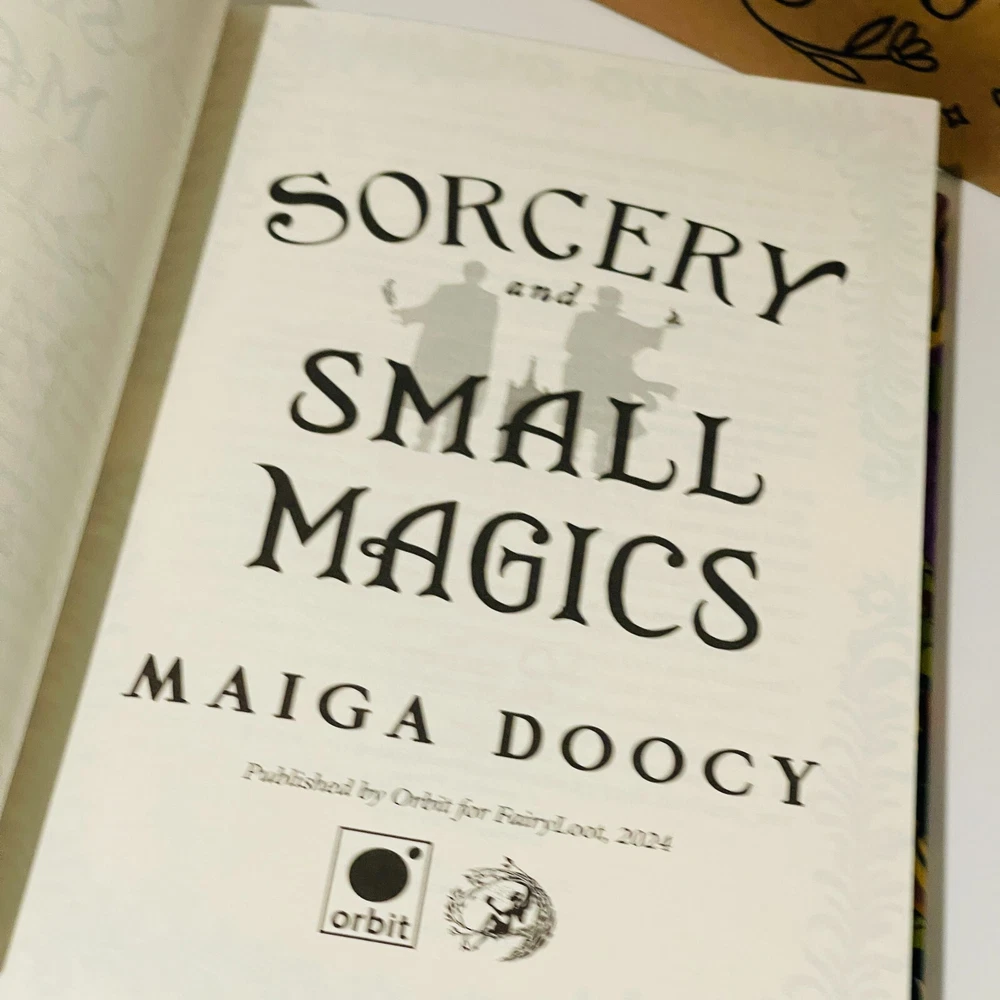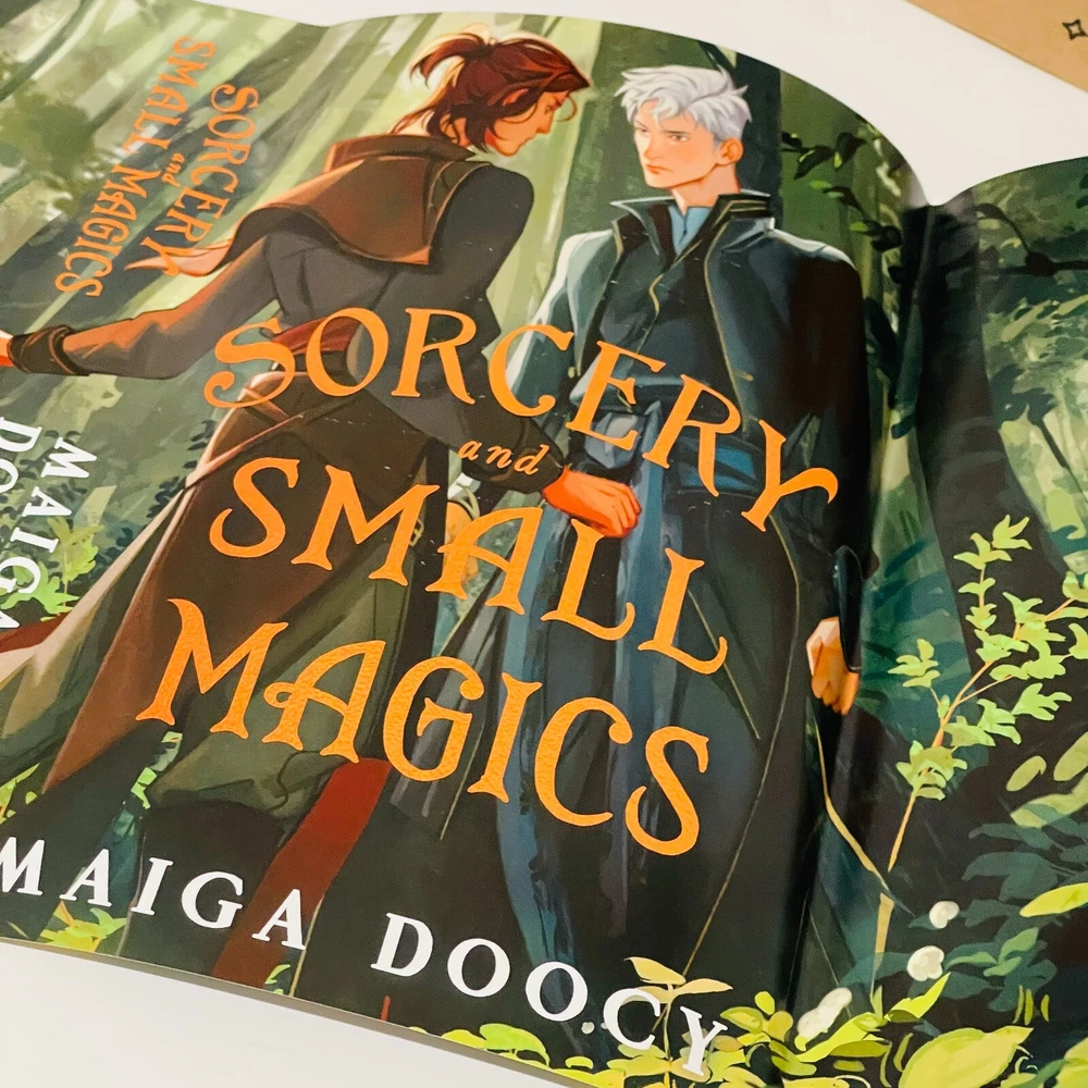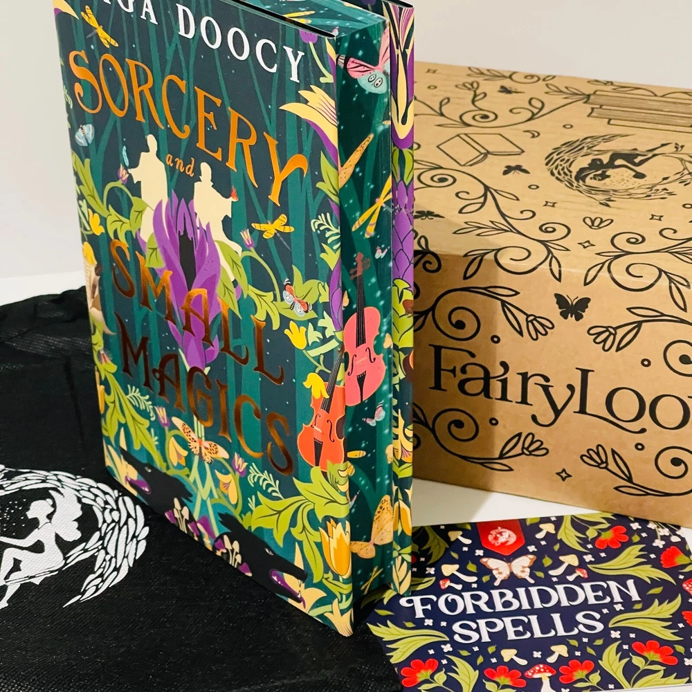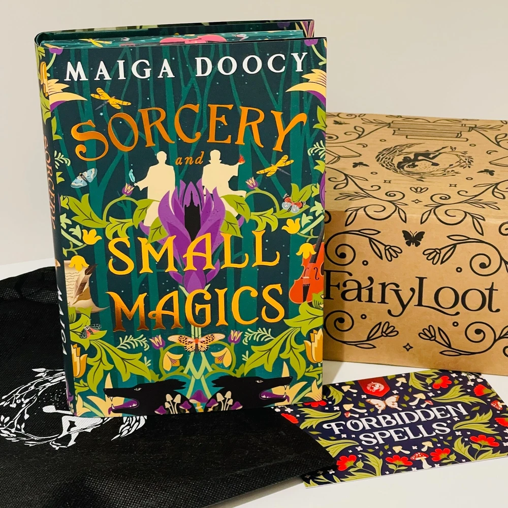 Sorcery and Small Magics by Maiga Doocy FAIRYLOOT Exclusive October Edition Leovander Loveage is a master of small magics. He can summon butterflies with a song, or turn someone’s hair pink by snapping his fingers. Such minor charms don’t earn him much admiration from other sorcerers (or his father), but anything more elaborate always blows up in his face. Which is why Leo vowed years ago to never again write powerful magic. That is, until a mix-up involving a forbidden spell binds Leo to obey the commands of his longtime nemesis, Sebastian Grimm. Grimm is Leo’s complete opposite—respected, exceptionally talented, and an absolutely insufferable curmudgeon. The only thing they agree on is that getting caught using forbidden magic would mean the end of their careers. They need a counterspell, and fast. But Grimm casts spells, he doesn’t undo them, and Leo doesn’t mess with powerful magic. Chasing rumors of a powerful sorcerer with a knack for undoing curses, Leo and Grimm enter the Unquiet Wood, a forest infested with murderous monsters and dangerous outlaws alike. To dissolve the curse, they’ll have to uncover the true depths of Leo’s magic, set aside their long-standing rivalry, and—much to their horror—work together. Even as an odd spark of attraction flares between them. . EXCLUSIVE REDESIGNED COVER REVERSIBLE DUST JACKET FOIL ON THE HARDCOVER DIGITAL SPRAYED EDGE SIGNED BY THE AUTHOR, AUTHOR LETTER Maiga Doocy BONUS CONTENT Hardcover brand new book with Fairyloot Bag