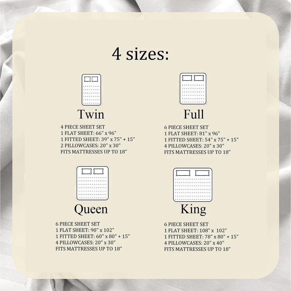 Transform your bedroom into a haven of comfort and style with our exquisite 6 Piece Sheet Set. This meticulously crafted set includes everything you need for a restful night's sleep - one flat sheet, one fitted sheet, and two pillowcases. Each piece is made from a luxurious and soft material, ensuring a cozy and inviting sleeping surfaceOur sheet set is tailored for Full-sized bedsQueen Size: 6 Piece Sheet Set1 Flat Sheet: 90 X 1021 Fitted Sheet: 60 X 80 + 15"4 Pillowcases: 20 X 30Fits Mattresses Up To 18" Free Shipping Over $49.99* Details FAITH, HOPE, LOVE HOME DÉCOR 6 Piece Queen Stripe Sheet Set includes 1 Flat Product Description: Transform your bedroom into a haven of comfort and style with our exquisite 6 Piece Sheet Set. This meticulously crafted set includes everything you need for a restful night's sleep - one flat sheet, one fitted sheet, and two pillowcases. Each piece is made from a luxurious and soft material, ensuring a cozy and inviting sleeping surfaceOur sheet set is tailored for Full-sized bedsQueen Size6 Piece Sheet Set1 Flat Sheet90 X 1021 Fitted Sheet60 X 80 + 15"4 Pillowcases20 X 30Fits Mattresses Up To 18"