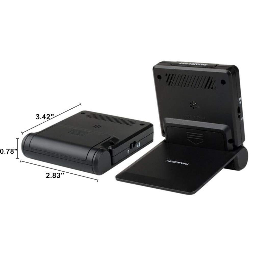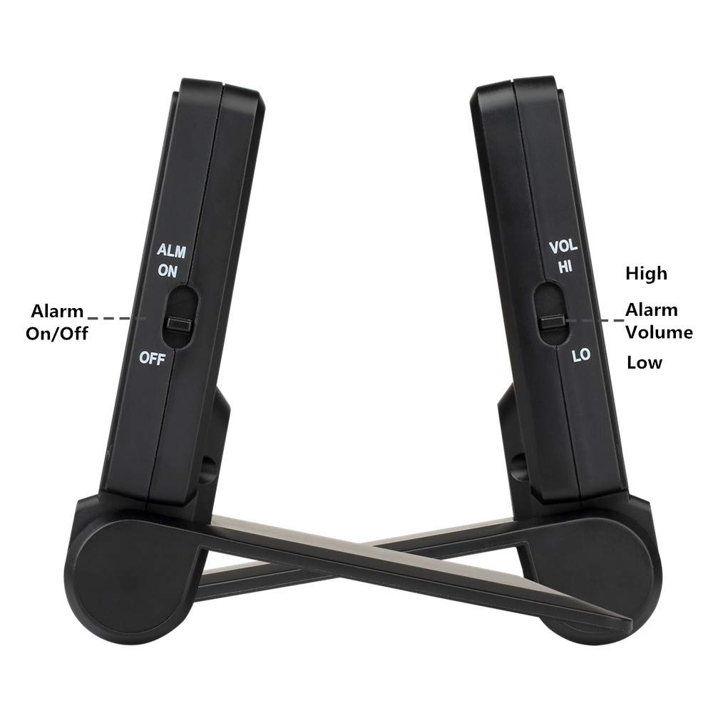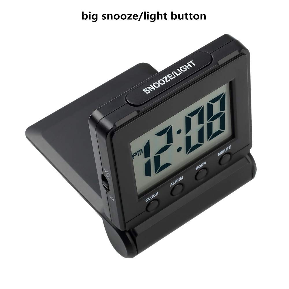 Simple Folding Travel Alarm Clock COMPACT LIGHTWEIGHT This clock has a flip-out stand that can fold over to make a cover to protect the screen and your settings when packed.It is compact and lightweight.Perfect for travelling and can be used every day at home too EASY-TO-READ BOLD NUMBERS Bold numbers on the clear screen make it easier to see the time even across the room ALARM VOLUME HIGHT/LOW OPTIONS The alarm is reasonably loud without being shocking.It starts to beep slowly and then gets faster for 2 minutes to gently wake you up.Moreover the alarm volume has high and low options to meet your need EASY TO STOP THE ALARM No more fumbling.Just press any of the four buttons on front to stop the alarm for fast access especially when you are half awake.And it is very easy to set the time and alarm,it is just simple and clear SNOOZE BACKLIGHT Big light button on the top can be easily reached out and touched to light up the screen for a few seconds to see the time in dark.The welcome snooze function offers you another 5 minutes sleep each time it is initiated Product Specification Size:2.83*3.42*0.78in Weight:0.15lb Requires 2 AAA battery(NOT INCLUDED) Package include 1 x clock 1 x instruction manual Warranty Money back guaranteed with no question asked if not satisfied with the product COMPACT LIGHTWEIGHT-The flip-out stand can fold over to make a cover to protect the screen and your settings when packed.This folding clock is compact and lightweight,perfect for travelling as well as for everyday use at home.It only requires 2 AAA battery(not included) with low power consumption EASY TO SET UP-It is very easy to set up without tricky operations.The buttons dont beep when you press them while setting.Bold numbers on the clear screen make it easier to see the time even across the room.User friendly for children and seniors ALARM VOLUME HIGH/LOW OPTIONS-The alarm is reasonably loud without being shocking.It starts to beep slowly and then gets faster for 2 minutes to gently wake you up.Moreover the alarm volume has high and low options to meet your need EASY TO STOP ALARM-No more fumbling.Just press any of the four buttons on front to stop the alarm for fast access especially when you are half awake.And it is very easy to set the time and alarm which is more accurate than analog alarm clock SNOOZE BACKLIGHT-Big light button on the top can be easily reached out and touched to light up the screen for 5 seconds to see the time in dark.The welcome snooze function can offer you another 5 minutes sleep each time it is initiated