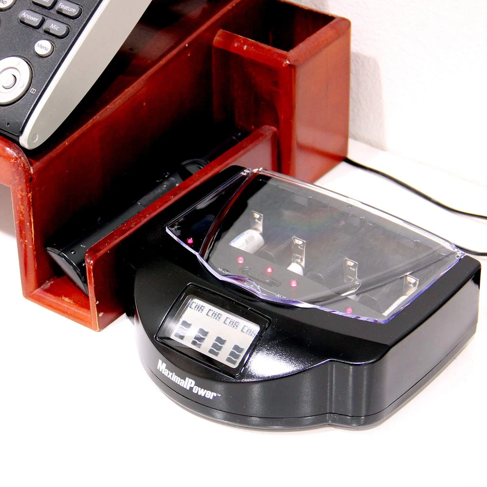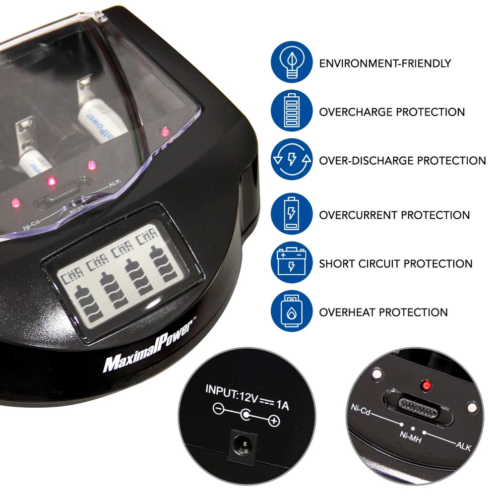 Universal Charging: Give your household batteries more life with this Universal Battery Smart Charger (Mark I) built with 4 independent charging slots to simultaneously charge AA/AAA/C/D and 9V batteries Compatible With: Sliding spring-loaded negative poles on the dock can adjust to differently sized batteries and includes a switch button that changes modes between Ni-Cd, Ni-MH, and Alkaline/RAM charging Charge Protection: Built-in protection circuit prevents batteries from overcharging, over-discharging and over-heating while stopping sudden current fluctuations for a maximized battery charge Smart Display: LCD Display shows a clear and fast reading of the battery mode and charging status of working rechargeable batteries while also being able detect defective or non-rechargeable batteries Backed by Company: provides 1-Year Warranty and Customer Service Support on all of our brand products; Package includes 1x Charger Unit, 1x AC Power Adapter, and 1x User’s Manual (batteries and other accessories not included!)
