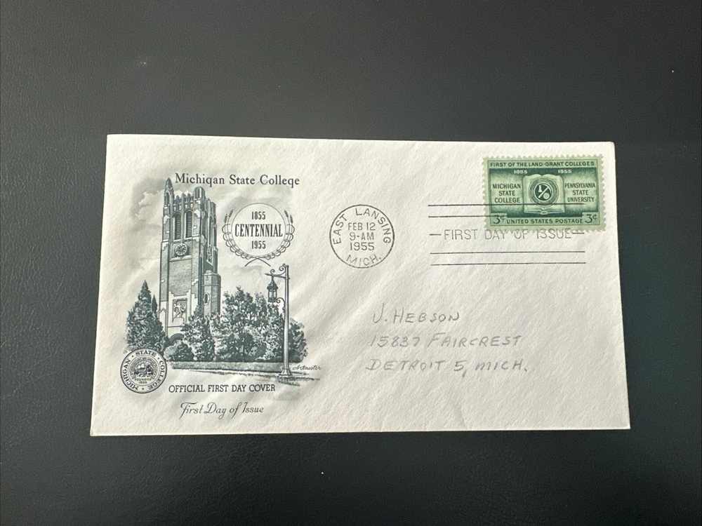 Beautifully Crafted -- Mint Condition -- Comes in Envelope Sleeve Michigan State College Centennial -- 1855-1955 First Day of Issue -- February 12, 1955 Artmaster Cachet *** Some Cachets may have slight discoloration or marks due to aging over time. Please message me with any questions! ***