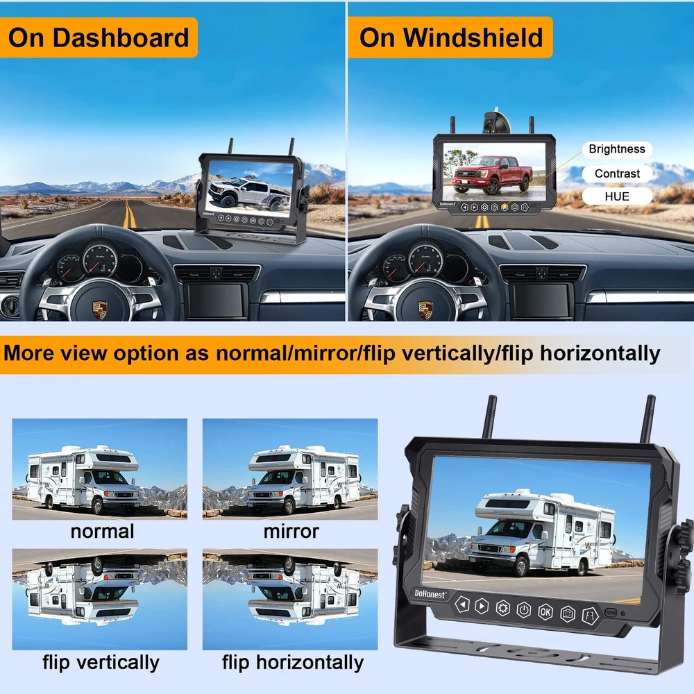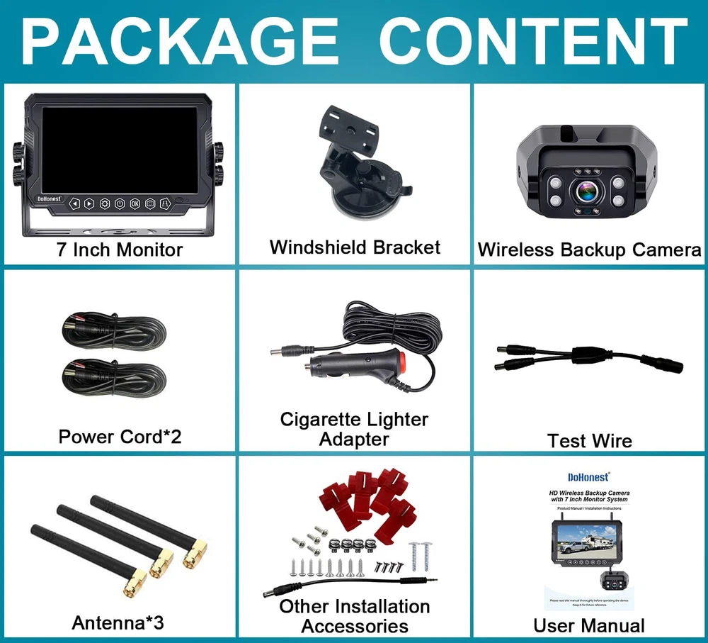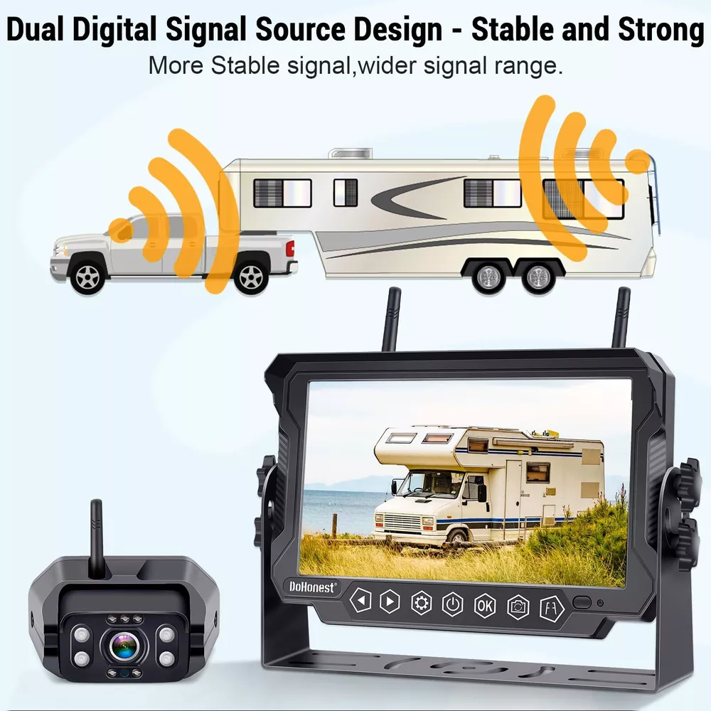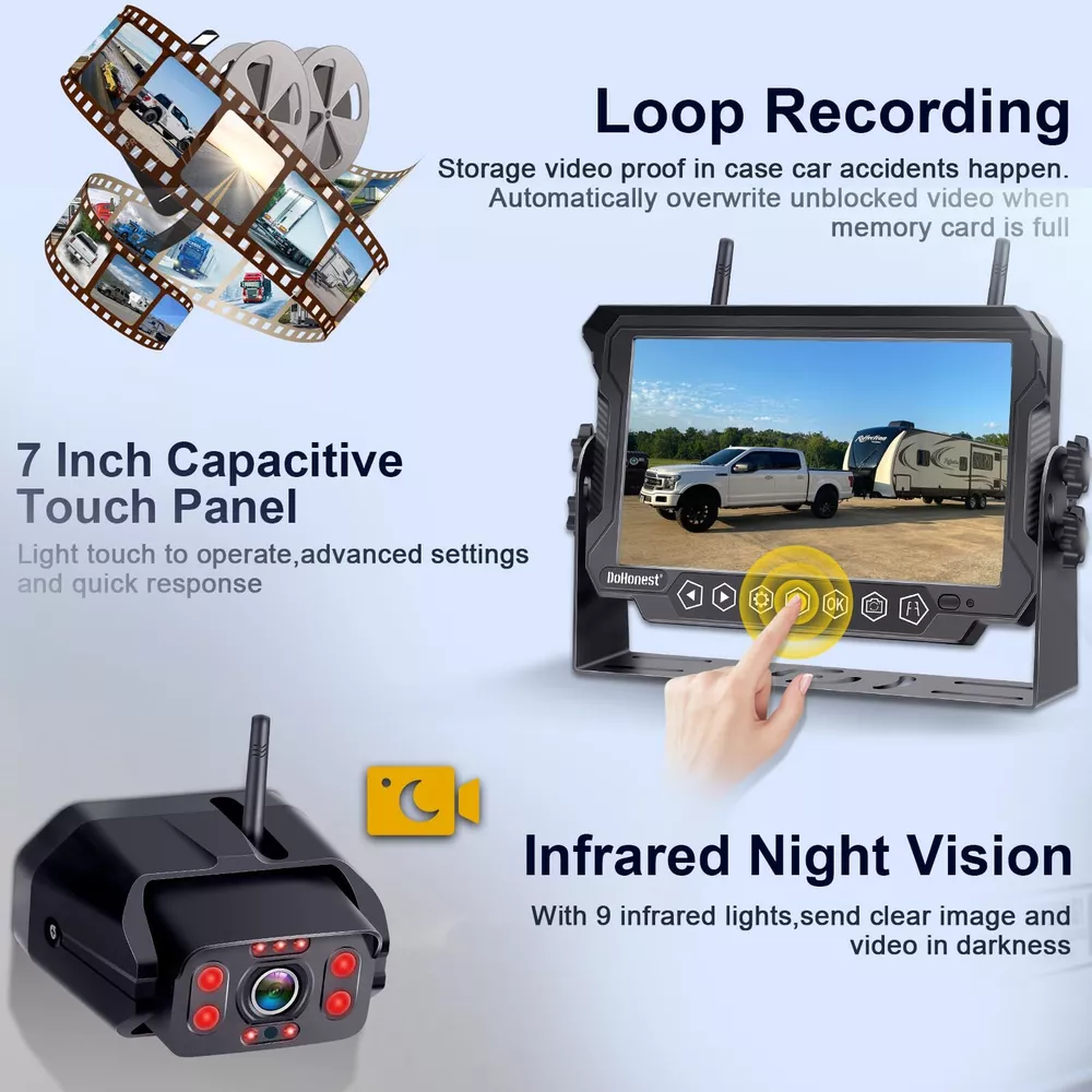 Digital Wireless Rear view camera & 7" Monitor Vehicle Security System Features:1, This system mainly used on Car/Suv/Van/RV/5th Wheel/Truck/Motorhome/Trailers/Campers with No Interference signals HD Clear pictures2, The monitor screen can set default start up/off auto when power come on/off,We provided a car charger adapter with on/off switch to control the monitor.3, The screen picture is 1080P HD clear image. 4, The Camera is IP69K waterproof with 18 LED IR Night Vision5, The system can be set up for reversing or continuous use.6, The monitor with 3 different mounts to hook on dash/windshield/fixed on anywhere as you can(if you need windshield mount,please contact us to get it ).7, We provided instructions manual and video for all customer,contact us if you didn't get it. 8, If you need the windshield mount or longer antenna ,just contact us .9, We provide 2 years warranty 7" Monitor Specification: Effective Pixels: 1920 (H) * 1080 (V) PixelsScreen Size: 7 inchDisplay Component: Color TFT LCDScreen ratio 16:9/4:3 adjustableHousing Material: ABSVideo Frequency: PAL/NTSCPower: DC 9V-35VRear view Camera Specification: Resolution: 1080PLens Viewing Angle: 150 DegreesWaterproof IP Rate: IP69KPower: DC12V-24VPackage Included:1 x 7 TFT Monitor1 x Back up Camera2 x Antennas2 x Power Cable2 x Mount Bracket1 x User Manual1 x Charger Adapter with on/off switch Simple to Install and Easy to Use: rv backup camera wireless has a lightweight, all-in-one design that significantly reduces maintenance costs. It requires no complicated wiring and is plug-and-play, making it easy for even a novice to connect it to a Furrion pre-wired system in less than 10 minutes. rv camera system wireless features the latest capacitive touch-button sensors for easy operation, making it convenient for aging parents to use while traveling. 1080P HD Night Vision Display: trailer backup camera adopts CMOS optical signal sensor, ultra-high definition lens and F2.0 large aperture with precise continuous autofocus system, which can restore the received image 1:1. The infrared function of the wireless backup camera automatically turns on when driving at night. With the assistance of 9 night vision lights, the RV camera can capture ultra-high definition images and details in the darkness of the night to protect your night driving. Powerful Wireless Digital Signal Transmission: RV rear view camera system is equipped with a state-of-the-art 2.4GHz band digital signal transmission module and an intelligent processing unit that enhances system security and stability. It still works efficiently and stably in extreme weather. back up camera for truck. rv has a transmission range of up to 320 feet in open areas, so you can install the camera anywhere in your car without worrying about signal delays or interruptions. HD 4-Channel Monitor: The i.MX series chip built into the trailer camera system wireless provides better performance for the monitor. When the camper backup camera is turned on, the monitor can quickly capture the signals from the camera. The four HD channels can perfectly display the images from the camera, thus providing drivers with all-around monitoring, and you can see horse trailers, RVs, boats, etc. through the monitor while driving. IP69 Rated Wateproof Camera: Backup camera wireless is made of aluminum alloy shell with special glue potting and integration process, which ensures that the camera's waterproof rating reaches IP69, which is 90% more durable than plastic cameras and greatly extends its service life. Expensive materials and unique design process will provide security for your travels, it will never suddenly strike and abandon you on vacation like ordinary cameras. 7" Narrow Bezel Monitor and ABS+PC: 7" rv backup camera wireless with monitor features a narrow bezel design that reduces the space taken up by unnecessary bezels, providing a wider field of view and a better visual experience. The exterior of the monitor is made of ABS+PC material, so the monitor is extremely strong and heat-resistant, even if the monitor is left in the car for a long time under the high temperature and hot sun in summer. Video Recording Function: HD recording and playback function of wireless backup camera for rv is the same as that of the car recorder, which can be used to record unexpected accidents during driving, or to record the scenery during the journey, and the camera can be used as an outdoor security camera when camping outdoors to monitor everything around the RV and ensure camping safety. The loop recording function of the camera provides favorable help for real-time video recording.