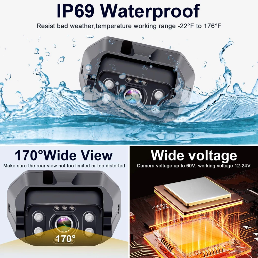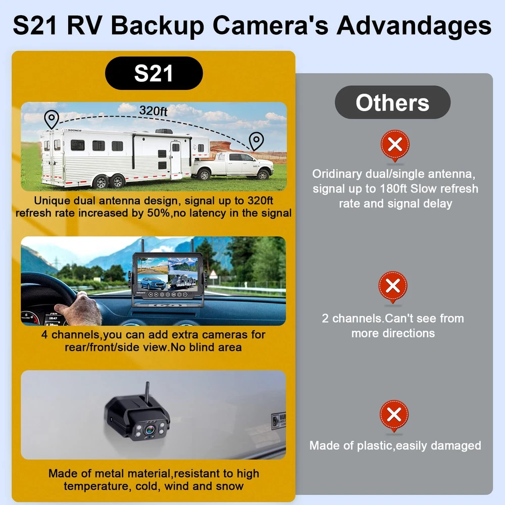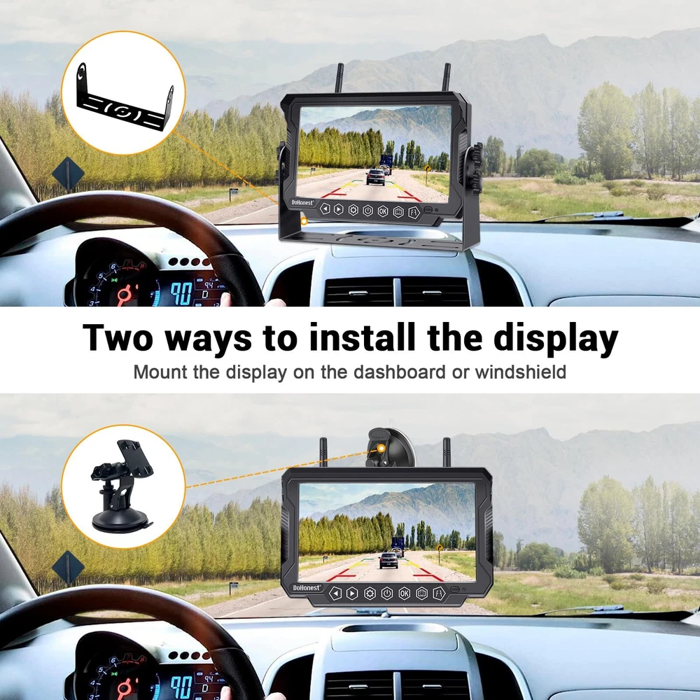 Digital Wireless Rear view camera & 7" Monitor Vehicle Security System Features:1, This system mainly used on Car/Suv/Van/RV/5th Wheel/Truck/Motorhome/Trailers/Campers with No Interference signals HD Clear pictures2, The monitor screen can set default start up/off auto when power come on/off,We provided a car charger adapter with on/off switch to control the monitor.3, The screen picture is 1080P HD clear image. 4, The Camera is IP69K waterproof with 18 LED IR Night Vision5, The system can be set up for reversing or continuous use.6, The monitor with 3 different mounts to hook on dash/windshield/fixed on anywhere as you can(if you need windshield mount,please contact us to get it ).7, We provided instructions manual and video for all customer,contact us if you didn't get it. 8, If you need the windshield mount or longer antenna ,just contact us .9, We provide 2 years warranty 7" Monitor Specification: Effective Pixels: 1920 (H) * 1080 (V) PixelsScreen Size: 7 inchDisplay Component: Color TFT LCDScreen ratio 16:9/4:3 adjustableHousing Material: ABSVideo Frequency: PAL/NTSCPower: DC 9V-35VRear view Camera Specification: Resolution: 1080PLens Viewing Angle: 150 DegreesWaterproof IP Rate: IP69KPower: DC12V-24VPackage Included:1 x 7 TFT Monitor1 x Back up Camera2 x Antennas2 x Power Cable2 x Mount Bracket1 x User Manual1 x Charger Adapter with on/off switch Simple to Install and Easy to Use: rv backup camera wireless has a lightweight, all-in-one design that significantly reduces maintenance costs. It requires no complicated wiring and is plug-and-play, making it easy for even a novice to connect it to a Furrion pre-wired system in less than 10 minutes. rv camera system wireless features the latest capacitive touch-button sensors for easy operation, making it convenient for aging parents to use while traveling. 1080P HD Night Vision Display: trailer backup camera adopts CMOS optical signal sensor, ultra-high definition lens and F2.0 large aperture with precise continuous autofocus system, which can restore the received image 1:1. The infrared function of the wireless backup camera automatically turns on when driving at night. With the assistance of 9 night vision lights, the RV camera can capture ultra-high definition images and details in the darkness of the night to protect your night driving. Powerful Wireless Digital Signal Transmission: RV rear view camera system is equipped with a state-of-the-art 2.4GHz band digital signal transmission module and an intelligent processing unit that enhances system security and stability. It still works efficiently and stably in extreme weather. back up camera for truck. rv has a transmission range of up to 320 feet in open areas, so you can install the camera anywhere in your car without worrying about signal delays or interruptions. HD 4-Channel Monitor: The i.MX series chip built into the trailer camera system wireless provides better performance for the monitor. When the camper backup camera is turned on, the monitor can quickly capture the signals from the camera. The four HD channels can perfectly display the images from the camera, thus providing drivers with all-around monitoring, and you can see horse trailers, RVs, boats, etc. through the monitor while driving. IP69 Rated Wateproof Camera: Backup camera wireless is made of aluminum alloy shell with special glue potting and integration process, which ensures that the camera's waterproof rating reaches IP69, which is 90% more durable than plastic cameras and greatly extends its service life. Expensive materials and unique design process will provide security for your travels, it will never suddenly strike and abandon you on vacation like ordinary cameras. 7" Narrow Bezel Monitor and ABS+PC: 7" rv backup camera wireless with monitor features a narrow bezel design that reduces the space taken up by unnecessary bezels, providing a wider field of view and a better visual experience. The exterior of the monitor is made of ABS+PC material, so the monitor is extremely strong and heat-resistant, even if the monitor is left in the car for a long time under the high temperature and hot sun in summer. Video Recording Function: HD recording and playback function of wireless backup camera for rv is the same as that of the car recorder, which can be used to record unexpected accidents during driving, or to record the scenery during the journey, and the camera can be used as an outdoor security camera when camping outdoors to monitor everything around the RV and ensure camping safety. The loop recording function of the camera provides favorable help for real-time video recording.