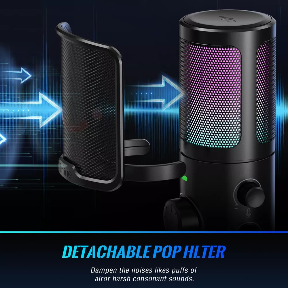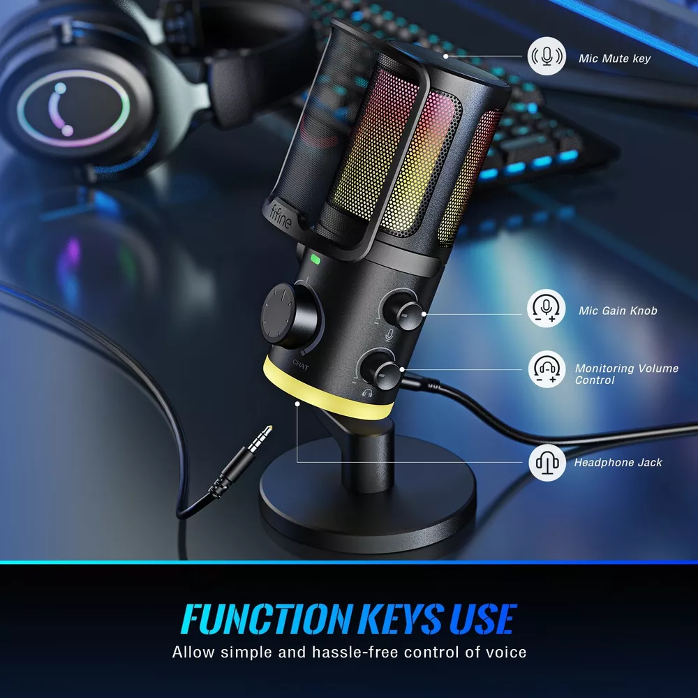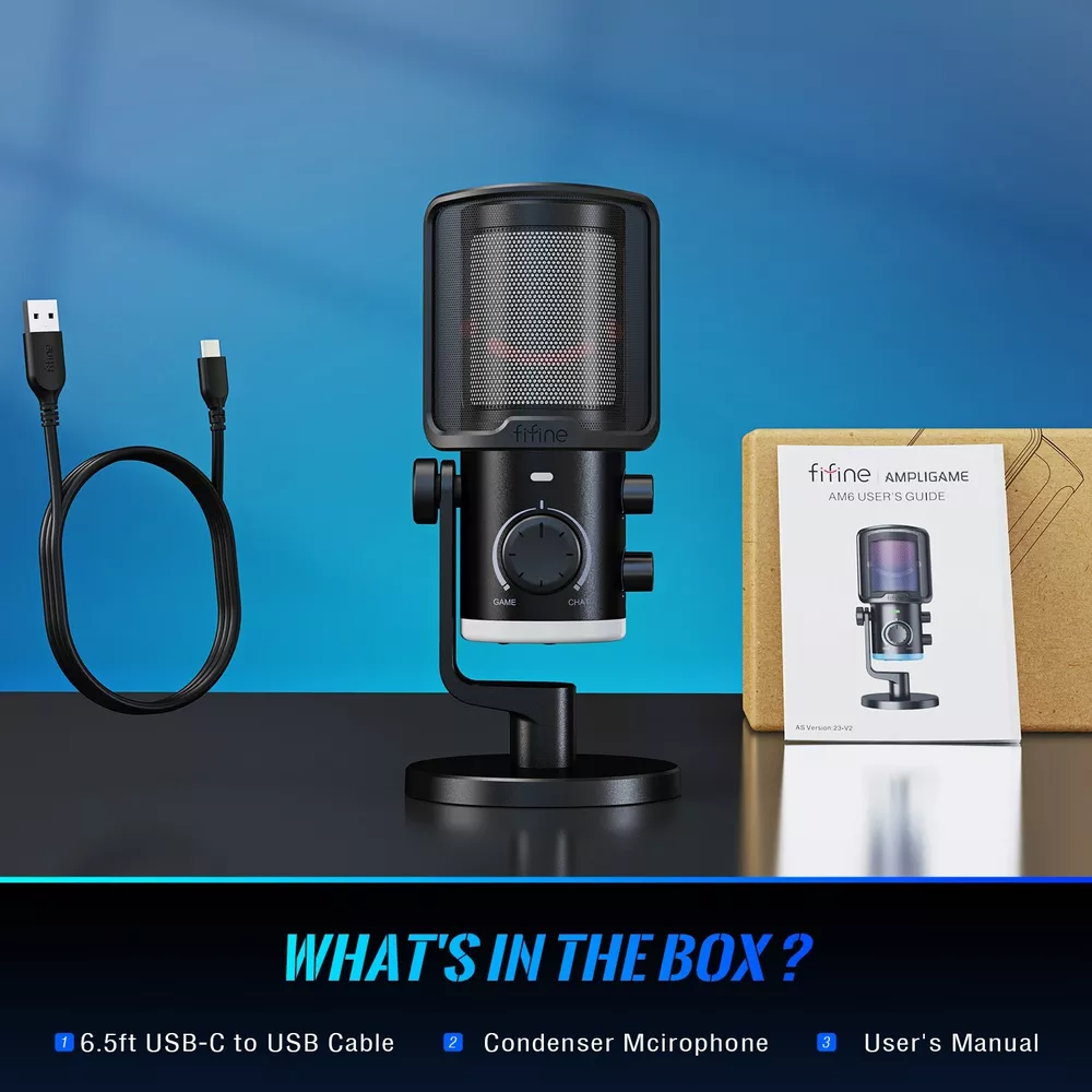 Features: [ Noise-Cancelling for Pure Sound ] Experience pristine audio with our advanced noise.cancelling technology. The condenser mic capsulecombined with a cardioid pickup pattern, deliverssmooth,high-sensitivity sound, capturing vocal nuanceswith remarkable clarity-even the softest whispers.Equipped with one-touch noise reduction technology, theFlFINE AM6 minimizes environmental noise,ensuring amore refined and detailed recording experience. [ Seamlessly Balance Game and Chat Volume ] Finding the perfect balance between game immersionand team communication has never been easier. Tired ofgame sound effects drowning out your teammatesvoices? With AM6, you're in control. Simply adjust theknob to GAME for full immersion in the captivating worldof game sound effects. Need to focus on teamwork? Switch it to CHAT, and your teammates' voices will comethrough crystal clear. [ Total Function Control with AM6 ] Equipped with a 3.5mm headphone jack, you can monitoryour audio in real-time, effortlessly adjusting mic andmonitor volumes with intuitive knobs. Plus, enjoy theconvenience of a touch-sensitive mute button located ontop, complete with an LED indicator for seamless controlover your audio experience. [ llluminate Your Gaming Space with Dazzling RGB Lighting ] The AM6 USB microphone boasts dual light effects withtop and bottom lighting design, adding an electrifyingambiance to your gaming setup. Control the vibrant RGBlights to elevate your gaming experience. The RGBlighting on the streaming mic complements your LED walllights and PC's dynamic colors, while the subtle RGBunderneath the mic harmonizes with your glowing mouseand keyboard. Transform your computer setup into avivid light show with AM6 microphone. You can long press and hold for 3 seconds to turn on or off RGB lighting without affecting the work of the mic. And short press to select 4 kinds of RGB mode and over 10 colors of RGB light. [ More Device Compatibility ] This USB microphone is compatible with Windows PCcomputer laptop, Mac, and PS4/5 that whether you'regaming or streaming, this microphone is the perfectcompanion. Warm Tips: 1. T his PC USB microphone is not compatible with Xbox, but works with desktop, laptop, PS4/PS5. Game/Chat balanced knob function is onlyapplicable to desktop, laptop or Mac, but unavailable for PS4/PS5. 2. Real-time monitoring is not activated by default on PC setup. Follow steps to activate real-time monitoring on PC. Click “Playback” tab from the Sound Panel-Double click “fifine Chat”-Levels-Click the speaker icon of microphone level to activate. 3. It is recommended to keep speaking to the top of this computer gaming microphone within 2-6 inches(5-15cm) to capture loud and clear sound quality, you have to turn the gain knob to a proper level before you use it. Specifications: Type: Condenser Polar Pattern: Cardioid Output Connection: USB Frequency Response: 70 -20 kHz Sensitivity: -42dB±3dB S/N Ratio: 75dB A+ Package included : 1 * Condenser Microphone with Pop Filter and Mic Based Stand 1* 6.5ft (2m) USB C to USB Cable 1* User's Manual Contact us : 1. If you have any questions please contact us by email, most emails are responded within 24 business hours. 2. Please send email directly or try send email by other account. The feedback forum is not the place to leave us a message. If you never hear from us please go to your "Inbox" under eBay "My Messages" section to look for our messages as we always send our messages directly through eBay to your email account and you can always find our messages there regardless of what email problems you may experience.