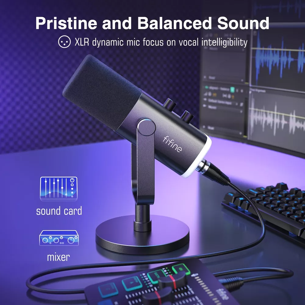 Product description: The FIFINE EAM8 with the honor of red dot design award 2023 winner product, the cardioid pattern dynamic podcast microphone with XLR and USB connector pulls dual duty for play and work. XLR setup by XLR streaming mic. Studio recording microphone rejects unwanted noise to make your audio sounds clear. Plug and Play USB Connection, skip setting hassle to get start quickly. You can quickly control USB podcast microphone dynamic with tap-to-mute. Computer microphone with headphones jack upgrades your rhythm game experience and get feedback whether the real-time voice your audience hear as expected. Get the desired level via monitoring volume control when gaming recording. Suitable for PC Computer gaming, streaming, podcast, broadcast, recording, singsing, vocal ect. Coming with RGB, featured with 3 kinds of RGB modes, including dynamic RGB flowing, breathing gradient and single color choice, presents more than 10 colors. Dynamic microphone USB built with soothing RGB matches your PC making amazing synergy and brings vitality to live streaming. Features: [Natural Audio Clarity] Operated with frequency response of 50Hz-16KHz, the podcasting XLR mic delivers balanced audio range. Directional cardioid dynamic microphone corded will not exaggerate your voice, while rejects unwanted off-axis noise for vocal originality and intelligibility during your gaming streaming video recording.XLR microphone audio cable ensures pristine audio quality, delivering clear and balanced sound reproduction for professional-grade recordings. [XLR Connection Upgrade-Ability] Well-connected and noise-free operation, the podcasting microphone, studio recording microphone grows alongside your studio setup equipment, like sound cards and mixers, which improves vocal speaking audio flexibility to make you explore various types of music recording singing. With a flexible and tangle-resistant design, audio XLR cable allows for easy handling and hassle-free setup, enabling smooth and efficient recording sessions. [USB Connection with Handy Mute] Skip the hassle of setting something up and plug the cable to play the dynamic USB microphone directly, which suits for beginner creators or professionals’ daily podcast or conference work. You can quickly control USB podcast microphone dynamic with tap-to-mute that is independent of computer/Macbook programs to keep privacy when live streaming. LED mute reminder helps you get rid of forgetting to cancel the mute. (Only available for USB connection) [Soothing Controllable RGB] RGB ring on the desktop gaming microphone for PC, with 3 modes and more than 10 light colors collection, matches your PC gears accessories for amazing synergy even in dim room. You can control the RGB key button of the dynamic microphone USB for better game color scheme. Configured memory function, the streaming microphone RGB eliminates repeated selections and brings itself alive when power on. (Only available for USB connection) [Multiple Scene Use] The XLR/USB PC gaming microphone is a one stop shop to pull duties for both play and work, streaming, podcast, broadcast recording. Use the standing desktop microphone for gaming at home studio or take it on the go. Built-in 3/8’’ and 5/8’’ metal threads, the dynamic XLR microphone fits the most boom arm stand without external adapter. Noise-canceling windscreen cover defeats hum from nearby electrical appliances for cleaner audio. Special Features: XLR/USB Dynamic Mic Mic Mute Function Mic Volume Control Headphones Jack Headphones Volume Knob Play and Plug Metal Material Detachable USB Cable Warm Tips: 1. This gaming microphone works well with PC, laptop, Mac, PS4/PS5 via USB connection, but it is NOT compatible with Xbox. 2. The recording studio product comes with a dynamic microphone with shock mount, an 6.5ft (2m) USB C to USB cable, 9.8ft (3m) XLR Cable, a 5/8'' to 3/8'' adapter, a user's Manual (boom arm, mic stand not included). 3. When using XLR connection, it is suggested to use XLR to XLR cable for more stable audio. 4. All function keys are only available for USB connection. 5. It is recommended to keep speaking to the top of this computer gaming microphone within 2-6 inches(5-15cm) to capture loud and clear sound quality, you have to turn the gain knob to a proper level before you use it. Specifications: Type: Dynamic Polar Pattern: Cardioid Output Connection: USB/XLR Max.SPL: 120dB Frequency Response: 50-16kHz Sensitivity: -50dB±3dB S/N Ratio:>80dB Power Supply:5±0.25V Package included : 1 *Dynamic Microphone with Windscreen 1*Mic Based Stand 1*6.5ft (2m) USB C to USB Cable 1*9.8ft(3m) XLR Cable 1*User's Manual Payment : We accept payment by any of the following methods: VISA, MASTERCARD, AMEX, DISCOVER and PayPal. Please pay as soon as possible after winning an auction, as that will allow us to post your item to you sooner! Shipping : 1. We only ship to confirmed Ebay addresses. Your Ebay address must match your Shipping address. 2. If you want to change the address please E-mail us right after you pay for the item. 3. Service transit time is provided by the carrier and excludes weekends and holidays. Transit times may vary, particularly during the holiday season. 4. If you have not received your shipment within 30 days from payment, please contact us. We will track the shipment and get back to you as soon as possible with a reply. Our goal is customer satisfaction! Returns : 1. If an item is damaged on delivery, we must be notified within 3 days off the delivery date, we will then arrange for a replacement or a refund of the item (it needs to be within this time period for us to make claims with our couriers) 2. If you have simply changed your mind or no longer require the item(s), you must notify us within 30 days from receiving your order. The item(s) must be in their original unused and unopened packaging and be in a resalable condition for a full refund. You will need to pay for the cost of returning the item(s) 