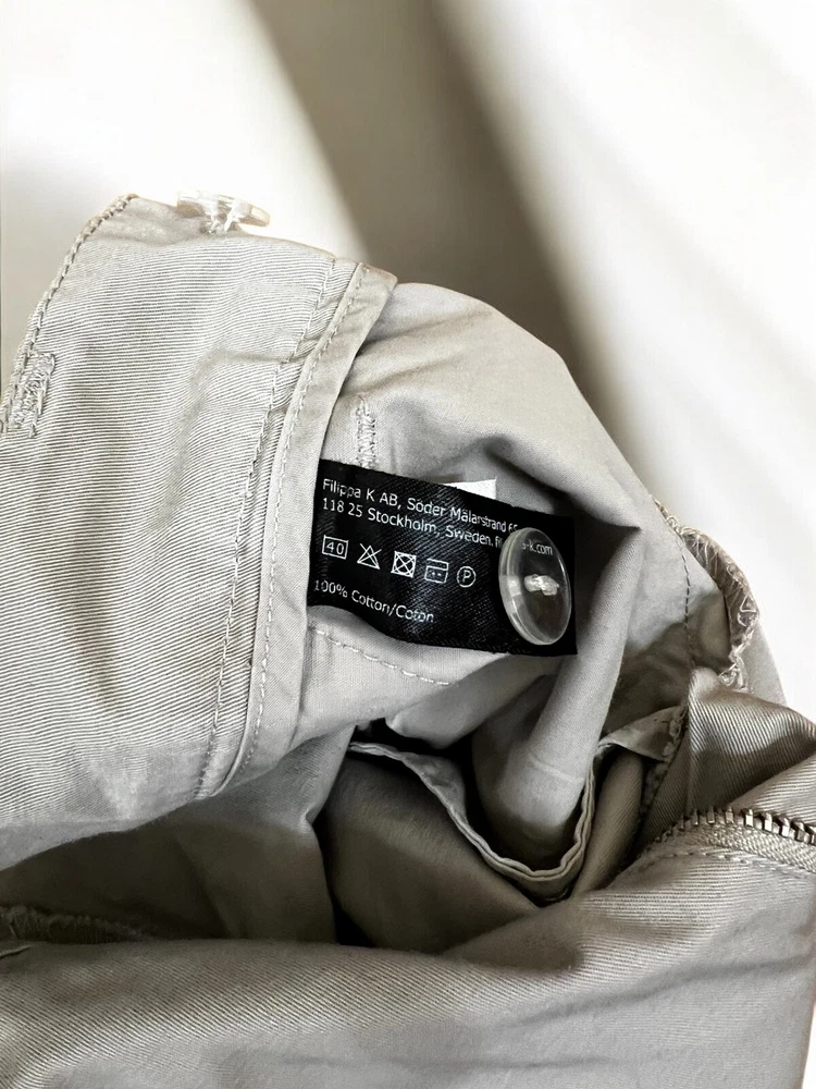 Crafted with a blend of cotton and linen, these gray chino pants from Filippa K offer both comfort and durability. Tailored for a regular fit with a straight leg style, the pants provide a classic look suitable for a variety of occasions. The flat front design, combined with a zip and button closure, creates a smooth silhouette that's ideal for travel, casual outings, or business settings. The size S pants have a 30-inch waist and a 32-inch inseam, ensuring a perfect fit for those who prefer their clothing with a trim and tailored aesthetic. Embrace the simplicity of these solid-patterned trousers as they effortlessly enhance your wardrobe with their versatile appeal and superior craftsmanship. Measurements: Waist: 40 cm Length: 108 cm Inseam: 83 cm Leg opening: 16,5 cm Front rise: 26 cm Back rise: 38 cm Feel free to make me any reasonable price offer.