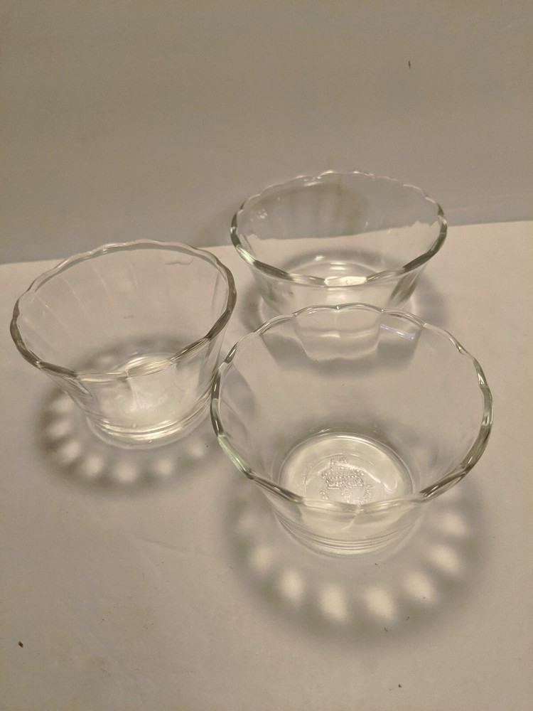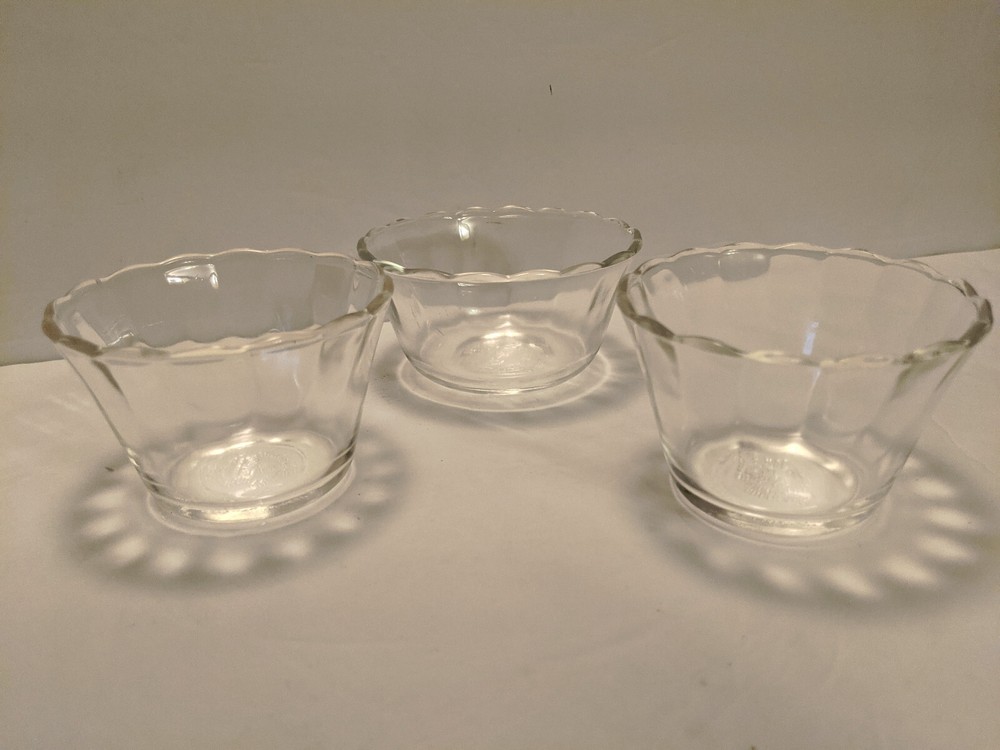 vintage FIRE-KING CUSTARD CUP SET Clear glass with scalloped edge Ad is for 3 cups. 2 different sizes 1 - six ounce 2 - five ounce Comfortably hold about 1/2 cup of ice cream, pudding, dessert, etc. Also handy for holding measured out ingredients while baking or cooking Good shape Clean Ready to use Free ship