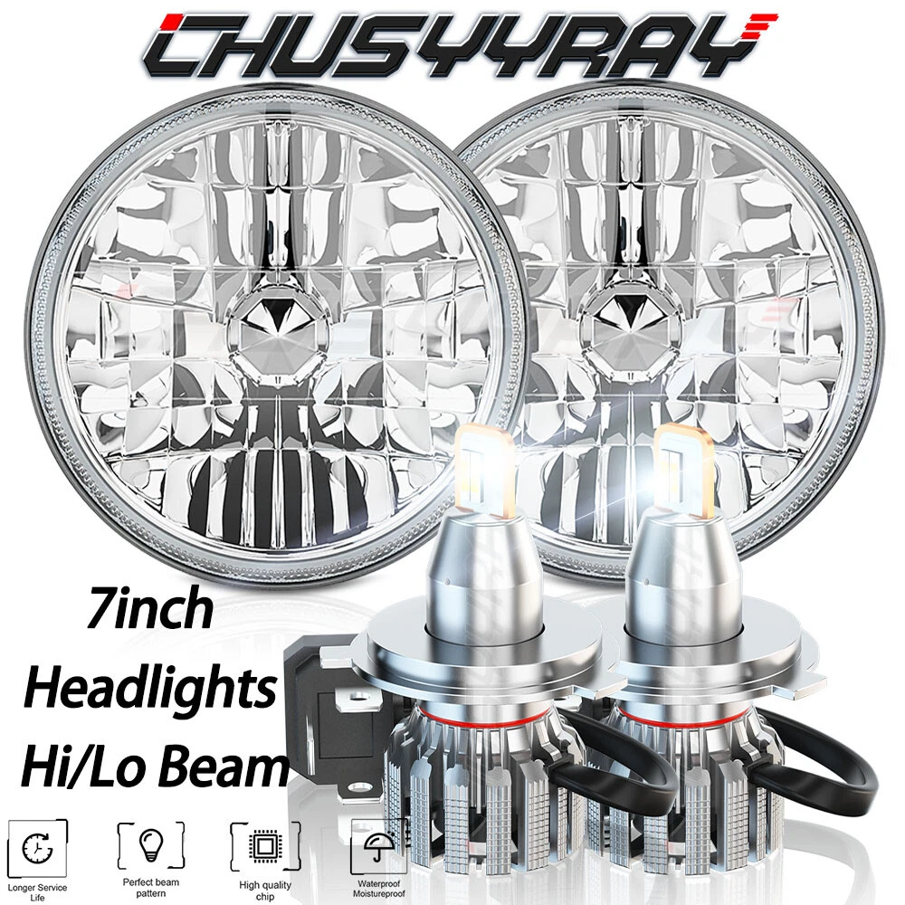 Item description: 7" Inch Round Diamond Crystal Clear Glass Lens / Headlight Conversion Kit contains everything you need to upgrade your headlights to the newest headlight technology while keeping that classic look! Features: 1). Newest Unique Design, High Quality and Classic Apperance, Perfect Light Pattern, Safe on Road ! 2). Housing has Removable bulb sockets for you to install the new bulbs! 3). Perfect design: DOT, SAE legal lights. Made with high-quality chip and Clear PC Lens, sturdy hardness and perfect heat dissipation,more brighter and durable than halogen or HID headlights, more than 60,000 hour lifespan. 4). Direct Plug & Play design (certain vehicles will require slight modification) Professional Installation is highly recommended Specification: Dimension: 7" Dia.(7 inch) Operating Voltage: 9-32V DC Lumen: 20000LM Material: Aluminum + PMMA Clear Lens Lens Pattern: High & Low Beam Waterproof:IP67 Connector: H4 / 9003 (Low Beam and High Beam) Life Span: Above 60,000 Hours Brand New in box! Universal Fitment for vehicles using 7" Round housing: H6024 Made with High Quality Glass Lenses - NOT cheap plastic! Improved appearance with Diamond Cut design! Brighter than standard housings to Improve road visibility and safety! Direct Plug & Play design (certain vehicles will require slight modification) Professional Installation is highly recommended Warranty: 5 Years Package include: 2PCS 7 inch Round Headlights 2pc H4/9003 High & Low Beam Bulbs Boxes are shipped randomly
