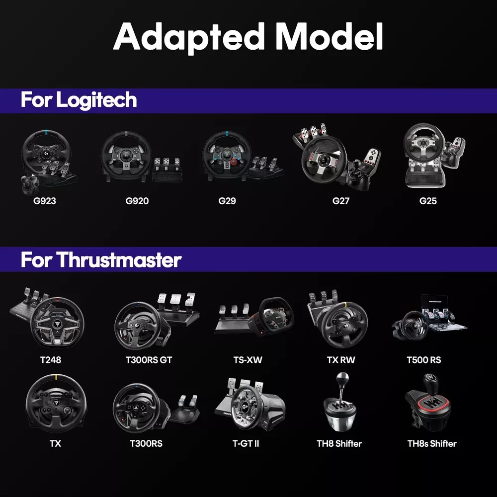 Wheel、Pedals and Shifter Not Included:STAND ONLY Stable Structure: Racing Wheel Stand is made of anti-rust materials and alloy steel, we always believe that only by bringing you high-quality products, we can get you recognition ! We have been focusing on design and production for a long time, constantly improving the quality Compatible Most Model: Racing Simulator Cockpit compatible most racing wheel. Suitable for Logitech G29 G920 G923 G27 G25 and for Thrustmaster T248X / T248 / T300RS GT / T300RS / T300 Ferrari / TX / T-GT / TS-PC / TS-XW / Ferrari 458 / T150 / T80 / TMX / TMX PRO Good Giving: Racing sim stand are suitable for adults. Your family or friends will be surprised when they receive this awesome racing stand. Take it home and start a racing game with your family in weekend! When the Festival comes, it is also a very good idea gift Please tell us any problem or queries, and we will reply back with our answers within 12 hours