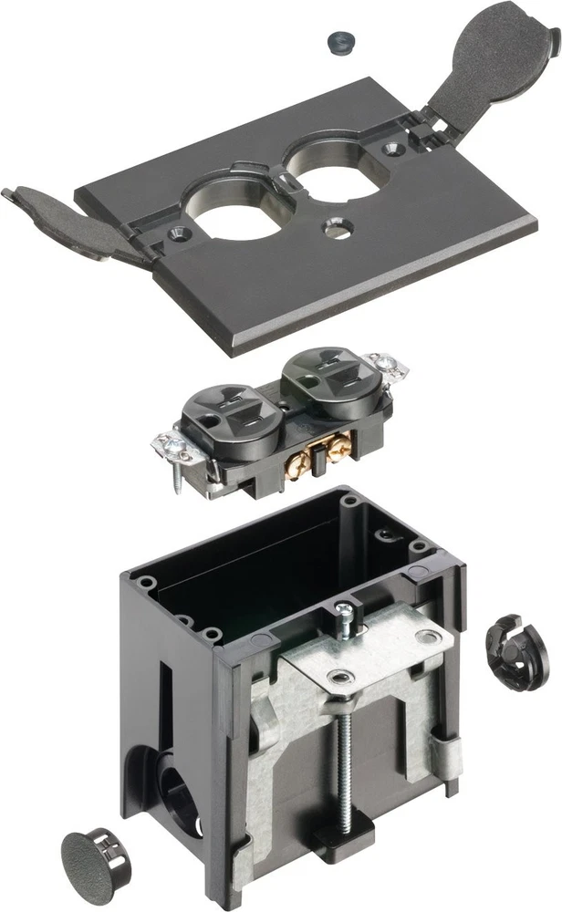 FLBAF101BL-1 Adjustable Floor Box Kit with Outlet and Flip Plate, for Installed Floors, 1-Gang, Black, 1-Pack. 1-Gang Black Adjustable Floor Box Kit with Outlet and Flip Plate for Installed Floors. Cover gasket prevents water intrusion, plate protects outlet when not being used. We have a floor box for any jobsite; this is designed for installed floors, we also make them for new concrete. Oversized covers hide miscut carpet for floor. For a neat, convenient way to put a receptacle(outlet) in the floor. Includes Adjustable Floor Box, duplex receptacle, back plate, gasketed rectangular cover plate with flip lids, (5) #6-32 cover plate screws, (2) #6 drywall screws, (1) each NM94 cable connector and NM900 plug and (1) cap for adjustable screw hole in cover plate.. 1-Gang Black Adjustable Floor Box Kit with Outlet and Flip Plate for Installed Floors Cover gasket prevents water intrusion, plate protects outlet when not being used Box is designed for installed flooring, we offer floor boxes for new concrete and nearly any jobsite Oversized covers hide miscut carpet for floor For a neat, convenient way to put a receptacle(outlet) in the floor Non-Metallic Oversized covers hide miscut carpet for floor