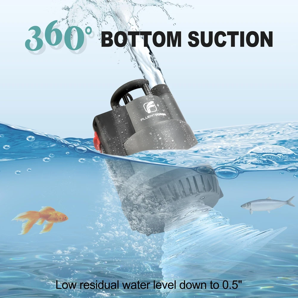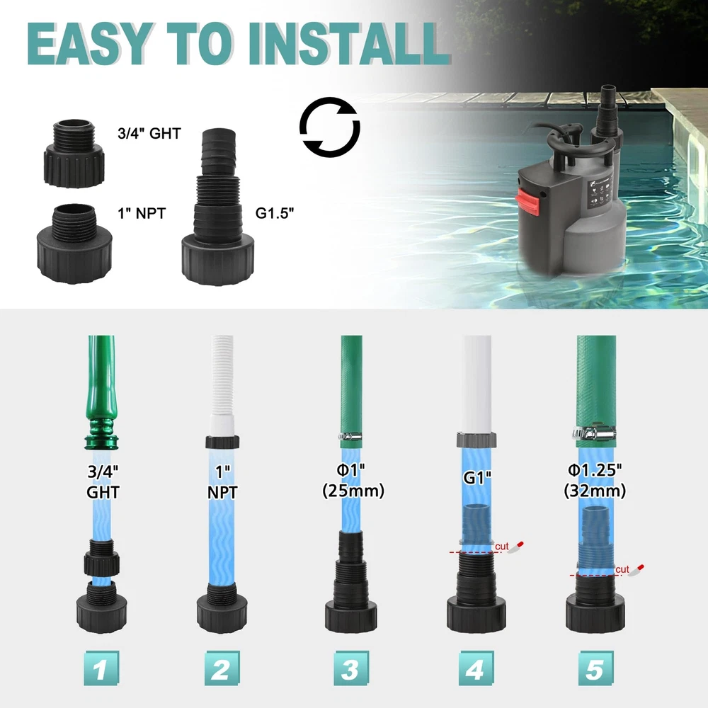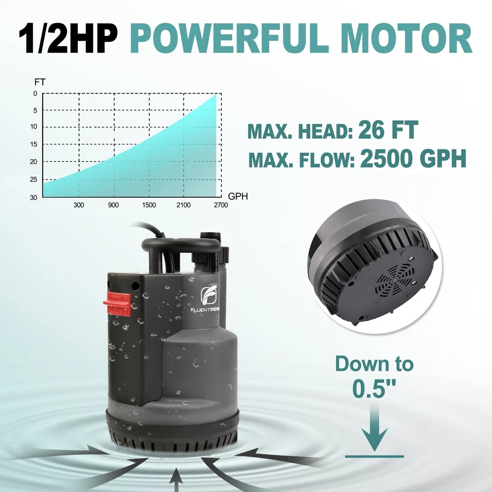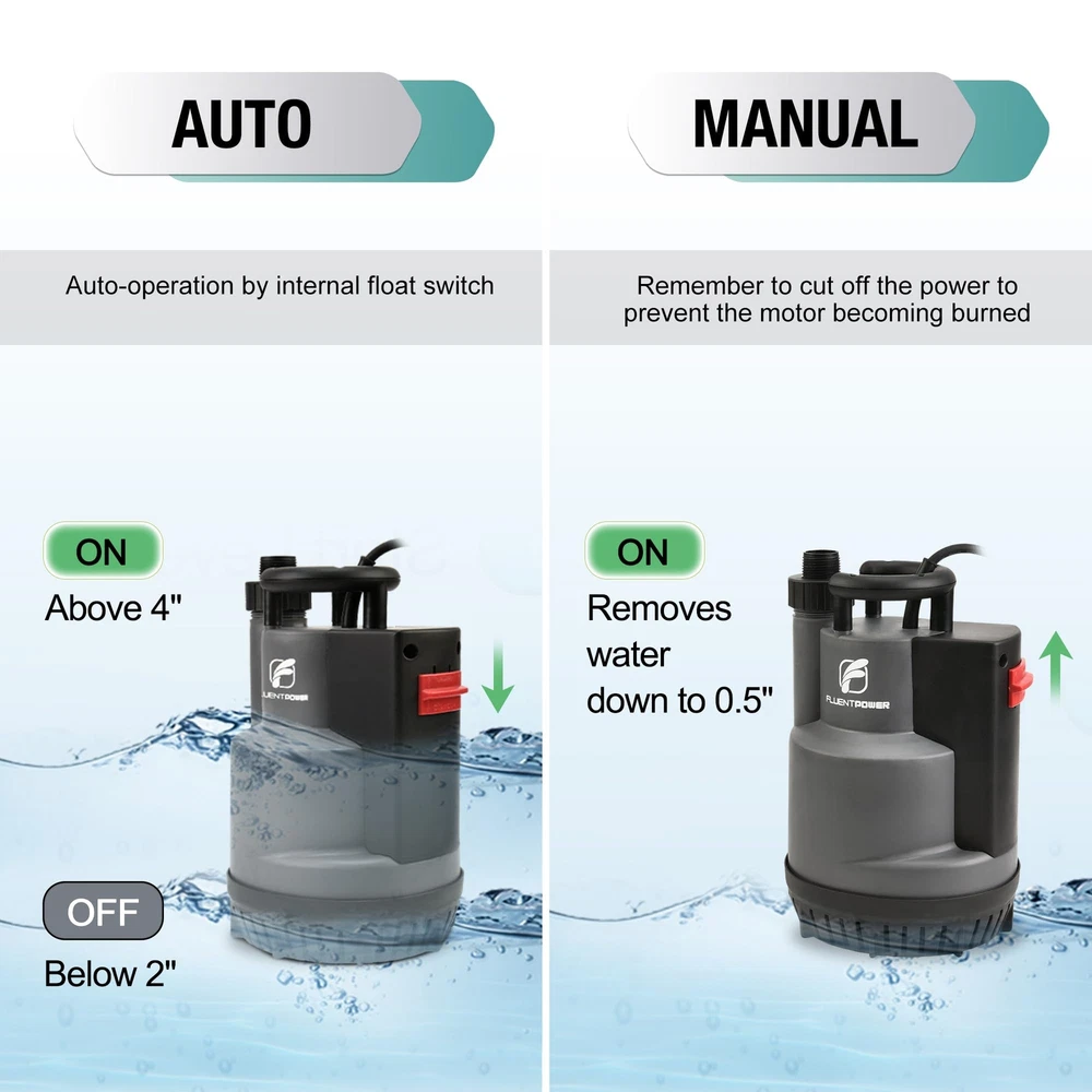 AUTOMATIC MODE: Once the sump pump is plugged in, it will automatically start when the water level is above 4" and shut off when it reaches the stop level of 2". When you start to use this pump, tilt and submerge it in water for a few seconds to expel the air inside MANUAL MODE: If the water level is not high enough to start in auto mode or you want to remove water as low as possible (1/5"), you can switch to manual control. The pump will keep running continuously and will not turn off automatically, so remember to cut off the power immediately to prevent the motor from burning out POWERFUL PERFORMANCE: 1/2 HP POWERFUL MOTOR ensures effective pumping. The pump has a maximum capacity of transferring water up to 2500 GPH with 1-1/2" discharge hose horizontally. It can lift water up to a maximum vertical height of 26'. This submersible pump works with clean water or slightly dirty water, and its bottom grid allows it to pass up to 1/5" solids SAFETY ENSURE & RELIABLE: UPGRADED SEALING STRUCTURE gives pump longer durability, which is much longer than regular mechanical seal. Full corrosion-resistant shell and THERMAL PROTECTION ensures the pump will not be burned out, even when the pump triggers thermal overload protector, the pump will rework after cooling down EASY INSTALLATION: Comes with three plastic adapters: GHT 3/4"+NPT 1" connects standard garden hose for quick installation; G 1-1/2" discharge port connects discharge hose for high capacity pumping WIDELY APPLICATION: Pump also comes with a 16.4-foot long cable cord and a 26-foot nylon rope, which allows the pump to submerge deep enough in the water. Ideal for heavy-duty draining applications including pools, ponds, pits, wells, ditches, basements, etc BUY WITH CONFIDENT: This pump is designed for multi applications and emergency use, like flooding basement, garden pond, hot tub, and so on. Provide lifelong technical consultation and 24h customer service