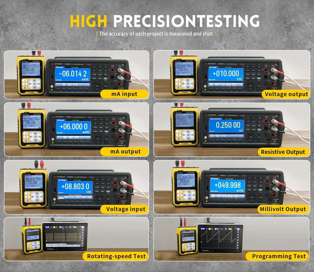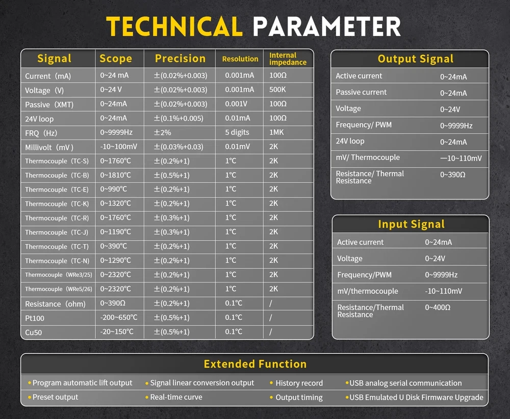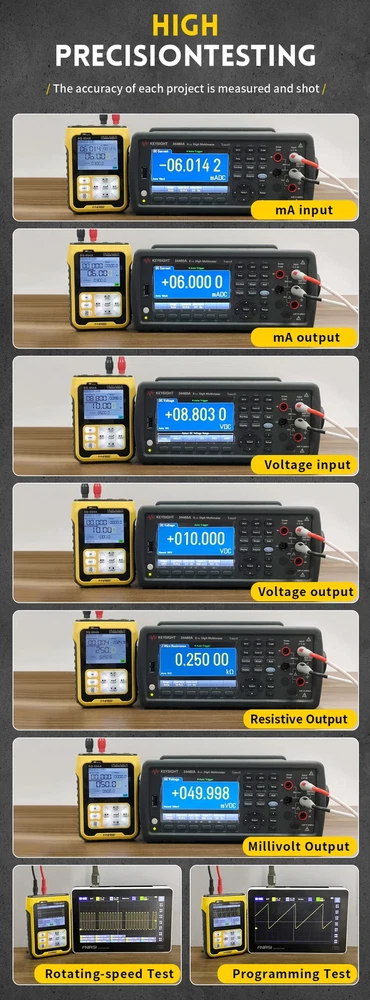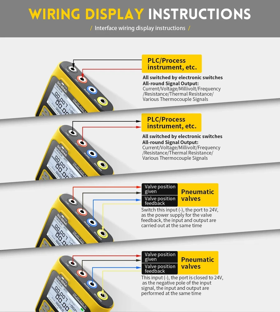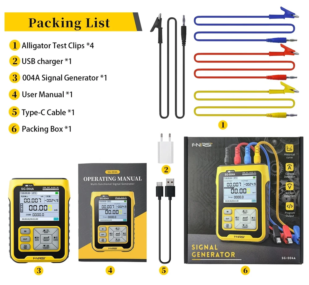 FNIRSI SG004A Signal Generator 4-20mA SDR Receiver Thermocouple Resistance Pressure Transmitter Generator Process Calibrator Features: Portable Siz e: The small size of this tool is very convenient for everyday use, you can easily pocket it for storage and carrying. The 2.4-inch backlit display can clearly display data for your convenience data reading. With the function of real-time curve display, the curve can display the change trend of the input or output signal. Wide Applications: This tool can be widely used for PLC and DCS system debugging, valves positioner adjustment, inverter detection, etc. With a history viewing function, you can view past data at any time. Powered by built-in lithium battery, the remaining power is displayed on the screen, so that you can recharge it in time when there is no power, without affecting your use. The cover is made of ABS material and has silicone protection, which can effectively avert damage to the instrument from falling and greatly prolong its service time. Specifications: Material : ABS Battery : 1 * lithium battery, 3000mAh (included) Current measuring: Ranges: 0-24mA Precisions: ±(0.02%+0.003) Resolution: 0.001mA Internal impedance: 100Ω Voltage measu ring : Ranges: 0-24V Precisions: ±(0.02%+0.003) Resolution: 0.001mA Internal impedance: 500K Passive measuring : Ranges: 0-24mA Precisions: ±(0.02%+0.003) Resolution: 0.001V Internal impedance: 100Ω 24V loop : Ranges: 0-24mA Precisions: ±(0.1%+0.005) Resolution: 0.01mA Internal impedance: 100Ω Frequency : Ranges: 0-9999Hz Precisions: ±2% Resolution: 5 digit Internal impedance: 1MK Millivolt : Ranges: -10~100mV Precisions: ±(0.03%+0.03) Resolution: 0.01mV Internal impedance: 2K Thermocouple (TC-S): Ranges: 0~1760°C Precisions: ±(0.2%+1) Resolution: 1℃ Internal impedance: 2K Thermocouple (TC-B): Ranges: 0~18100°C Precisions: ±(0.5%+1) Resolution: 1℃ Internal impedance: 2K Thermocouple (TC-E): Ranges: 0~990°C Precisions: ±(0.2%+1) Resolution: 1℃ Internal impedance: 2K Thermocouple (TC-K): Ranges: 0~1320°C Precisions: ±(0.2%+1) Resolution: 1℃ Internal impedance: 2K Thermocouple (TC-R): Ranges: 0~1760°C Precisions: ±(0.3%+1) Resolution: 1℃ Internal impedance: 2K Thermocouple (TC-J): Ranges: 0~1190°C Precisions: ±(0.3%+1) Resolution: 1℃ Internal impedance: 2K Thermocouple (TC-T): Ranges: 0~390°C Precisions: ±(0.2%+1) Resolution: 1℃ Internal impedance: 2K Thermocouple (TC-N): Ranges: 0~1290°C Precisions: ±(0.2%+1) Resolution: 1℃ Internal impedance: 2K Thermocouple (WRe3/25): Ranges: 0~2320°C Precisions: ±(0.2%+1) Resolution: 1℃ Internal impedance: 2K Resistance : Ranges: 0~390Ω Precisions: ±(0.2%+1) Resolution: 0.1℃ Package size: 150 * 145 * 85mm / 5.9 * 5.7 * 3.3in Package weight : 468.6g / 1.0lb Packing List: 1 * Signal Generator 4 * Test Clips 1 * Type-C Cable 1 * User Manual Shipping policy 1. We will send out your order within 3 working days, the tracking number will be updated to you once your order has been shipped. Standard shipping will take 8-12 business days for delivery and expedited shipping takes 2-7 business days. If there is any delay, it may be caused by bad weather or custom inspection which is not in our control, but don't worry, we will keep to follow your order until you receive it. 2. We try our best to make you get desired products as soon as possible. In case you receive wrong products, please contact us timely for exchange or refund. If damaged, please refuse to sign and send us the message ASAP. 3. Shipping cost does not include DHL/FedEx /UPS Remote area service charge , buyer will afford if your address belongs to it ,it is USD45 for it . Warranty&Return Policy: 1.-We encourage all customers to communicate with us through eBay messages. If you have any questions or comments whatsoever regarding our products function or listing questiones, we are waiting to hear from you 2.-A 1 year warranty is offered for this product.If the product malfunctioned under proper usage per instructions manual within the warranty period, please contact us to obtain shipping instructions and send it back at your shipping costs. Import Taxes or Duties 1.- Import duties, taxes and other charges happened in your side are not included in the item price. These fees not included in our price. 2.- Please check with your country's importing policy about the duties and charges before purchase. Feedback 1.- As your feedback is very important to our development, we sincerely invite you to leave positive feedback for us if you are satisfied with our product and service. 2.- Please contact us before you leave a neutral or negative feedback, we will try our best to solve the problems.