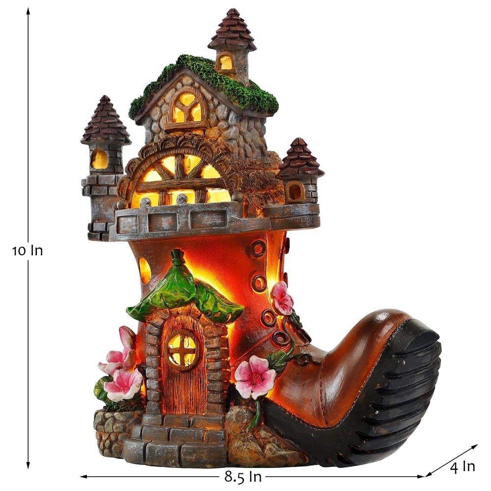 High Quality: This boot fairy house garden figurine is made of high quality resin material, finished with a UV resistant coating, dustproof and waterproof, can withstand rain, snow or scorching sun without cracking, fading or rusting. Solar Shoe House Garden Statue: This fairy house garden figurines are easy to use, simply turn on the power button before first use, leave it in the on position in the daytime, keep the solar panel under the sun to ensure sufficient sunlight, it will charge during the daylight hours and automatically light up at night for 8-10 hours. Adorable Fairy House Statue: This fairy house statue is painted with very nice details, a beautiful house was built on a discarded boot, lifelike steps, doors and windows, balconies, exquisitely carved with patterns, the warm light came out from the windows, the roof is covered with green moss, pink flower vines hovered over the boots, and the eaves made of lotus leaves are definitely bring coolness to the owner of the house in the hot summer! What a magical and beautiful fairy tale this is! Great Garden Decor: This fairy-tale shoe house statue is perfect as solar garden yard decorations, brighten up your backyard, lawn, pond, pool, window sills, countertops, entryways, it is a wonderful addition to your lawn and home decor. Warm Gifts: This fairy boot house garden figurines is 8.5 x 10 inch, suitable to use for garden, trees, flowers, fence, flowerbed, walkway decor, emit a romantic glow at night, adding a sense of mystery. This solar garden statue is fun for gift giving for your family and friends as birthdays gifts, Mothers Day gifts, holiday gifts, weddings gifts or housewarming gifts.