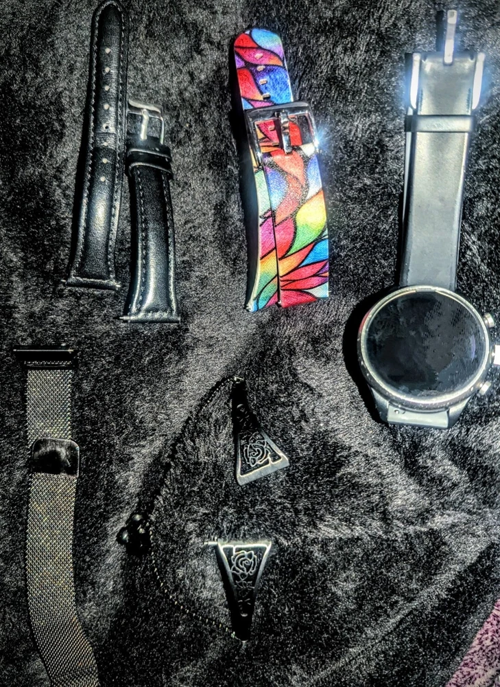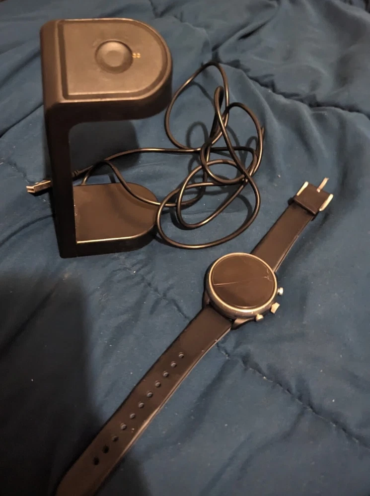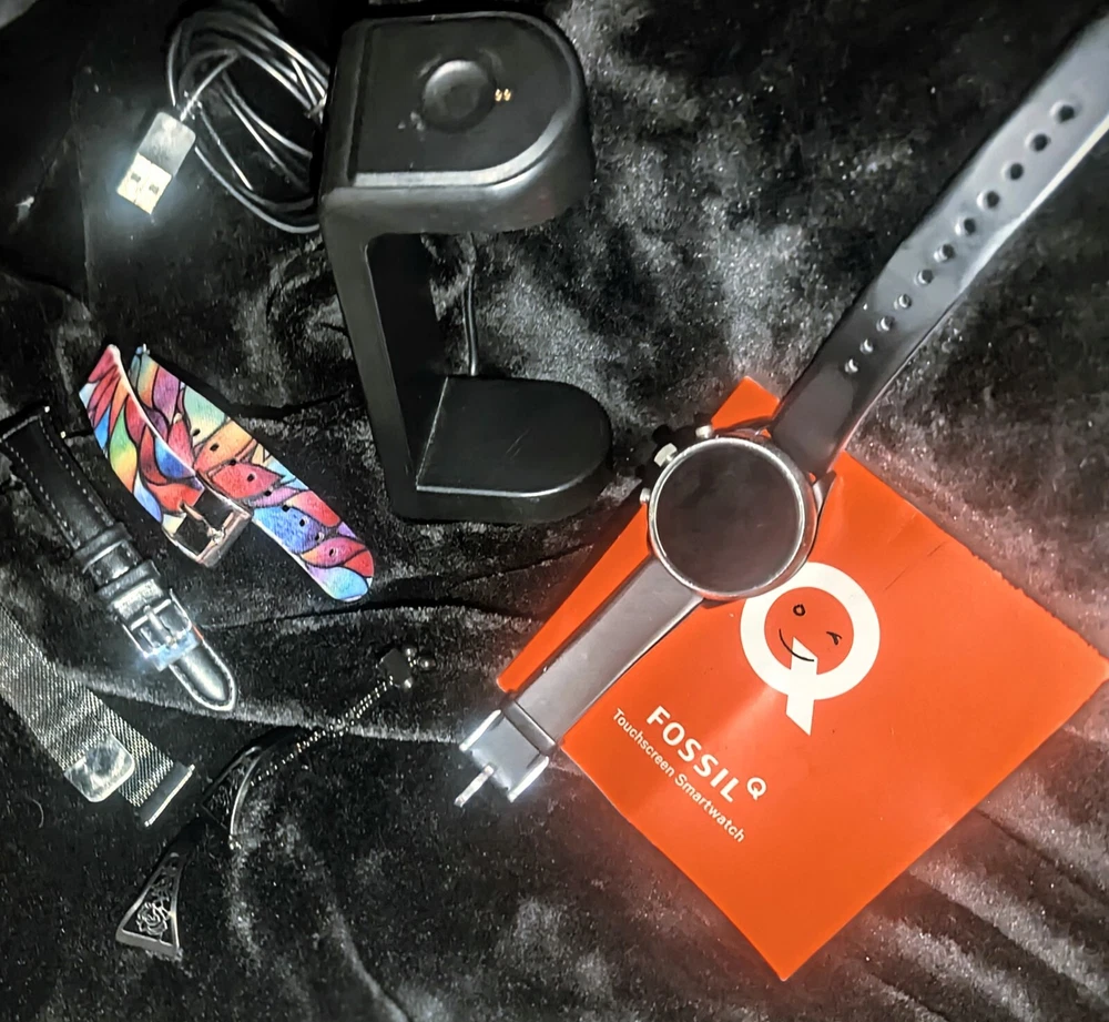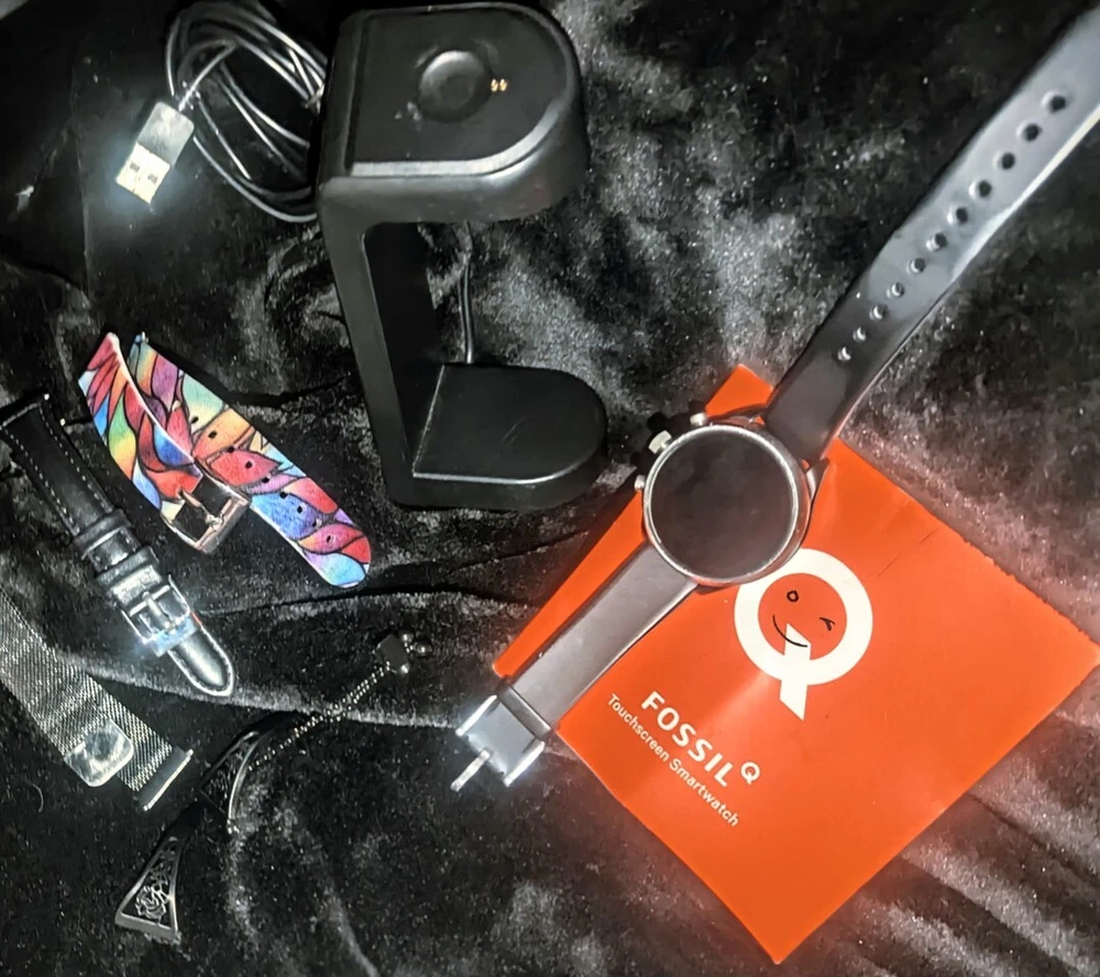 ---------⟨INCLUDED ITEMS:⟩------------- -1 Gen 4 Fossil Smartwatch Sport (FTW4019) -1 charging dock stand (USSKG4CDSB) -4 extra 18mm bands/straps: 1 leather slim black, 1 leather colorful feather print, 1 metal mesh, 1 jewelry cuff TOTAL BUNDLE VALUE: $270 (originally purchased for: $199 watch, $9.99 dock, $61 all 4 bands) Open to offers! -------------------------------------------- - - - -⟨FOSSIL GEN 4 WATCH INFO⟩ - - - - "Google Fossil Gen 4 Sport Smartwatch Wear OS Android, Heart Rate, Metal & Silicone, Touchscreen, 43mm, Swimproof, Grey/Black FTW4019 (UPC: 796483422728 / C2F912301504)" - - [WATCH SPECS] - - MODEL: Fossil FTW4019 SERIES/ GEN: Fossil Q series, Gen 4 Sport UPC: 796483422728 CASE: Metal, Round, 43mm diameter, 12mm thick, silver color BAND: Silicone, Smoke/ gray color, 20mm width PROCESSOR: Qualcomm Snapdragon Wear 3100 OPERATING SYSTEM/ COMPATIBILITY: Wear OS by Google > Compatible with Android OS 4.4+ and iOS 9.3 Number on back of watch: C2F912301504 CONNECTIVITY: Wireless- Bluetooth Smart Enabled / 4.2 Low Energy and NFC technology NOTIFICATIONS: Alarm Clock, App Alerts, Calendar, Email, Multiple Time Zones, Social Media, Text messages FUNCTIONS: Control Your Music, Google Pay, GPS, Heart Rate Tracking, Interchangeable Watch Band, Personalise Your Dial, Swimproof - - [WATCH FEATURES] - - •Touchscreen functionality, Digital display •Heart Rate Monitor •Swimproof/ Water resistant depth: 165ft •GPS, Sensors: accelerometer, gyroscope, altimeter •Comprehensive monitoring of: distance, calories, heart rate, steps taken •Wear OS by Google: App notifications (smartphone , SMS, enail, social, calendar apps), Google Pay, Google Assistant with microphone, music storage & controls •Custom goal & alarm settings, multiple time zones, Calendaring •24hr battery based on usage /rapid charging up to 80% in 1hr •Lightweight, customizable watch faces, interchangeable with other 16mm bands •Vibrate mode •Built-in microphone - - [WATCH DESCRIPTION] - - "Gen 4 Sport Smartwatch is part of the Fossil Q series with features to help you stay on top of your health. This ultra-lightweight 43mm watch features a smoke silicone strap, lets you track your heart rate, track your workout (even swimming), customize your dial, view notifications at a glance and more. The Bluetooth and Wi-Fi capabilities make it easy to integrate your favorite applications, while the interchangeable band offers a host of customization options." - -[WATCH PRICE/ CONDITION] - - Smartwatch and dock are in excellent used condition: everything is fully functioning, no clear damage, and barely used. A few tiny scratches around edge of silver casing can be seen from side but not noticable when on wrist and superficial marks- shown in last photo. No other evident wear or issues with the watch. Original boxes unavailable, watch Instruction pamphlet included. Watch works perfectly, setup with Wear OS app PRICING: Originally purchased $199.00 ------------------------------------------- - - - -⟨CHARGING DOCK INFO⟩- - - - "Soarking Charging Dock/Stand black, 5 Ft Cable, 5 Volts, 10 watts USSKG4CDSB" - - [DOCK SPECS]- - Model #: Soarking USSKG4CDSB UPC: 714449588578, ASIN: BO7S2NDVL6 Connectivity: USB/ total Ports: 1 Current Rating: 1 Amps Output Voltage: 5 Volts Wattage: 10 watts Power Plug: Type A-2 pin, Source: Corded Electric FEATURES: Fast Charger, Magnetic, Short Circuit Protection, overvoltage/overcurrent/overheat/short circuit protection. Magnetic mount, Case Friendly and Charging at Portrait Orientation View, long 5 ft cable Compatible models: Fossil Gen 6/5E/5 carlyle men, Fossil Gen 5 julianna women, Fossil Sport,Fossil Gen 4 Explorist HR,Venture HR,Emporio Armani, MK Runway,Sofie Heart Rate,Diesel ON Fullguard 2.5 Smartwatch DZT9001, Skagen falster 3/2,Kate spade scallop 2, Misfit vapor 2. ----------------------------------------- --⟨BAND/ STRAP DESCRIPTIONS⟩-- ⟨FLORAL HOLLOW OUT JEWELRY CUFF BRACELET⟩ "TRUMiRR 18mm Jewelry Cuff Bracelet Black Stainless Steel" (like new/ no wear, +extra pins »paid $15.75) ⟨MAGNETIC METAL MESH BAND⟩ "Jurich Adjustable Magnetic Stainless Steel" (Good used condition-only few scratches on band, +extra pins »paid $14) ⟨THIN NARROW BLACK LEATHER BAND⟩ "OenFoto Quick Release Slim Thin Narrow Small Leather-18mm Black" (Like new, no wear »Paid $14.99) ⟨COLORFUL FEATHER DESIGN LEATHER⟩ "ENDIY Soft leather 18mm -Blue Lovely Cute Flower Floral Pattern" (Good condition, Slightly bent from storage but curved to fit wrist »Paid $16.60) PRICE: $61 total paid originally for all 4 bands ----------------------------------------