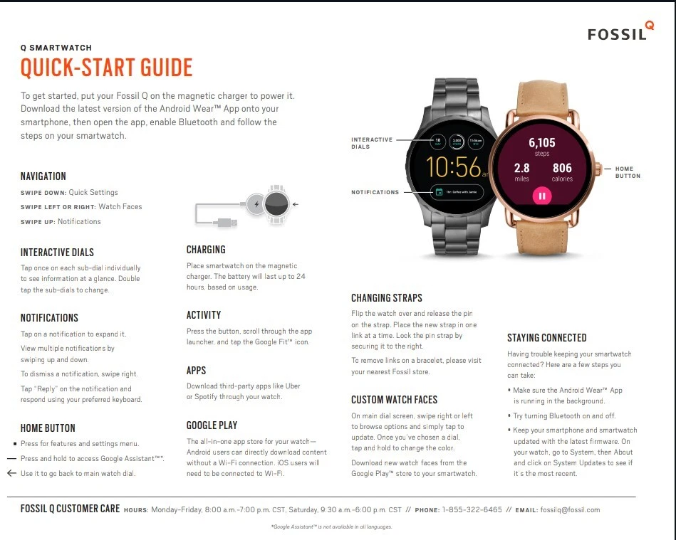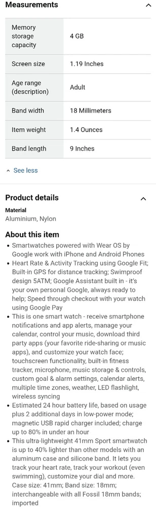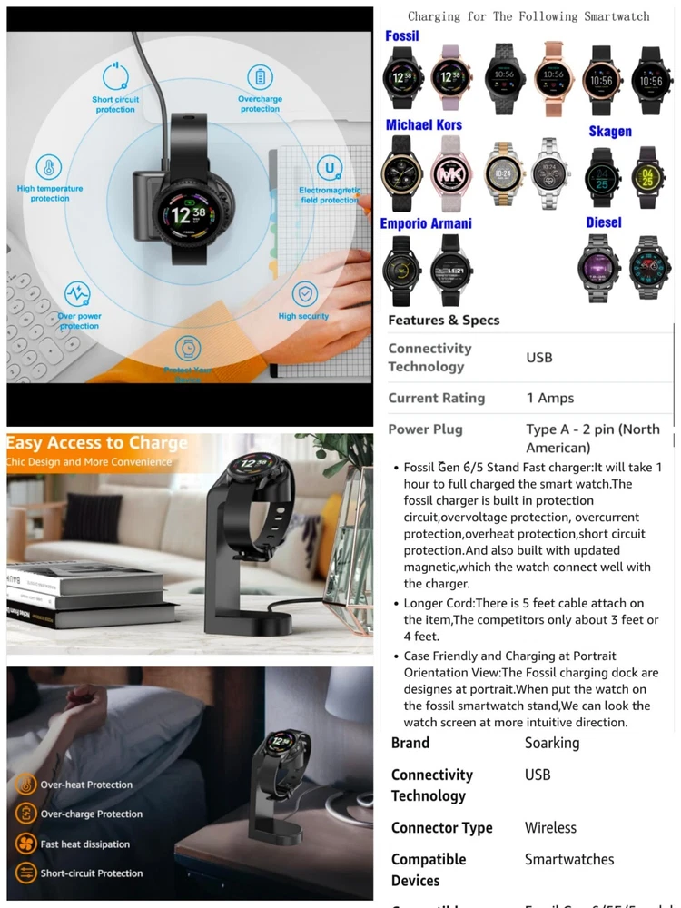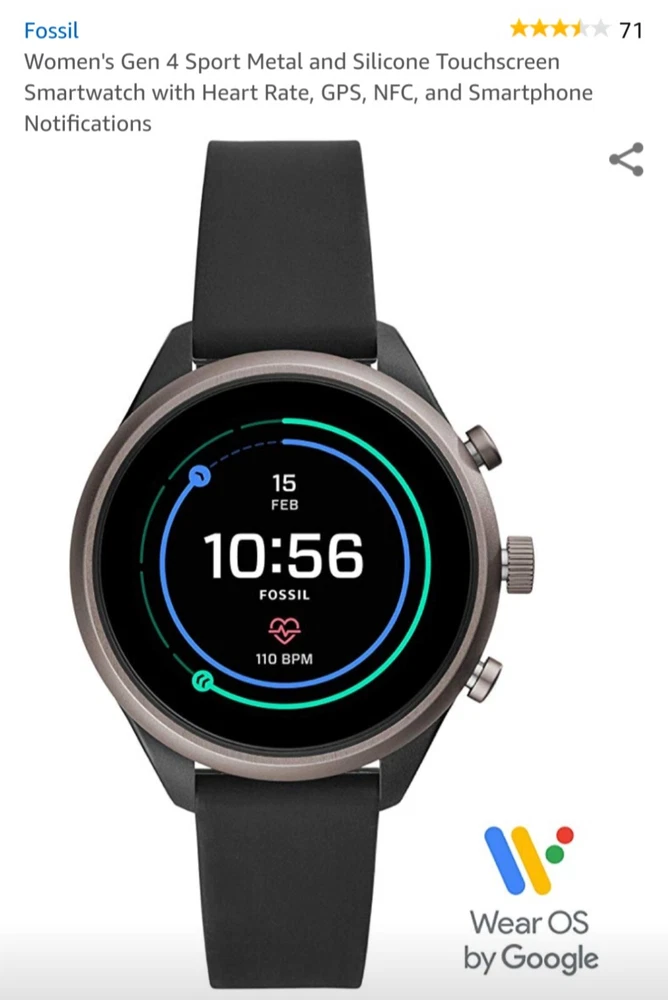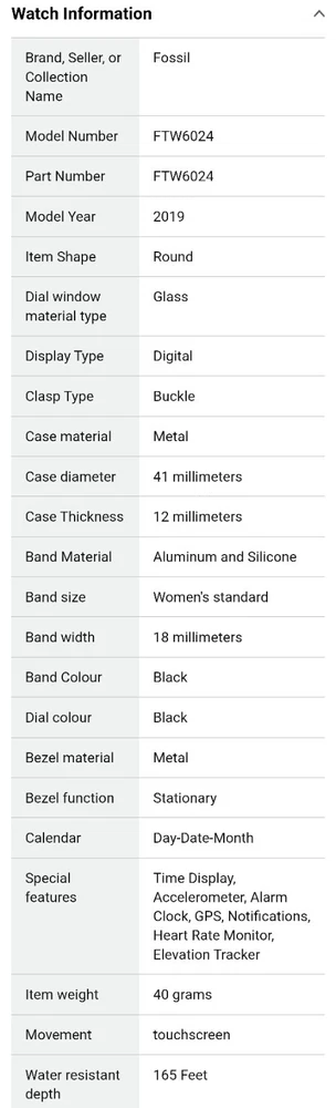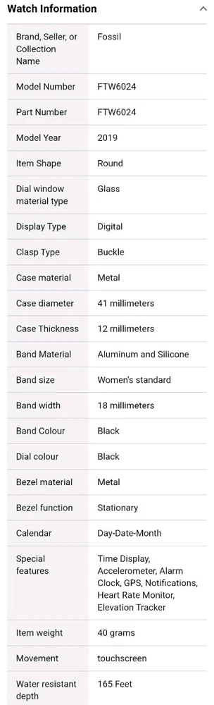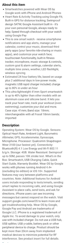 ---------⟨INCLUDED ITEMS:⟩------------- -1 Gen 4 Fossil Smartwatch Sport (FTW4019) -1 charging dock stand (USSKG4CDSB) -4 extra 18mm bands/straps: 1 leather slim black, 1 leather colorful feather print, 1 metal mesh, 1 jewelry cuff TOTAL BUNDLE VALUE: $270 (originally purchased for: $199 watch, $9.99 dock, $61 all 4 bands) Open to offers! -------------------------------------------- - - - -⟨FOSSIL GEN 4 WATCH INFO⟩ - - - - "Google Fossil Gen 4 Sport Smartwatch Wear OS Android, Heart Rate, Metal & Silicone, Touchscreen, 43mm, Swimproof, Grey/Black FTW4019 (UPC: 796483422728 / C2F912301504)" - - [WATCH SPECS] - - MODEL: Fossil FTW4019 SERIES/ GEN: Fossil Q series, Gen 4 Sport UPC: 796483422728 CASE: Metal, Round, 43mm diameter, 12mm thick, silver color BAND: Silicone, Smoke/ gray color, 20mm width PROCESSOR: Qualcomm Snapdragon Wear 3100 OPERATING SYSTEM/ COMPATIBILITY: Wear OS by Google > Compatible with Android OS 4.4+ and iOS 9.3 Number on back of watch: C2F912301504 CONNECTIVITY: Wireless- Bluetooth Smart Enabled / 4.2 Low Energy and NFC technology NOTIFICATIONS: Alarm Clock, App Alerts, Calendar, Email, Multiple Time Zones, Social Media, Text messages FUNCTIONS: Control Your Music, Google Pay, GPS, Heart Rate Tracking, Interchangeable Watch Band, Personalise Your Dial, Swimproof - - [WATCH FEATURES] - - •Touchscreen functionality, Digital display •Heart Rate Monitor •Swimproof/ Water resistant depth: 165ft •GPS, Sensors: accelerometer, gyroscope, altimeter •Comprehensive monitoring of: distance, calories, heart rate, steps taken •Wear OS by Google: App notifications (smartphone , SMS, enail, social, calendar apps), Google Pay, Google Assistant with microphone, music storage & controls •Custom goal & alarm settings, multiple time zones, Calendaring •24hr battery based on usage /rapid charging up to 80% in 1hr •Lightweight, customizable watch faces, interchangeable with other 16mm bands •Vibrate mode •Built-in microphone - - [WATCH DESCRIPTION] - - "Gen 4 Sport Smartwatch is part of the Fossil Q series with features to help you stay on top of your health. This ultra-lightweight 43mm watch features a smoke silicone strap, lets you track your heart rate, track your workout (even swimming), customize your dial, view notifications at a glance and more. The Bluetooth and Wi-Fi capabilities make it easy to integrate your favorite applications, while the interchangeable band offers a host of customization options." - -[WATCH PRICE/ CONDITION] - - Smartwatch and dock are in excellent used condition: everything is fully functioning, no clear damage, and barely used. A few tiny scratches around edge of silver casing can be seen from side but not noticable when on wrist and superficial marks- shown in last photo. No other evident wear or issues with the watch. Original boxes unavailable, watch Instruction pamphlet included. Watch works perfectly, setup with Wear OS app PRICING: Originally purchased $199.00 ------------------------------------------- - - - -⟨CHARGING DOCK INFO⟩- - - - "Soarking Charging Dock/Stand black, 5 Ft Cable, 5 Volts, 10 watts USSKG4CDSB" - - [DOCK SPECS]- - Model #: Soarking USSKG4CDSB UPC: 714449588578, ASIN: BO7S2NDVL6 Connectivity: USB/ total Ports: 1 Current Rating: 1 Amps Output Voltage: 5 Volts Wattage: 10 watts Power Plug: Type A-2 pin, Source: Corded Electric FEATURES: Fast Charger, Magnetic, Short Circuit Protection, overvoltage/overcurrent/overheat/short circuit protection. Magnetic mount, Case Friendly and Charging at Portrait Orientation View, long 5 ft cable Compatible models: Fossil Gen 6/5E/5 carlyle men, Fossil Gen 5 julianna women, Fossil Sport,Fossil Gen 4 Explorist HR,Venture HR,Emporio Armani, MK Runway,Sofie Heart Rate,Diesel ON Fullguard 2.5 Smartwatch DZT9001, Skagen falster 3/2,Kate spade scallop 2, Misfit vapor 2. ----------------------------------------- --⟨BAND/ STRAP DESCRIPTIONS⟩-- ⟨FLORAL HOLLOW OUT JEWELRY CUFF BRACELET⟩ "TRUMiRR 18mm Jewelry Cuff Bracelet Black Stainless Steel" (like new/ no wear, +extra pins »paid $15.75) ⟨MAGNETIC METAL MESH BAND⟩ "Jurich Adjustable Magnetic Stainless Steel" (Good used condition-only few scratches on band, +extra pins »paid $14) ⟨THIN NARROW BLACK LEATHER BAND⟩ "OenFoto Quick Release Slim Thin Narrow Small Leather-18mm Black" (Like new, no wear »Paid $14.99) ⟨COLORFUL FEATHER DESIGN LEATHER⟩ "ENDIY Soft leather 18mm -Blue Lovely Cute Flower Floral Pattern" (Good condition, Slightly bent from storage but curved to fit wrist »Paid $16.60) PRICE: $61 total paid originally for all 4 bands ----------------------------------------