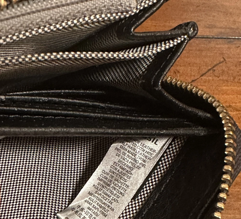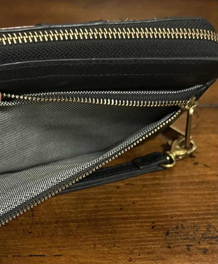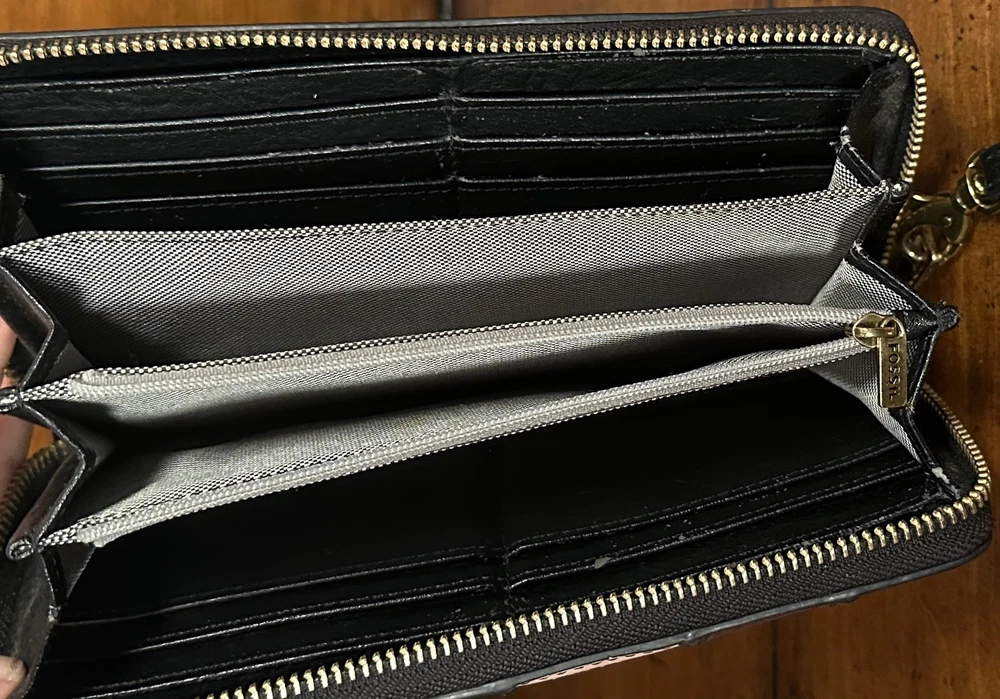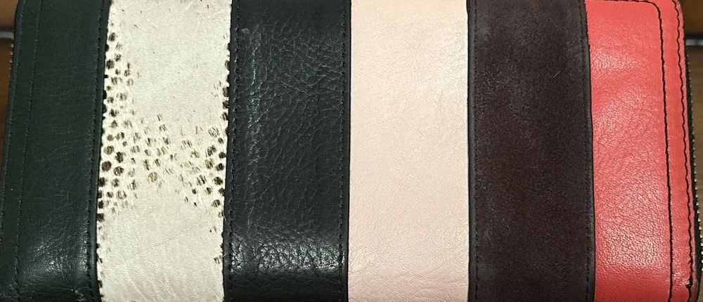 This leather clutch features RFID SFETY, 12 credit cards, slots an interior zip pocket, to bill compartments, 3 gusseted pockets, and a detachable wristlet strap. this is the perfect combination of unique and sleek just the right amount of cards, slots, coin sections, and open areas for notes, stamps, and receipts. It goes with everything! The colors are quirky, which is fun to see an easy to distinguish from other wallets. This clutch can fit up to an iPhone 14 Pro Max and Samsung Galaxy S 22 ultra. The interior material is 100% polyester, polyurethane. It has a great zipper that works smoothly & a detachable wristlet strap with a lobster clasp in a bronze gold color. The exterior material is made out of leather polyurethane and suede trims.
