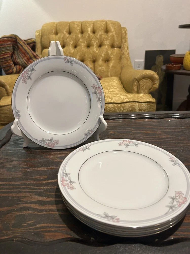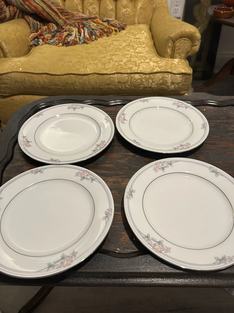 Add a touch of contemporary elegance to your dining table with this set of four Noritake Tarkington 3695 salad plates. Crafted from high-quality porcelain with a glossy finish, these plates feature a beautiful floral theme in shades of pink and gray, complemented by silver trim. Measuring 8 1/4 inches in diameter, they are perfect for all occasions, from casual family dinners to formal events. Hand wash only and made with traditional pottery techniques in Sri Lanka, these plates bear a printed backstamp and are an original, licensed reproduction from Noritake's legendary product line. Ideal for collectors and those who appreciate fine dining, these plates are a must-have addition to any table setting.