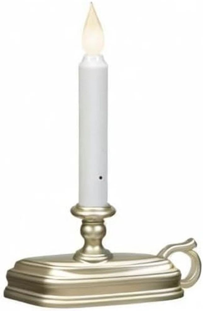 Features a soft, warm white LED light and Large Pewter (silver) base Automatically turns on at dusk and off at dawn LED window candles will last 45 days on 2 C batteries (batteries sold seperately) 3 position switch for flame setting: Off/Steady On/Flicker Measures: 9"H x 6"W x 1.75"D Illuminate your windows safely and cheerfully with this LED-light dusk to Dawn sensor window candle. Battery operated for a clean, wireless look; this classic-style ivory taper with a "flame" has three settings: off, steady on flame or flickering light and has a handsome sculpted candle holder. A discreet automatic sensor turns the candle on at dusk and off at dawn so it's effortless to use, and unlike an incandescent bulb, the LED bulb stays cool for worry-free lighting all night long. Requires 2 C batteries (not included). Batteries will last 20 days when lit for 12 hours on per day and measures: 9"H x 6"W x1.75"D. For indoor use only. Great for window sills since it's only 2 inches deep.