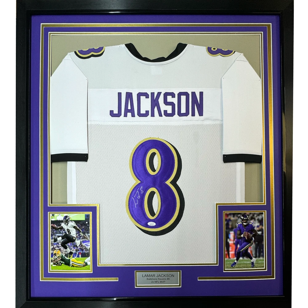 FRAMED Autographed/Signed LAMAR JACKSON 33x42 Baltimore White Jersey JSA COA The item is professionally framed & matted with two 8x10 photos, measures 33"x42" and is ready to be hung in your man cave! NOTE: COA card will be mounted on the back of the frame, not inside it on top of the jersey as seen in the picture. Please allow up to 5 business days for the item to be framed, packaged safely, and picked up by USPS. Photo and matting requests can be made.Shipping: Shipping is FREE. We will ship USPS within 1 business day and supply tracking and insurance for no additional cost! We are here to make sure this is a smooth and pleasant transaction for you!Returns: Our returns are a 30 day MONEY BACK guarantee. No questions will be asked about the return, you will need to pay return shipping but will get a full refund when we receive the item. Our items are 100% authentic and we stand behind every item we sell. If for any reason you are not pleased with the item, send it back and receive your full refund. Your satisfaction is guaranteed when purchasing from Hall of Fame Sports Memorabilia! Feel free to ask ANY questions and we will respond as soon as possible!MAKE OFFERS -- ALL WILL BE CONSIDERED!! And be sure to click the link below to check out our other great items!Visit My eBay Store: Hall of Fame Sports Memorabilia The item is professionally framed & matted with two 8x10 photos, measures 33"x42" and is ready to be hung in your man cave! NOTE: COA card will be mounted on the back of the frame, not inside it on top of the jersey as seen in the picture. Please allow up to 5 business days for the item to be framed, packaged safely, and picked up by USPS. Photo and matting requests can be made. Shipping : Shipping is FREE. We will ship USPS within 1 business day and supply tracking and insurance for no additional cost! We are here to make sure this is a smooth and pleasant transaction for you! Returns : Our returns are a 30 day MONEY BACK guarantee. No questions will be asked about the return, you will need to pay return shipping but will get a full refund when we receive the item. Our items are 100% authentic and we stand behind every item we sell. If for any reason you are not pleased with the item, send it back and receive your full refund. Your satisfaction is guaranteed when purchasing from Hall of Fame Sports Memorabilia! Feel free to ask ANY questions and we will respond as soon as possible! MAKE OFFERS -- ALL WILL BE CONSIDERED!! And be sure to click the link below to check out our other great items! Visit My eBay Store: Hall of Fame Sports Memorabilia eBay integration by