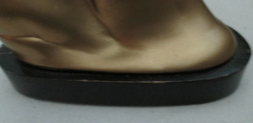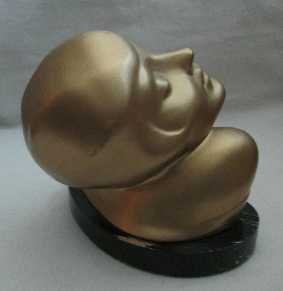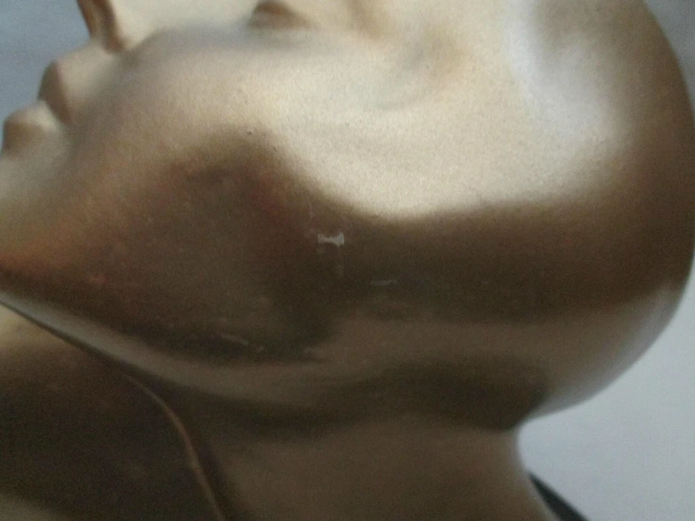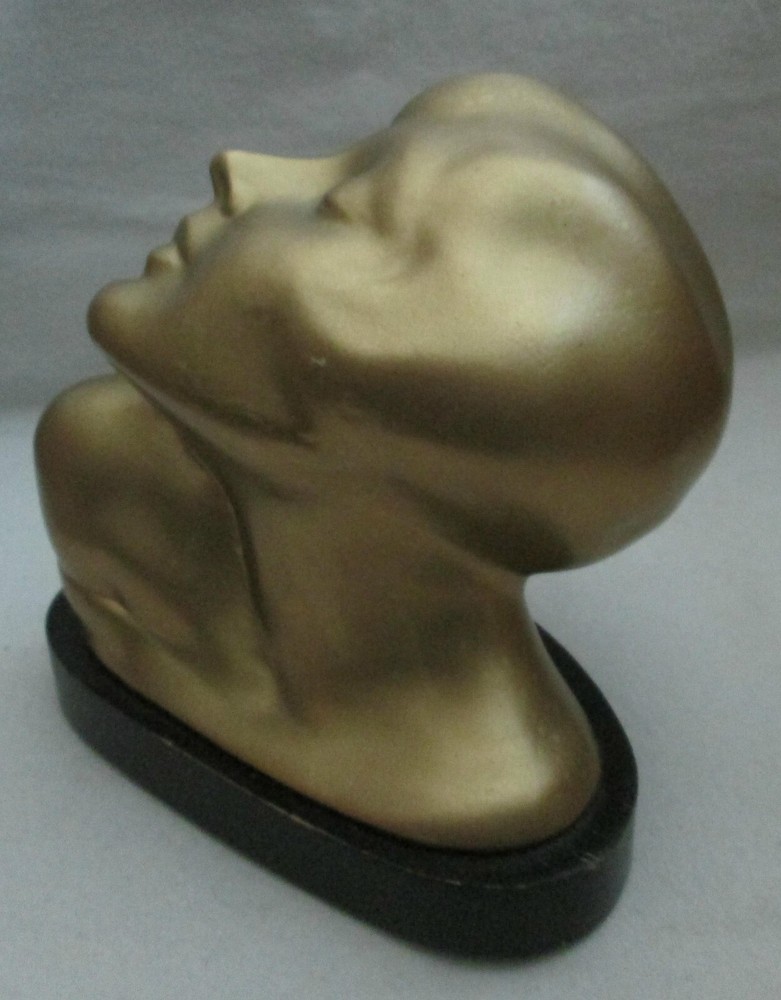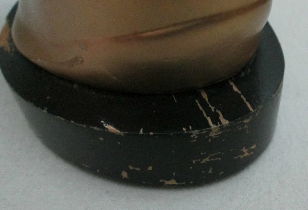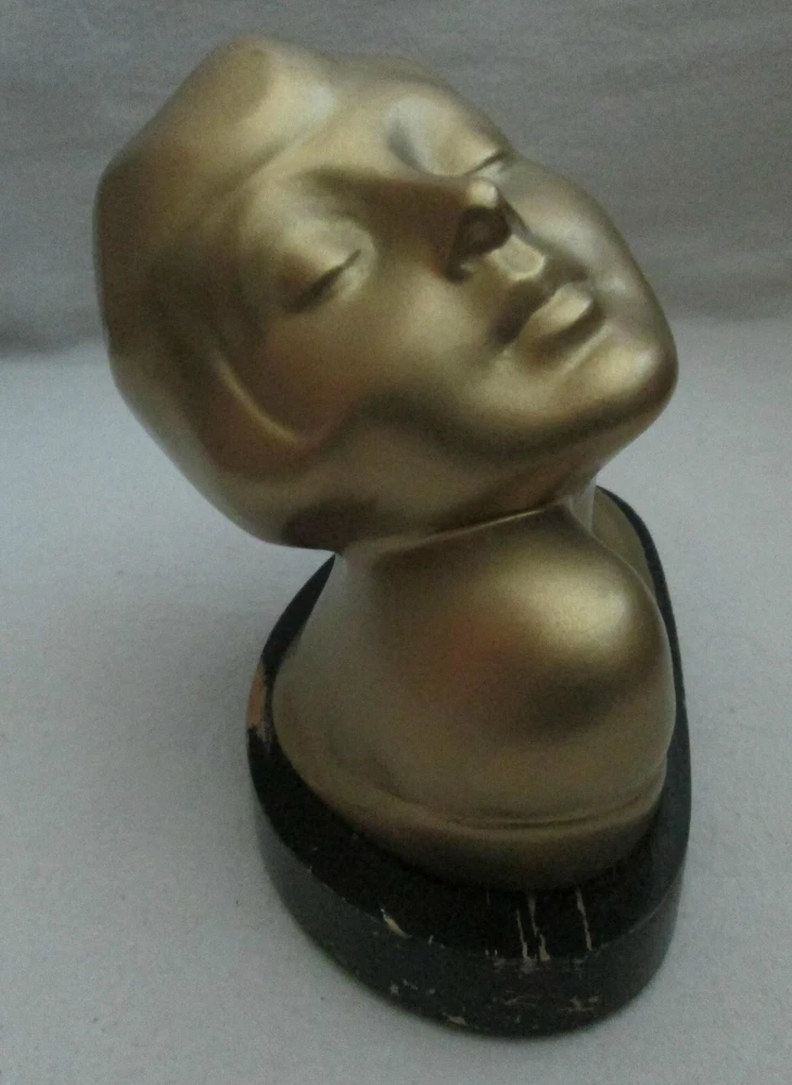 Art Deco era metal, with a gold exterior, bust, woman looking upward, 5 1/2" high and about 6 1/4" wide. The base is wood, painted black. Green felt on the base. Another eBay listing said that this is a piece made by Frankart but there are no markings on the bust. I didn't removed the base to check for a signature there. The exterior finish is in good condition for the age, probably the 1920's. One tiny spot, shows the metal below the exterior. See the last digital. The wood base has some paint loss. Those can be seen in the photos. One area of the base, on the back, shows that the wood has splintered. See photo ten. Since it is wood, and painted, it could be easily restored. Please view all of the digitals and use magnification, as needed, so that you are comfortable with the condition of the item before bidding. The photos are an important part of the item's description. Expedited Shipping. Shipping costs are based on the distance from Arizona to your home address. No international shipping. Shipping only to your confirmed eBay shipping address. USPS prices the cost of shipping. I provide the weight and size of the box. No local pick up. Thanks.