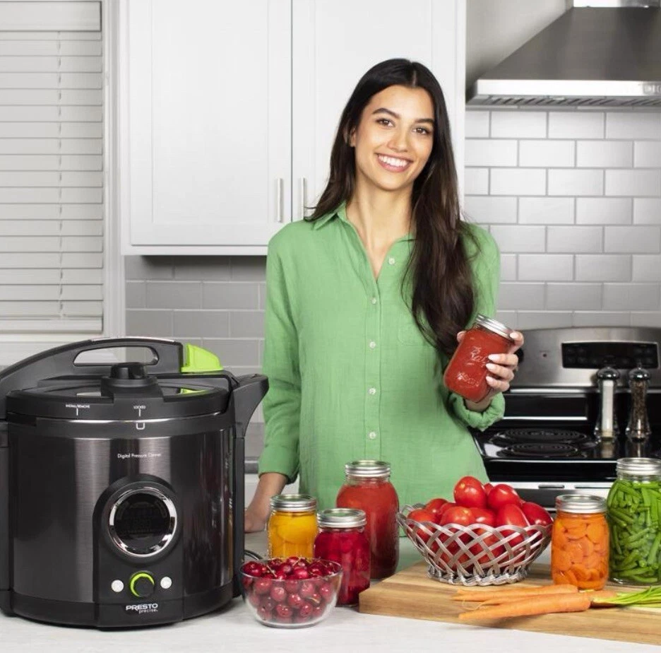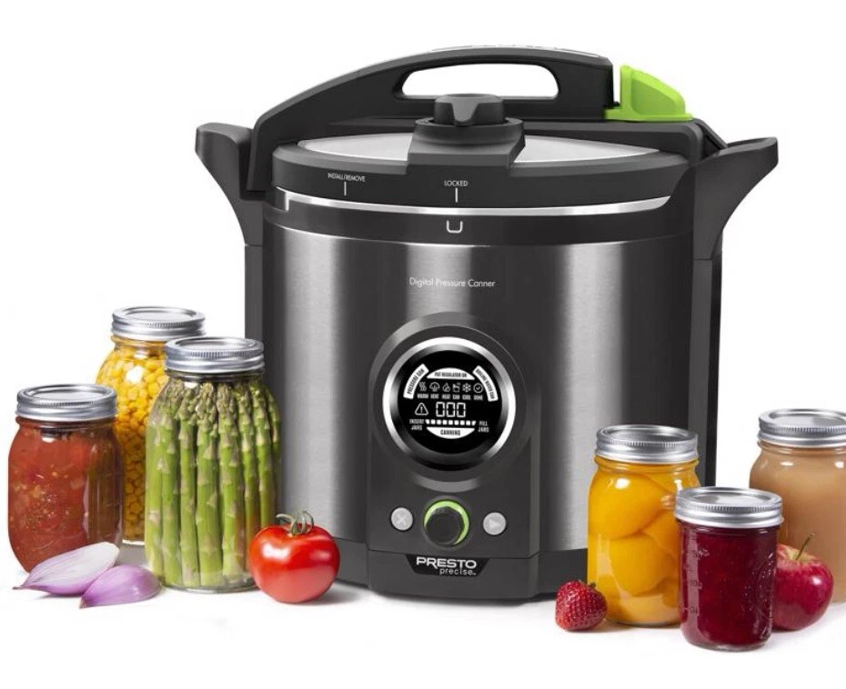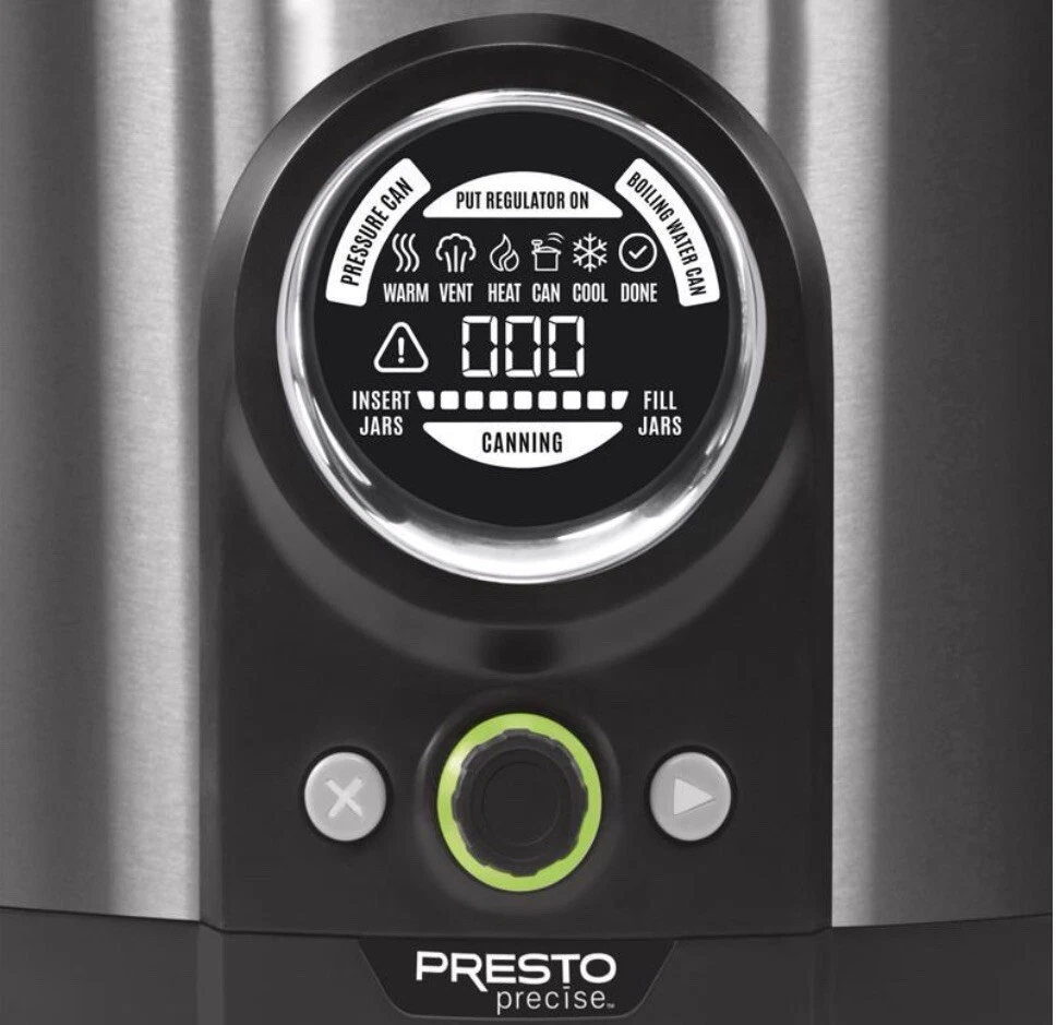 The first digital pressure canner that meets USDA home canning guidelines for safely processing meats, poultry, fish, vegetables and other low acid foods. The first digital pressure canner that meets USDA home canning guidelines for safely processing meats, poultry, fish, vegetables and other low acid foods. Easy-to-use digital display guides you through each step of the canning process. Built-in timer assures accurate, reliable processing. Doubles as a boiling water canner for preserving fruits, jams, jellies, pickles and salsa. Preheats canning jars and keeps them hot until filled and ready to process. Cool and energy efficient. Holds heat inside the canner keeping your kitchen cooler. More efficient than processing on a high wattage burner or gas stove. Plus canned foods are shelf stable, saving freezer space and the energy required by freezers. Just place jars in the pantry until ready to use. Complete instruction/recipe book contains easy-to-follow procedures and recipes using standard processing times in accordance with USDA guidelines. Also includes an easy-to-reference Quickstart Guide. Ten built-in safety features including a cover locking system and an alert symbol that indicates an incomplete canning process. Removable pot with nonstick surface inside and out for easy cleaning Canning rack holds jars off the bottom of the pot while canning Regular mason jar capacity: 10 half-pints, 8 pints or 5 quarts for pressure canning, 10 half-pints and 8 pints for boiling water canning Digital LED display guides you through each step Innovative sensor holds the exact temperature required for safe canning Preheats jars and keeps them hot until filled and ready to process Preheats jars and keeps them hot until each jar is filled Finally, an electric canner that safely processes low-acid foods