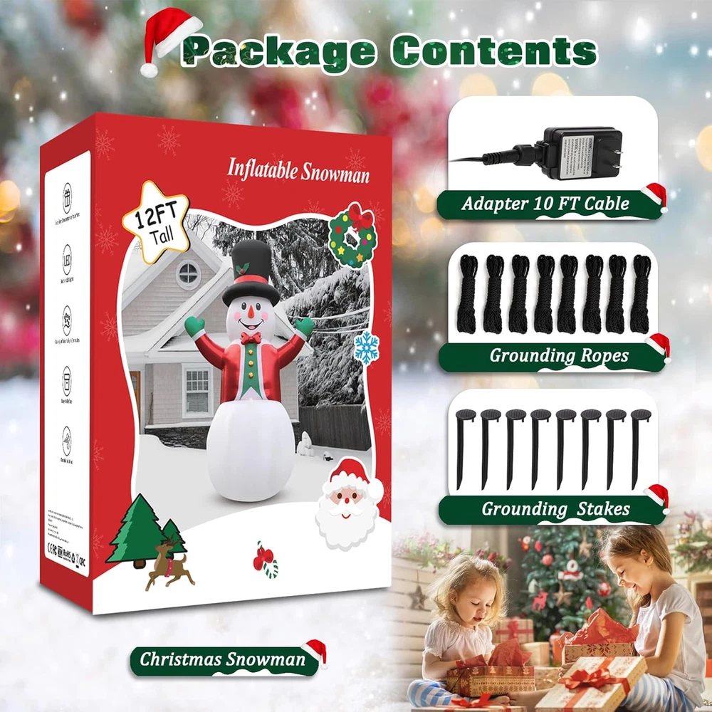 【⛄Giant Christmas Inflatable Snowman⛄】The cute 12FT tall Christmas inflatable snowman wears an adorable top hat and gorgeous red suit, raising both hands with a sweet warm smile to express welcome. It has built-in bright led lights to illuminate your yard lawn garden porch at night. Your friends and neighbors will be attracted by the eye-catching inflatable snowman. It’s one of the ideal choices for Christmas event decorations, Christmas Eve night decorations, Christmas outdoor yard decorations. 【⛄High-Quality Material & Durable⛄】The FunFanso inflatable snowman is made of 190T high-density thickened polyester material, which is IP44 waterproof and snowproof. It resists punctures from sharp or sturdy objects. FunFanso’s excellent sewing process enhances the durability of this outdoor inflatable decoration. What’s more, the vibrant colors won’t fade over time, allowing for repeated use. 【⛄Stable and Secure Enough⛄】This giant inflatable snowman is equipped with 8 ground stakes, 8 ropes to keep it fixed firmly from being blown away by wind, and built-in heavy sandbags for bottom fixed without support when there is no wind. This greatly improves the stability of this inflatables snowman, which is designed to withstand unpredictable weather easily. 【⛄Stable and Secure Enough⛄】This giant inflatable snowman is equipped with 8 ground stakes, 8 ropes to keep it fixed firmly from being blown away by wind, and built-in heavy sandbags for bottom fixed without support when there is no wind. This greatly improves the stability of this inflatables snowman, which is designed to withstand unpredictable weather easily. 【⛄Ideal Christmas Gift⛄】Each FunFanso Christmas inflatable decoration is packaged in a beautiful gift box, making it as a thoughtful Xmas present for our loved ones. FunFanso Christmas inflatables are certified by FCC and CPC, and the motor is certified by ETL. This adorable inflatable snowman will be a safe and delightful gift for everyone. Product description